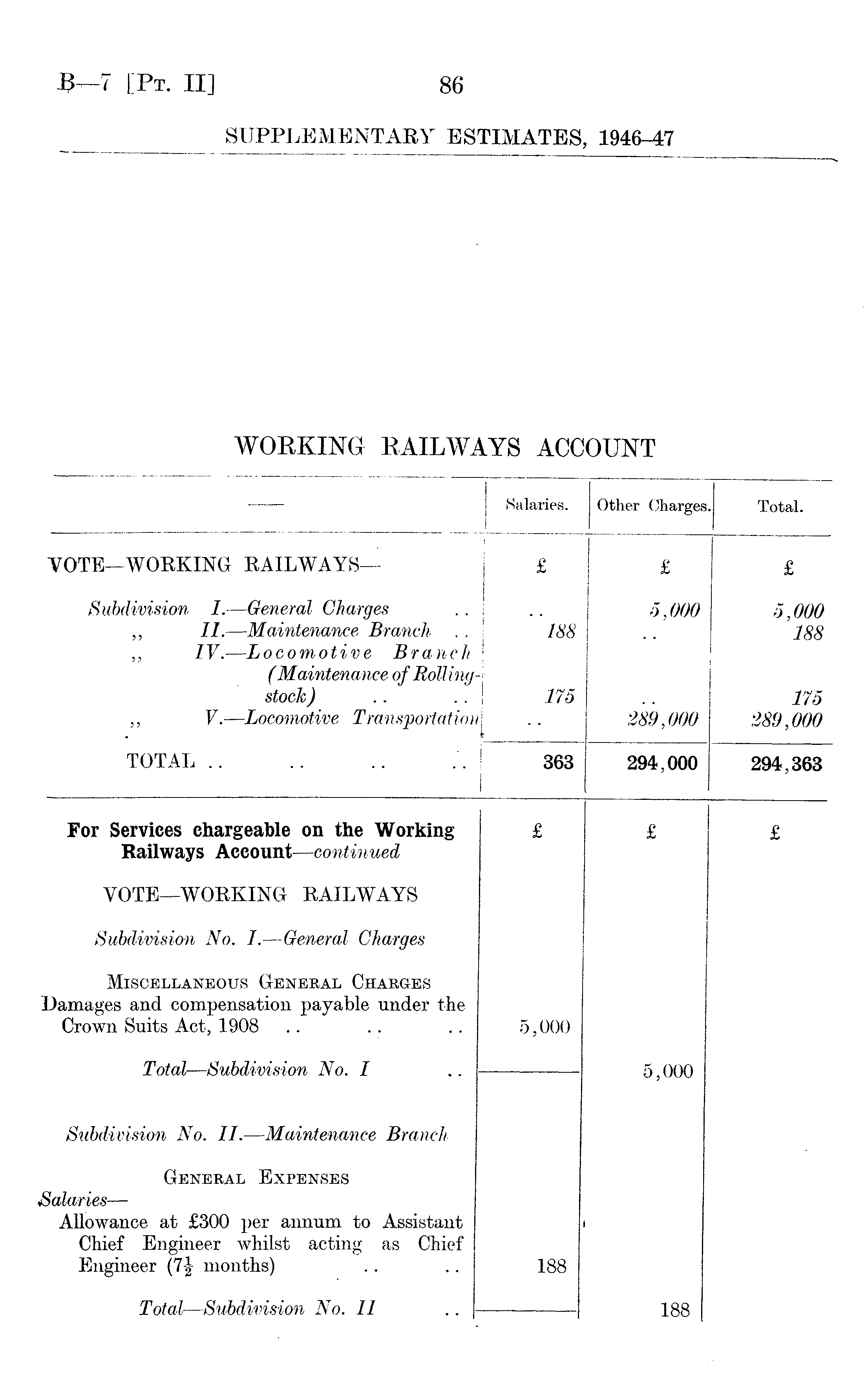 — Salaries. Other Charges Total. VOTE—WORKING RAILWAYS— £ £ £ Subdivision I. — General Charges ,, II. — Maintenance Branch . . „ IV. — Locomotive Branch (Maintenance of Rollingstock) ,, V. — Locomotive Transportation 188 175 1 5,000 289,000 5,000 188 175 289,000 TOTAL .. 363 294,000 294,363 For Services chargeable on the Working Railways Account — continued £ £ £ VOTE—WORKING RAILWAYS Subdivision No. I. — General Charges Miscellaneous General Charges Damages and compensation payable under the Crown Suits Act, 1908 .. 5,000 5,000 Subdivision No. II. — Maintenance Branch General Expenses Salaries — Allowance at £300 per annum to Assistant Chief Engineer whilst acting as Chief Engineer (7-|- months) 188 » Total — Subdivision No. II .. - 188
