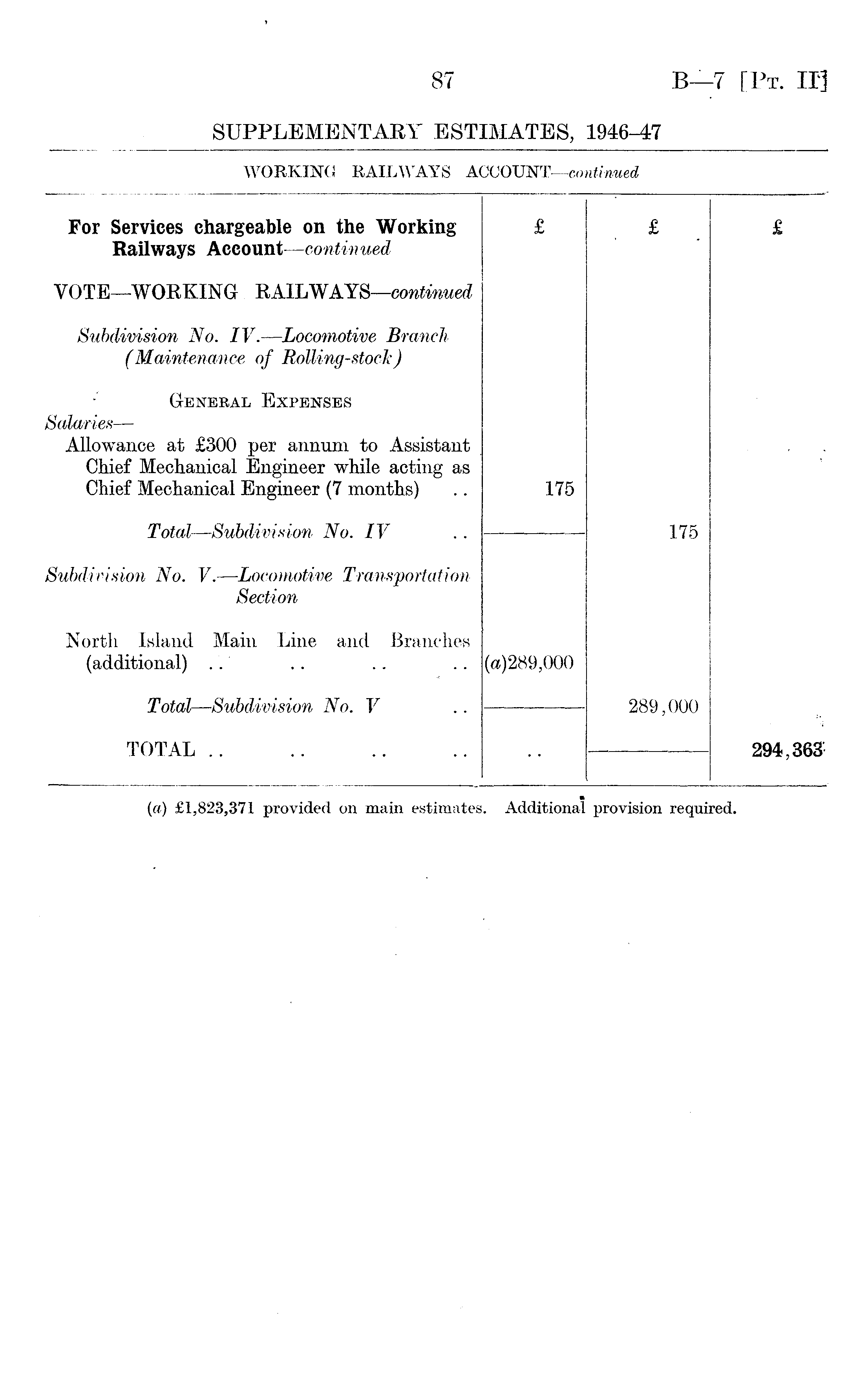 For Services chargeable on the Working Railways Account — continued £ £ £ VOTE—WORKING RAILWAYS— continued Subdivision No. IV. — Locomotive Branch (Maintenance of Rolling - stock) General Expenses Salaries — Allowance at £300 per annum to Assistant Chief Mechanical Engineer while acting as Chief Mechanical Engineer (7 months) 175 Total — Subdivision No. IV Subdivision No. V. — Locomotive Transportation Section 175 North Island Main line ami Branches (additional) (a)289,000 Total — Subd/ivision No. V 289,000 TOTAL .. 294,363