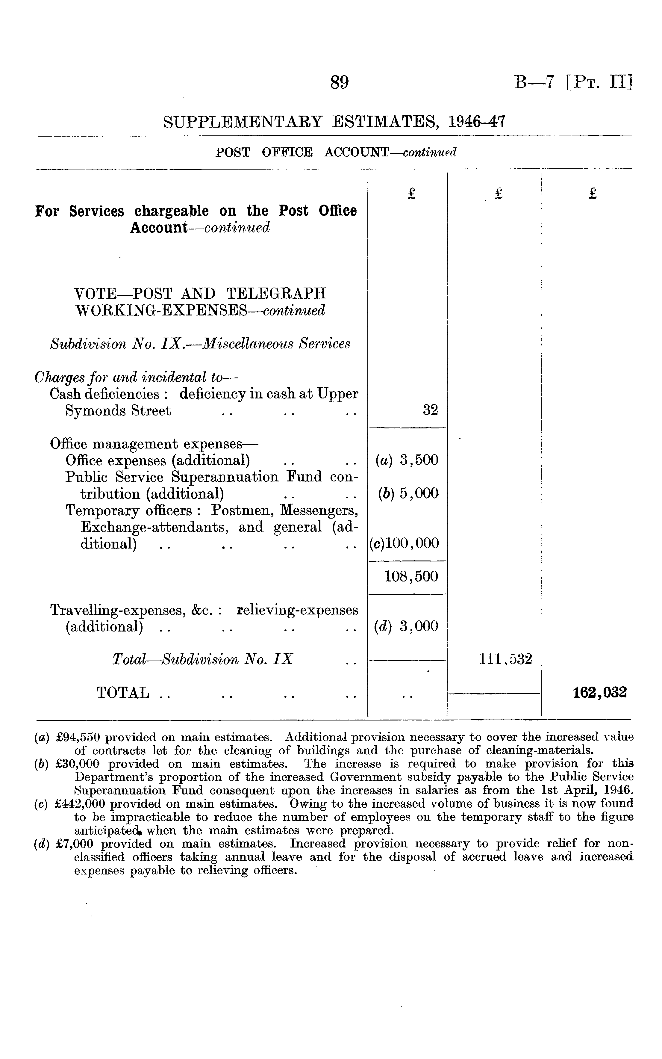 (a) £94,550 provided on main estimates. Additional provision necessary to cover the increased value of contracts let for the cleaning of buildings and the purchase of cleaning-materials. (b) £30,000 provided on main estimates. The increase is required to make provision for this Department's proportion of the increased Government subsidy payable to the Public Service Superannuation Fund consequent upon the increases in salaries as from the Ist April, 1946. (c) £442,000 provided on main estimates. Owing to the increased volume of business it is now found to be impracticable to reduce the number of employees on the temporary staff to the figure anticipated* when the main estimates were prepared. (d) £7,000 provided on main estimates. Increased provision necessary to provide relief for nonclassified officers taking annual leave and for the disposal of accrued leave and increased expenses payable to relieving officers.