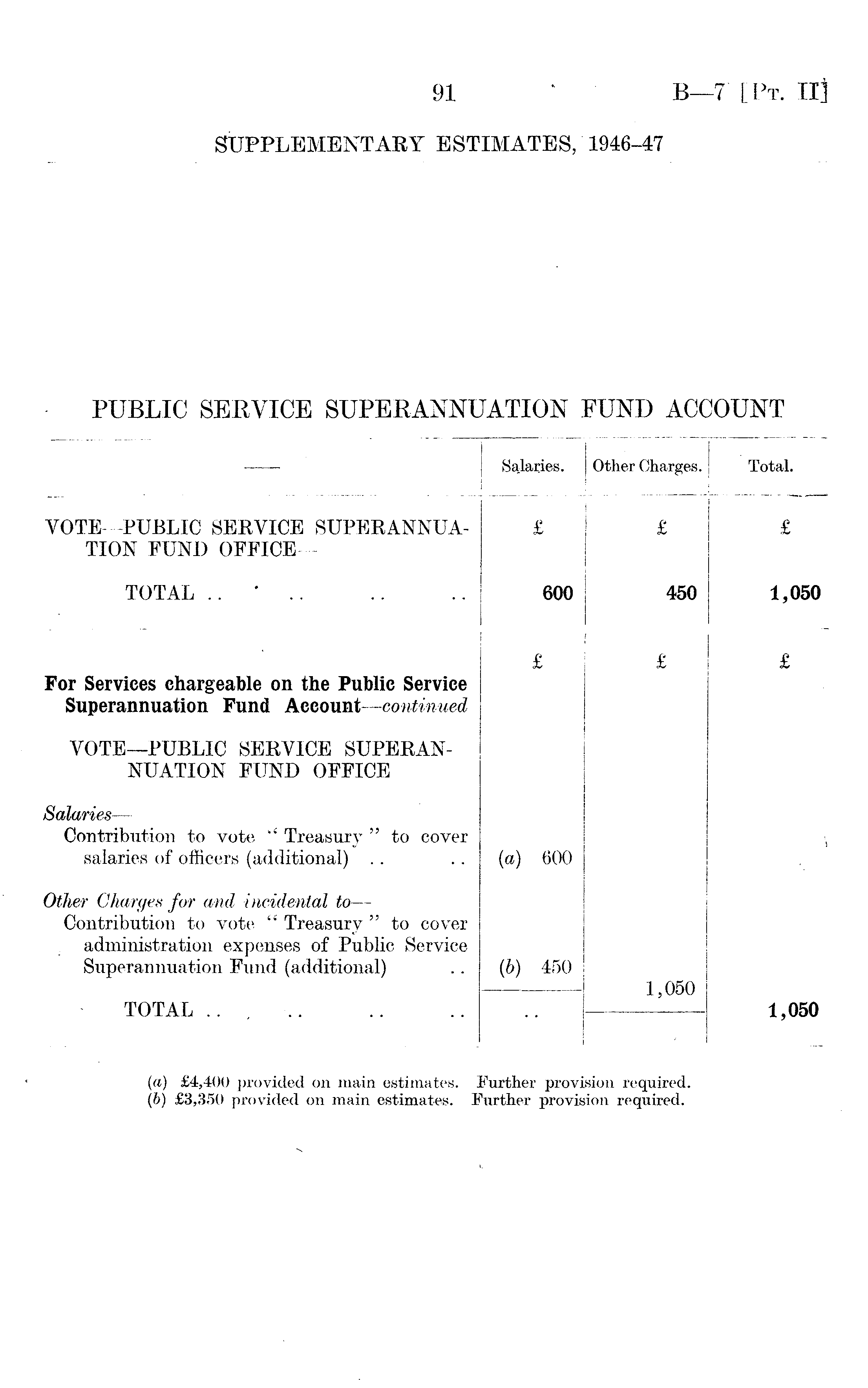 — Salaries. Other Charges. Total. VOTE PUBLIC SERVICE SUPERANNUATION FUND OFFICE £ £ £ TOTAL .. ' .. 600 450 1,050 For Services chargeable on the Public Service Superannuation Fund Account — continued £ £ £ VOTE—PUBLIC SERVICE SUPERANNUATION FUND OFFICE Salaries — Contribution to vote. " Treasury " to cover salaries of officers (additional) (a) 600 i Other Charges for and incidental to — Contribution to vote " Treasury " to cover administration expenses of Public Service Superannuation Fund (additional) (6) 450 1,050 TOTAL 1,050