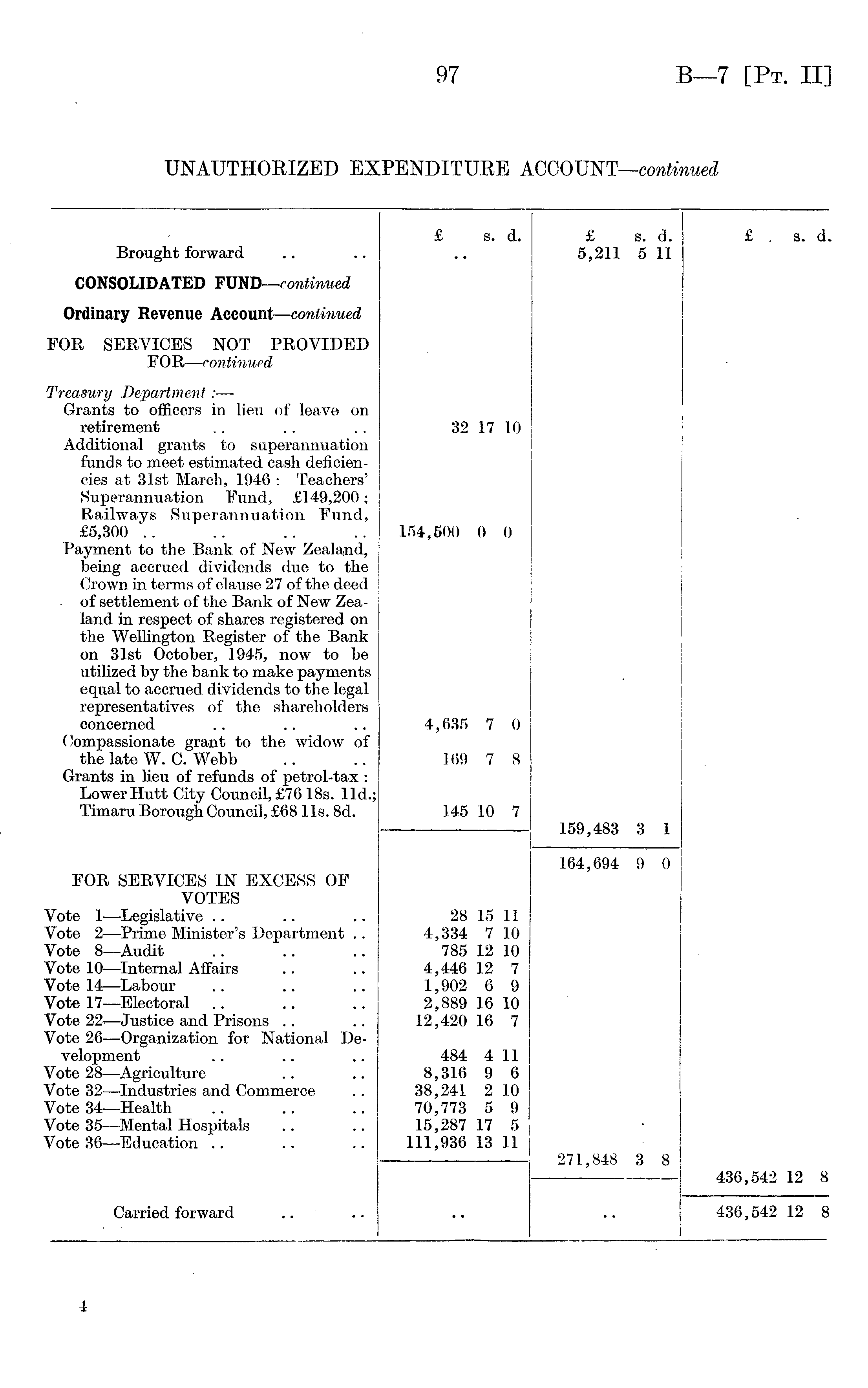 £ s. d. £ s. d. £ . s. d. Brought forward •• 5,211 5 11 CONSOLIDATED FUND— continued Ordinary Revenue Account — continued FOR SERVICES NOT PROVIDEI ) FOR — continued Treasury Department: — Grants to officers in lieu of leave 01 l retirement 32 17 10 Additional grants to superannuate i funds to meet estimated cash defioien cies at 31st March, 1946 : Teachers ' Superannuation Fund, £149,200 Railways Superannuation Fund , . £5,300 154,500 0 0 Payment to the Bank of New Zealand 9 being accrued dividends due to tin 5 Crown in terms of clause 27 of the deec I of settlement of the Bank of New Zea land in respect of shares registered oi l the Wellington Register of the Ban] <L on 31st October, 1945, now to b< utilized by the bank to make payment S equal to accrued dividends to the lega 1 representatives of the shareholder 3 concerned 4,635 7 0 (Jompassionate grant to the widow o f the late W. C. Webb .169 7 8 Grants in lieu of refunds of petrol-tax Lower Hutt City Council, £76 18s. lie u Timaru Borough Council, £68 1 Is. 8d. 145 10 7 159,483 3 1 164,694 9 0 FOR SERVICES IN EXCESS OF VOTES Vote 1—Legislative 28 15 11 Vote 2—Prime Minister's Department . 4,334 7 10 Vote 8—Audit 785 12 10 Vote 10—Internal Affairs 4,446 12 7 Vote 14—Labour 1,902 6 9 Vote 17—Electoral 2,889 16 10 Vote 22'—Justice and Prisons .. 12,420 16 7 Vote 26—Organization for National De velopment 484 4 11 Vote 28—Agriculture 8,316 9 6 Vote 32—Industries and Commerce 38,241 2 10 Vote 34—Health 70,773 5 9 Vote 35—Mental Hospitals 15,287 17 5 Vote 36—Education 111,936 13 11 271,848 3 8 • • 436 19 S •• tOUjJtj J. +-> O Carried forward 436,542 12 8