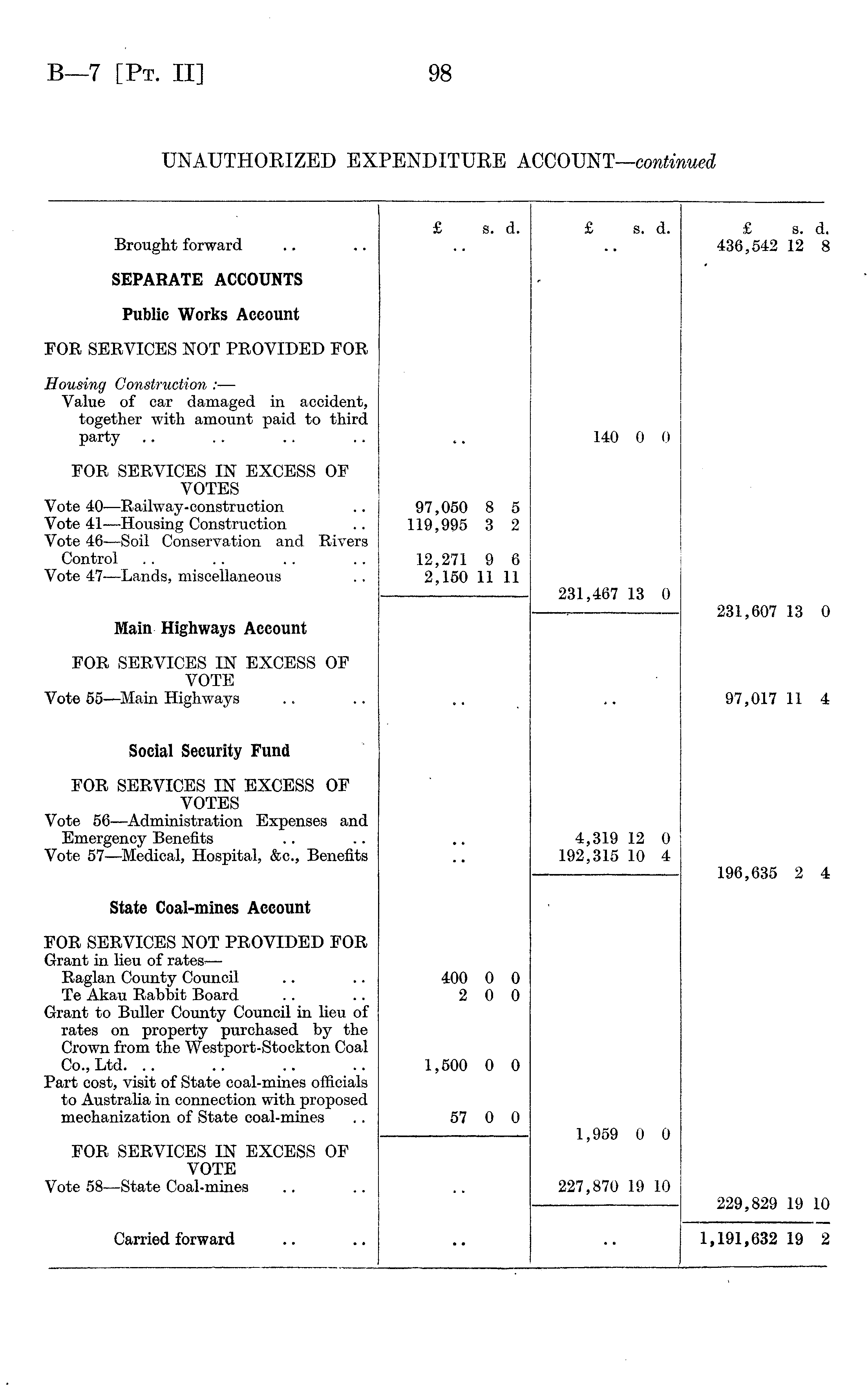 Brought forward £ s. d. £ s. d. £ s. 436,542 12 d. 8 SEPARATE ACCOUNTS • Public Works Account FOR SERVICES NOT PROVIDED FOR Housing Construction : — Value of car damaged in accident, together with amount paid to third party 140 0 0 FOR SERVICES IN EXCESS OF VOTES Vote 40—Railway-construction Vote 41—Housing Construction Vote 46—Soil Conservation and Rivers Control Vote 47 —Lands, miscellaneous 97,050 119,995 12,271 2,150 8 5 3 2 9 6 11 11 231,467 13 0 231,607 13 0 Main Highways Account FOR SERVICES IN EXCESS OF VOTE Vote 55 —Main Highways 97,017 11 4 Social Security Fund FOR SERVICES IN EXCESS OF VOTES Vote 56—Administration Expenses and Emergency Benefits Vote 57—Medical, Hospital, &c, Benefits 4,319 12 0 192,315 10 4 196,635 2 4 State Coal-mines Account FOR SERVICES NOT PROVIDED FOR Grant in lieu of rates^— Raglan County Council Te Akau Rabbit Board Grant to Buller County Council in lieu of rates on property purchased by the Crown from the Westport-Stockton Coal Co., Ltd. .. Part cost, visit of State coal-mines officials to Australia in connection with proposed mechanization of State coal-mines 400 2 1,500 57 0 0 0 0 0 0 0 0 1,959 0 0 227,870 19 10 229,829 19 FOR SERVICES IN EXCESS OF VOTE Vote 58—State Coal-mines 10 Carried forward 1,191,632 19 2