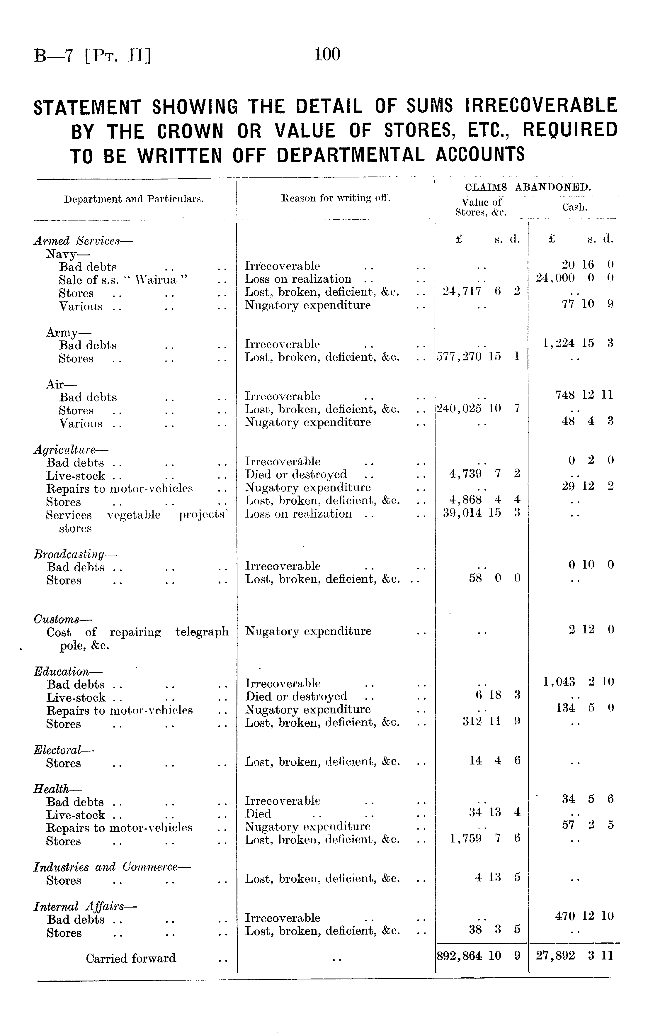 Iteason for writing off'. CLAIMS ABANDONED. Department and Particulars. Value of Stores, &c. Cash. Armed Services —■ Navy— Bad debts Sale of s.s. " Wairua " Stores Various Irrecoverable Loss on realization Lost, broken, deficient, &c. Nugatory expenditure £ s. 24,717 6 d. 2 £ s. d. 20 16 0 24,000 0 0 77 10 9 Army—■ Bad debts Stores Irrecoverable Lost, broken, deficient, &e. 577,270 15 1 1,224 15 3 Air— Bad debts Stores Various Irrecoverable Lost, broken, deficient, &c. Nugatory expenditure 240,025 10 7 748 12 11 48 4 3 Agriculture — Bad debts Live-stock Repairs to motor-vehicles Stores Services vegetable projects' stores Irrecoverable Died or destroyed Nugatory expenditure Lost, broken, deficient, &c. Loss on realization 4,739 7 4,868 4 39,014 15 2 4 3 0 2 0 29 12 2 Broadcasting — Bad debts Stores Irrecoverable Lost, broken, deficient, &e. .. 58* 0 0 0 10 0 Customs — Cost of repairing telegraph pole, &c. Nugatory expenditure 2 12 0 Education — Bad debts Live-stock Repairs to motor-vehicles Stores Irrecoverable Died or destroyed Nugatory expenditure Lost, broken, deficient, &c. 6 18 312 11 3 i) 1,043 2 10 134 5 0 Electoral — Stores Lost, broken, deficient, &c. 14 4 6 Health — Bad debts Live-stock Repairs to motor-vehicles Stores Irrecoverable Died Nugatory expenditure Lost, broken, deficient, &c. 34 13 1,759 7 4 6 34 5 6 57 2 5 Industries and Commerce — Stores Lost, broken, deficient, &c. 4 13 5 • • Internal Affairs — Bad debts Stores Irrecoverable Lost, broken, deficient, &c. 38 3 5 470 12 10 Carried forward 892,864 10 9 27,892 3 11