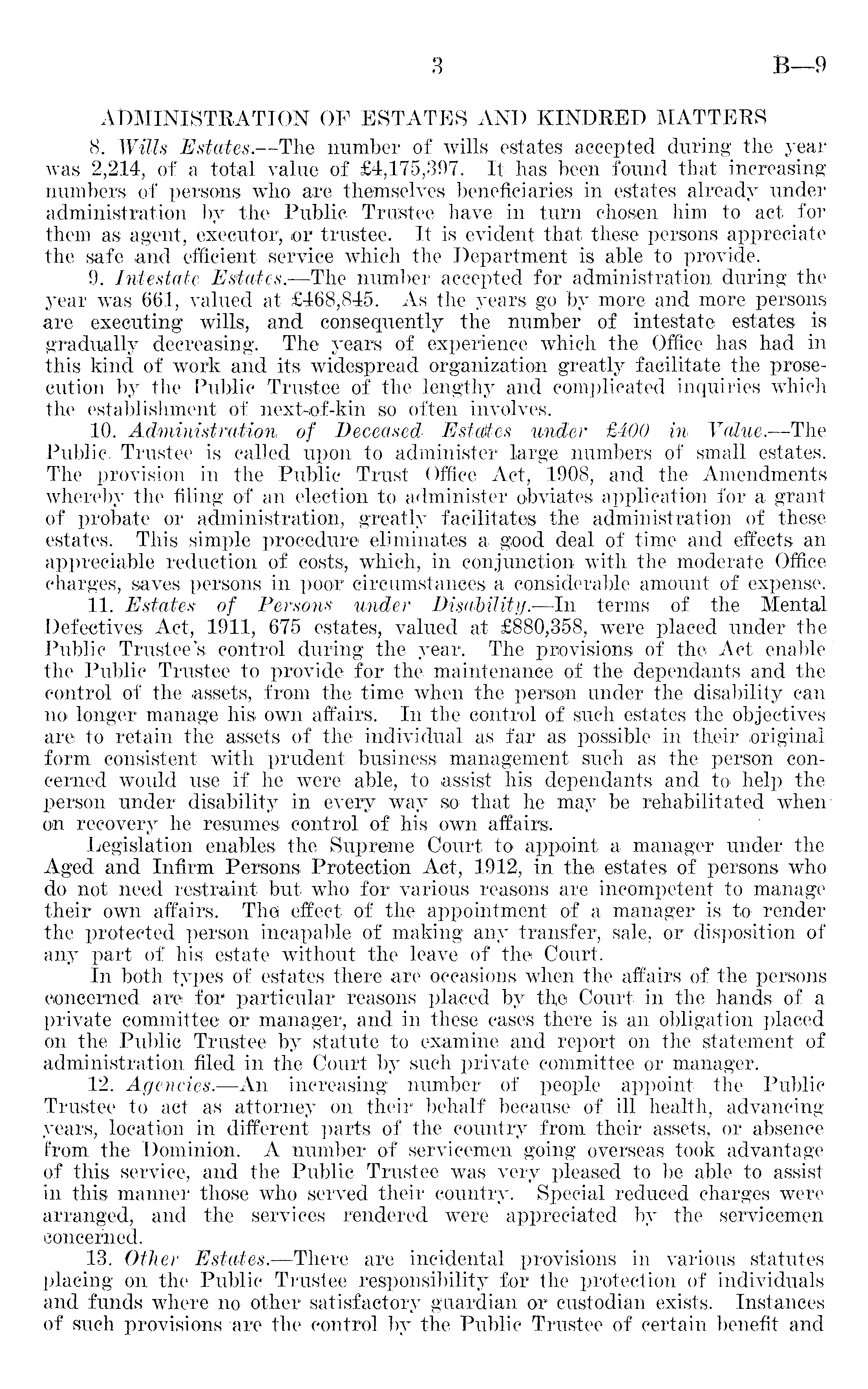 ADMINISTRATION OF ESTATES AND KINDRED MATTERS 8. Wills Estates. —The number of wills estates accepted during the year was 2,214, of a total value of £4,175,397. It has been found that increasing numbers of persons who are themselves beneficiaries in estates already under administration by the Public Trustee have in turn chosen him to act for them as agent, executor, or trustee. It is evident that these persons appreciate the safe and efficient service which the Department is able to provide. 9. Intestate Estates. —The number accepted for administration during the year was 661, valued at £468,845. As the years go by more and more persons are executing wills, and consequently the number of intestate estates is gradually decreasing. The years of experience which the Office has had in this kind of work and its widespread organization greatly facilitate the prosecution by the Public Trustee of the lengthy and complicated inquiries which the establishment of next-of-kin so often involves. 10. Administration, of Deceased Estaites under £4OO in Value. —The Public. Trustee is called upon to administer large numbers of small estates. The provision in the Public Trust Office Act, 1908, and the Amendments whereby the filing of an election to administer obviates application for a grant of probate or administration, greatly facilitates the administration of these estates. This simple procedure eliminates a good deal of time and effects an appreciable reduction of costs, which, in conjunction with the moderate Office charges, saves persons in poor circumstances a considerable amount of expense. 11. Estates of Persons under Disability. —ln terms of the Mental Defectives Act, 1911, 675 estates, valued at £880,358, were placed under the Public Trustee's control during the year. The provisions of the Act enable the Public Trustee to provide for the maintenance of the dependants and the control of the assets, from the time when the person under the disability can no longer manage his own affairs, In the control of such estates the objectives are to retain the assets of the individual as far as possible in their original form consistent with prudent business management such as the person concerned would use if he were able, to assist his dependants and to help the person under disability in every way so that he may be rehabilitated when on recovery he resumes control of his own affairs. Legislation enables the Supreme Court to appoint a manager under the Aged and Infirm Persons Protection Act, 1912, in the estates of persons who do not need restraint but who for various reasons are incompetent to manage their own affairs. The effect of the appointment of a manager is to render the protected person incapable of making any transfer, sale, or disposition of any part of his estate without the leave of the Court. In both types of estates there are occasions when the affairs of the persons concerned, are for particular reasons placed by the Court in the hands of a private committee or manager, and in these cases there is an obligation placed on the Public Trustee by statute to examine and report on the statement of administration filed in the Court by such private committee or manager. 12. Agencies. —An increasing number of people appoint the Public Trustee to act as attorney on their behalf because of ill health, advancing years, location in different parts of the country from their assets, or absence from the Dominion. A number of servicemen going overseas took advantage of this service, and the Public Trustee was very pleased to be able to assist in this manner those who served their country. Special reduced charges were arranged, and the services rendered were appreciated by the servicemen concerned. 13. Other Estates. —There are incidental provisions in various statutes placing on the Public Trustee responsibility for the protection of individuals and funds where no other satisfactory guardian or custodian exists. Instances of such provisions are the control by the Public Trustee of certain benefit and
