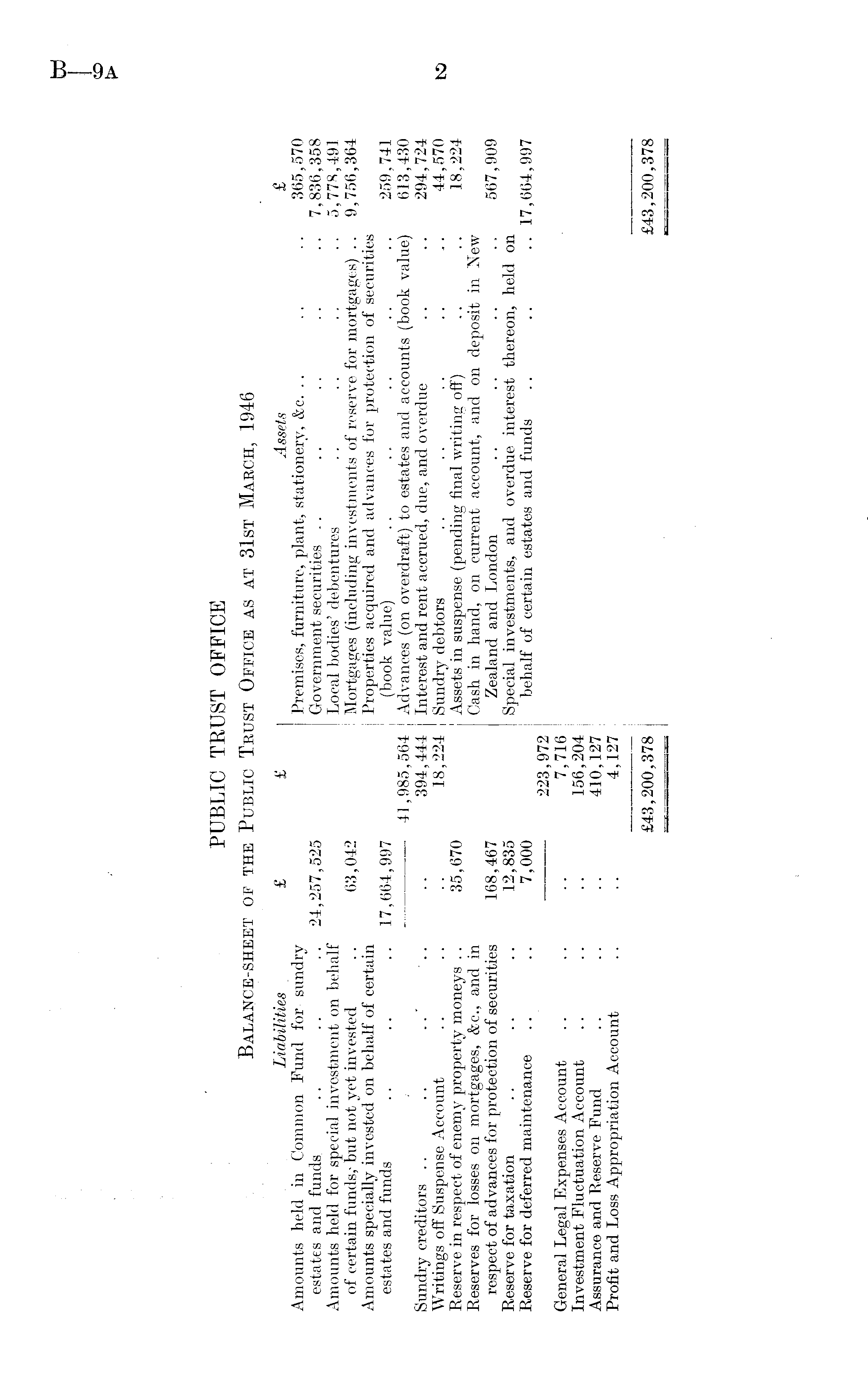 PUBLIC TRUST OFFICE Balance-sheet of the Public Trust Office as at 31st March, 1946 Liabilities £ £ Assets £ Amounts held in Common Fund for sundry Premises, furniture, plant, stationery, &c. .. .. .. 365,570 estates and funds. .. .. .. 24,257,525 Government securities .. .. .. .. .. 7,836,358 Amounts held for special investment on behalf Local bodies' debentures . . .. .. . . 5,778,491 of certain funds,- but not yet invested .. 63,042 Mortgages (including investments of reserve for mortgages) .. 9,756,364 Amounts specially invested on behalf of certain Properties acquired and advances for protection of securities. estates and funds . . .. .. 17,664,997 (book value) .. .. .. .. .. 259,741 , : 41,985,564 Advances (on overdraft) to estates and accounts (book value) 613,430 Sundry creditors .. .. .. 394,444 Interest and rent accrued, due, and overdue .. .. 294,724 Writings off Suspense Account .. .. .. 18,224 Sundry debtors .. .. .. .. .. 44,570 Reserve in respect of enemy property moneys .. 35,670 Assets in suspense (pending final writing off) .. .. 18,224 Reserves for losses on mortgages, &c., and in Cash in hand, on current account, and on deposit in New' respect of advances for protection of securities 168,467 Zealand and London .. .. .. .. 567,909 Reserve for taxation .. .. .. 12,835 Special investments, and overdue interest thereon, held on Reserve for deferred maintenance .. .. 7,000 behalf of certain estates and funds .. .. .. 17,664,997 223,972 General Legal Expenses Account ...... 7,716 Investment Fluctuation Account .. .. .. 156,204 Assurance and Reserve Fund .. .. .. 410, 127 Profit and Loss Appropriation Account .. .. 4,127 i £43,200,378 £43,200,378