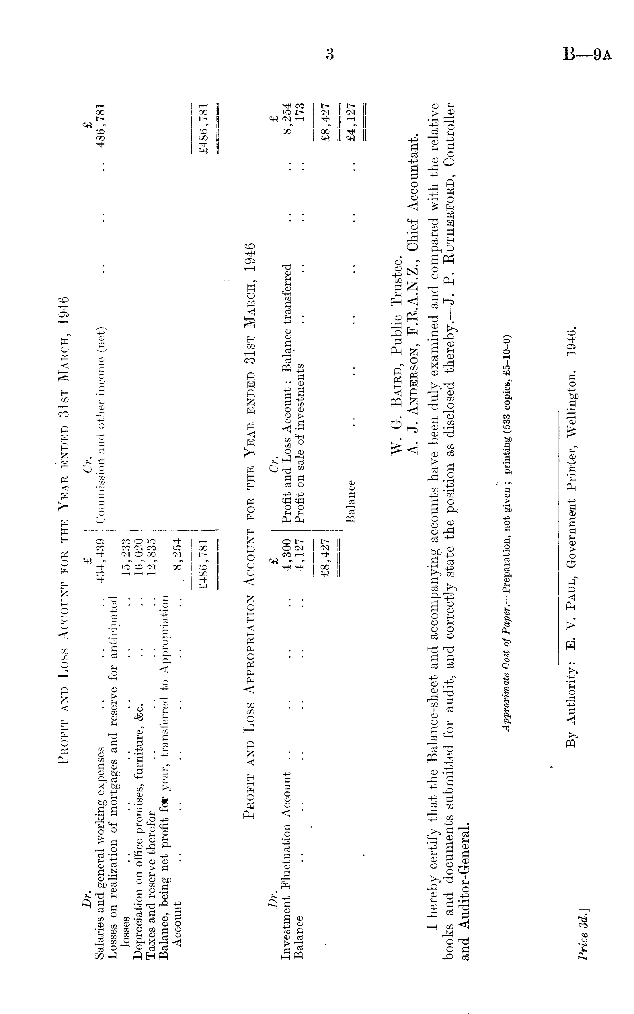 Profit and Loss Account for the Year ended 31st March, 1946 Dr. £ Cr. £ Salaries and general working expenses .. .. .. 434,439 Commission and other income (net) .. .. .. 486,781 Losses on realization of mortgages and reserve for anticipated losses .. .. .. .. . . .. 15,233 Depreciation on office premises, furniture, &c. .. .. 16,020 Taxes and reserve therefor .. .. .. 12,835 Balance, being net profit fat year, transferred to Appropriation Account .. .. .. .. .. .. 8,254 £486,781 £486,781 I Profit and Loss Appropriation Account for the Year ended 31st March, 1946 Dr. £ Cr. £ Investment Fluctuation Account .. .. .. .. 4,300 Profit and Loss Account: Balance transferred .. .. 8,254 Balance .. .. .. .. .. .. 4,127 Profit on sale of investments .. .. .. .. 173 £8,427 £8,427 Balance .. .. .. .. .. .. £4,127 W. G. Baird, Public Trustee. A. J. Anderson, F.R.A.N.Z., Chief Accountant. I hereby certify that the Balance-sheet and accompanying accounts have been duly examined and compared with the relative books and documents submitted for audit, and correctly state the position as disclosed thereby.— J. P. Rutherford, Controller and Auditor-General. Approximate Cost of Paper.—Preparation, not given ; printing (533 copies, £5-10-0)