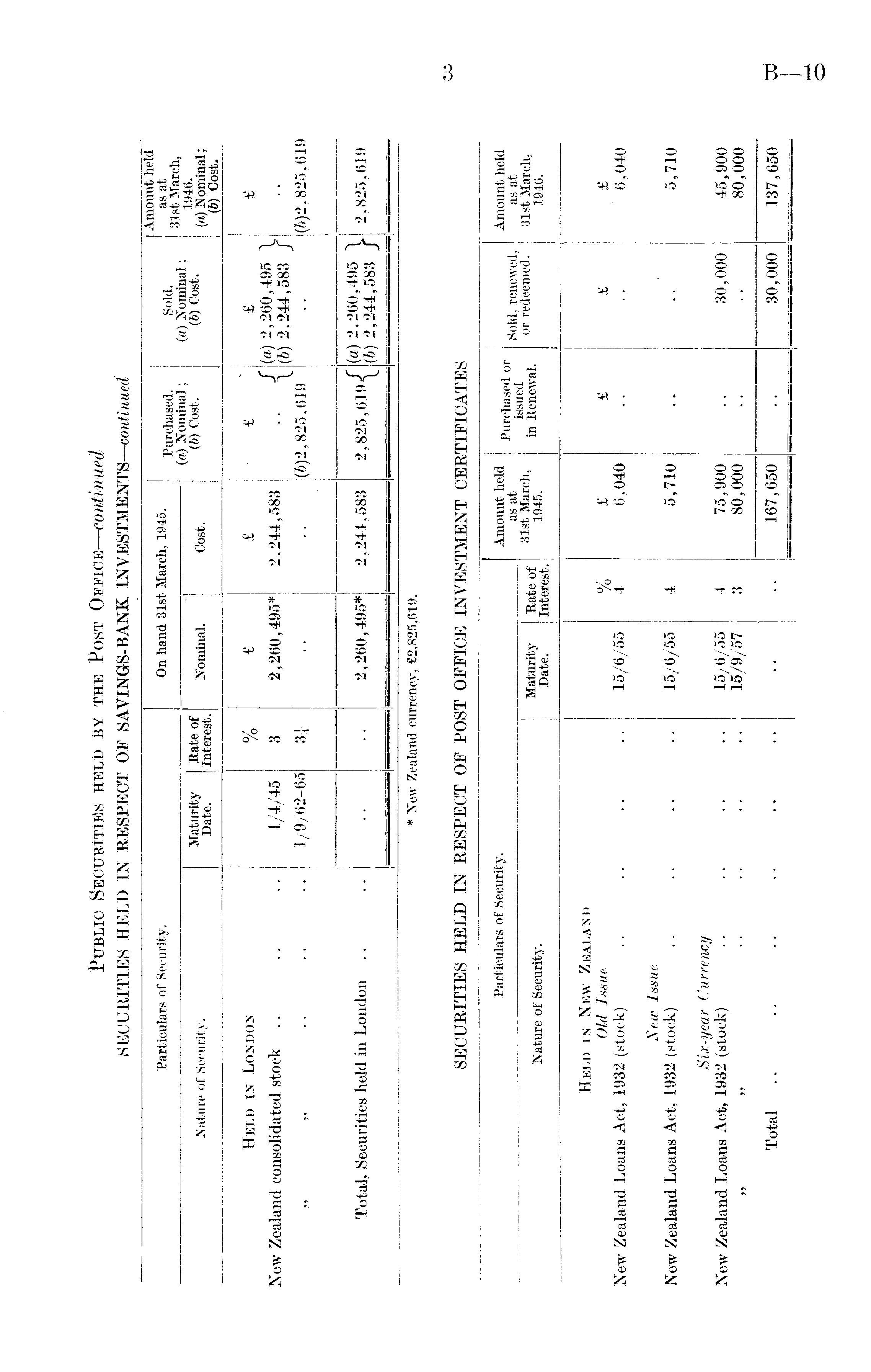 Particulars of Security. On hand 31st March, 1945. Purchased. (a) Nominal; (b) Cost. Sold. (a) Nominal; (b) Cost. Amount held as at 31st March, Nature of Security. Maturity Date. Bate of Interest. Nominal. Cost. 1946. (a) Nomiaal; (b) Cost. Held in London New Zealand consolidated stock 1/4/45 1/9/62-65 % 3 3i £ 2,260,495* £ 2,244,583 £ • { (6)2,825,619 £ (а) 2,260,495 \ (б) 2,244,583 / £ (6)2,825,619 Total, Securities held in London .. 2,260,495* , 2,244,583 2,825,619=^ (a) 2,260,495 \ (b) 2,244,583 / 2,825,619 * New Zealand currency, £2,825,619.