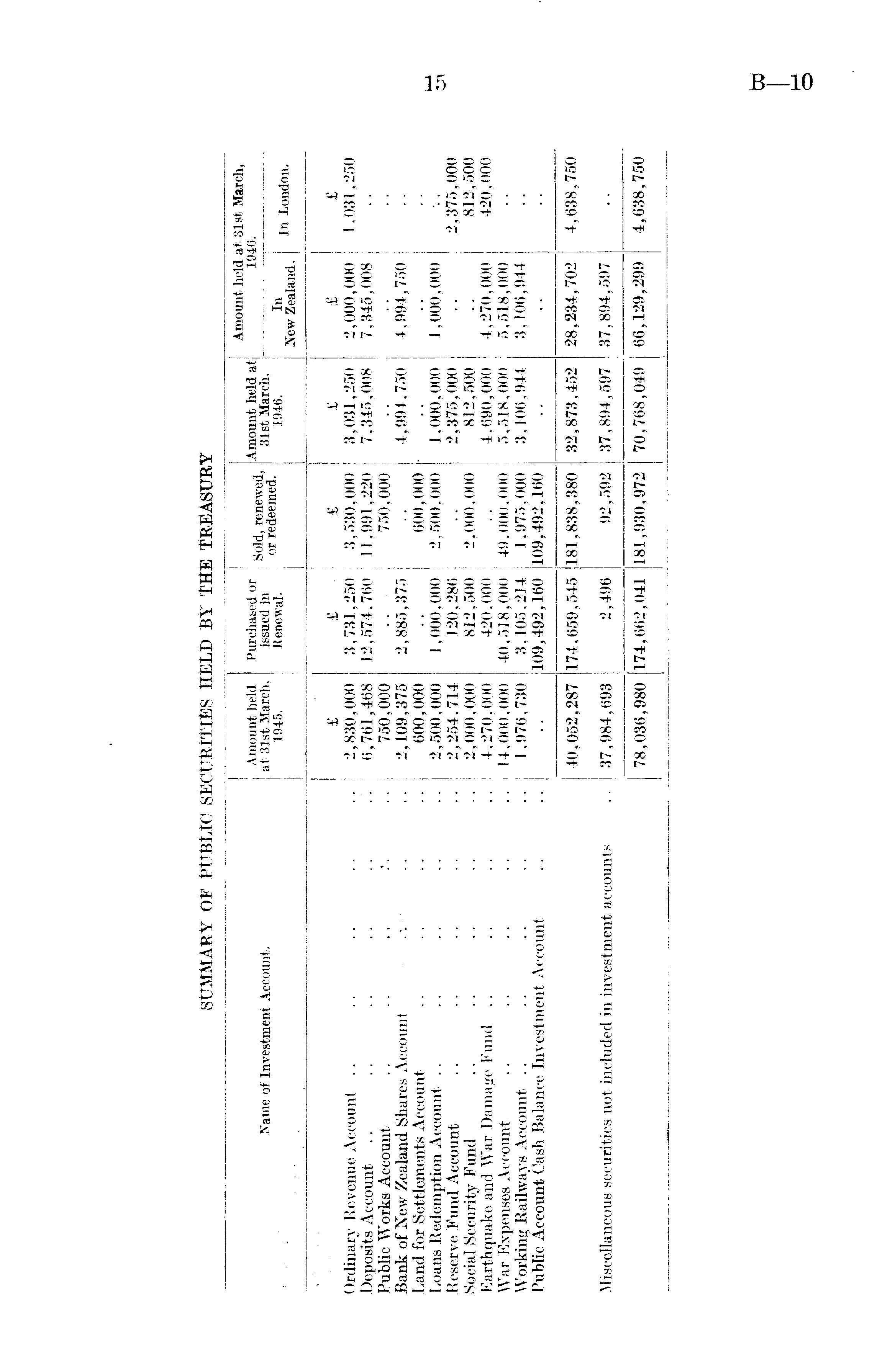 \ Natne of Investment Account. Amount held at 31st March, 1945. Purchased or issued in Renewal. Sold, renewed, or redeemed. Amount held at 31st March, 1946. Amount held at. 31st March, 1946. In New Zealand. In London. Ordinary Revenue Account .. .. Deposits Account Public Works Account Bank of New Zealand Shares Account Land for Settlements Account Loans Redemption Account Reserve Fund Account Social Security Fund Earthquake and War Damage Fund War Expenses Account Working Railways Account Public Account Cash Balance Investment Account Miscellaneous securities not included in investment accounts £ 2,830,000 6,761,468 750,000 2,109,375 600,000 2,500,000 2,254,714 2,000,000 4,270,000 14,000,000 1,976,730 £ 3,731,250 12,574,760 2,885,375 1,000,000 120,286 812,500 420,000 40,518,000 3,105,214 109,492,160 £ 3,530,000 11,991,220 750,000 600,000 2,500,000 2,000,000 49,000,000 1,975,000 109,492,160 £ 3,031,250 7,345,008 4,994,750 1,000,000 2,375,000 812,500 4,690,000 5,518,000 3,106,944 £ 2,000,000 7,345,008 4,994,750 1,000,000 4,270,000 5,518,000 3,106,944 £ 1,031,250 2,375,000 812,500 420,000 40,052,287 37,984,693 174,659,545 2,496 181,838,380 92,592 32,873,452 37,894,597 28,234,702 37,894,597 4,638,750 78,036,980 174,662,041 181,930,972 70,768,049 66,129,299 4,638,750