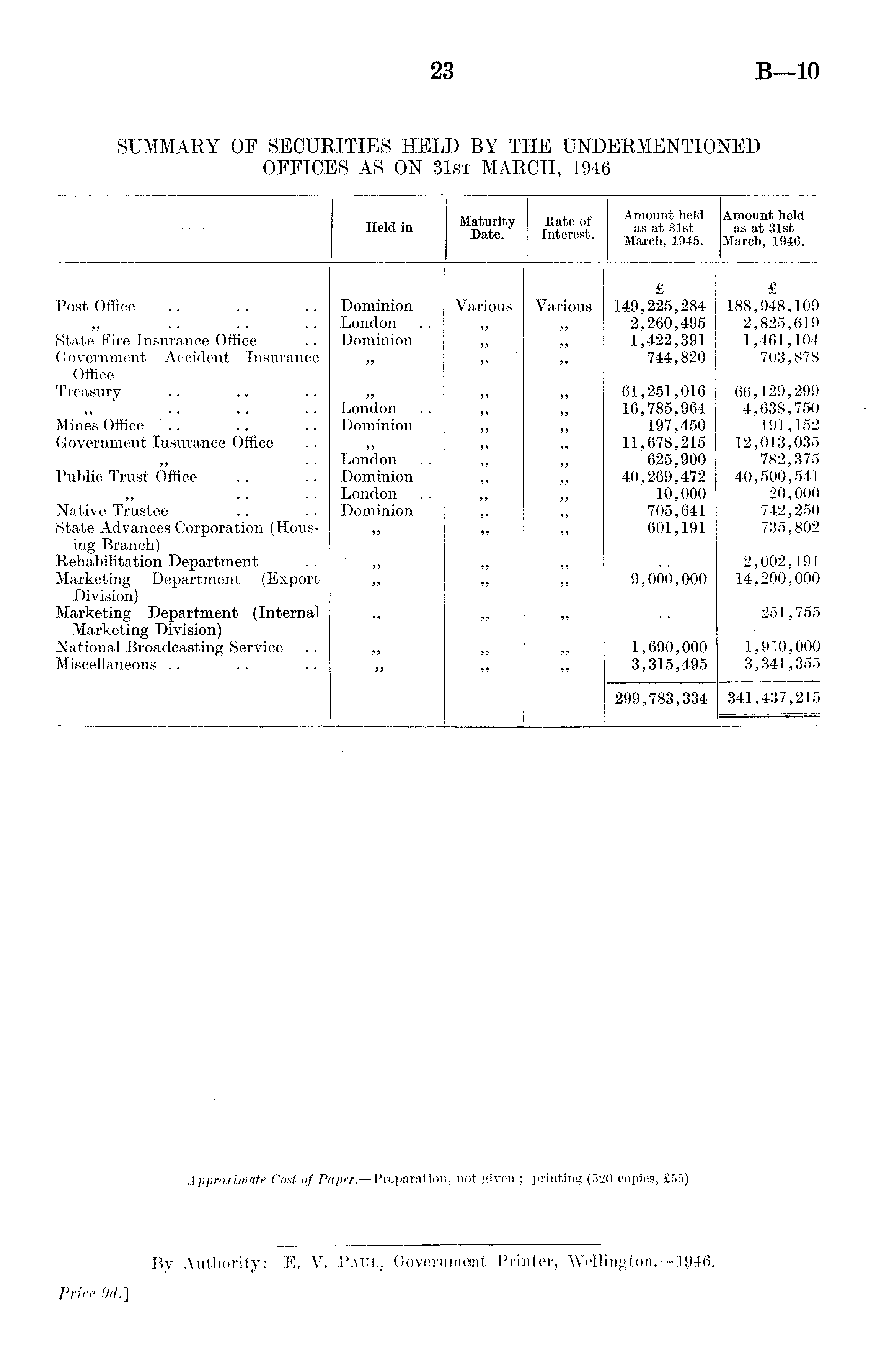 —- Held in Maturity Date. Rate of Interest. Amount held as at 31st March, 1945. Amount held as at 31st March, 1946. £ £ Post Office Dominion London Various 99 Various 99 149,225,284 2,260,495 188,948,109 2,825,619 State Fire Insurance Office Dominion 99 99 1,422,391 1,461,104 Government Accident Insurance 99 99 744,820 703,878 Office Treasury .. „ 99 99 61,251,016 66,129,299 Mines Office London 99 99 16,785,964 4,638,750 Dominion 99 99 197,450 191,152 Government Insurance Office London 99 9 9 99 99 11,678,215 625,900 12,013,035 782,375 Public Trust Office Dominion London 99 99 99 99 40,269,472 10,000 40,500,541 20,000 Native Trustee Dominion 99 99 705,641 742,250 State Advances Corporation (Hous- „ 99 99 601,191 735,802 ing Branch) Rehabilitation Department 99 99 2,002,191 Marketing Department (Export 99 99 9,000,000 14,200,000 Division) Marketing Department (Internal 99 99 251,755 Marketing Division) National Broadcasting Service 99 99 99 1,690,000 1,930,000 Miscellaneous » 99 99 3,315,495 3,341,355 299,783,334 341,437,215 1