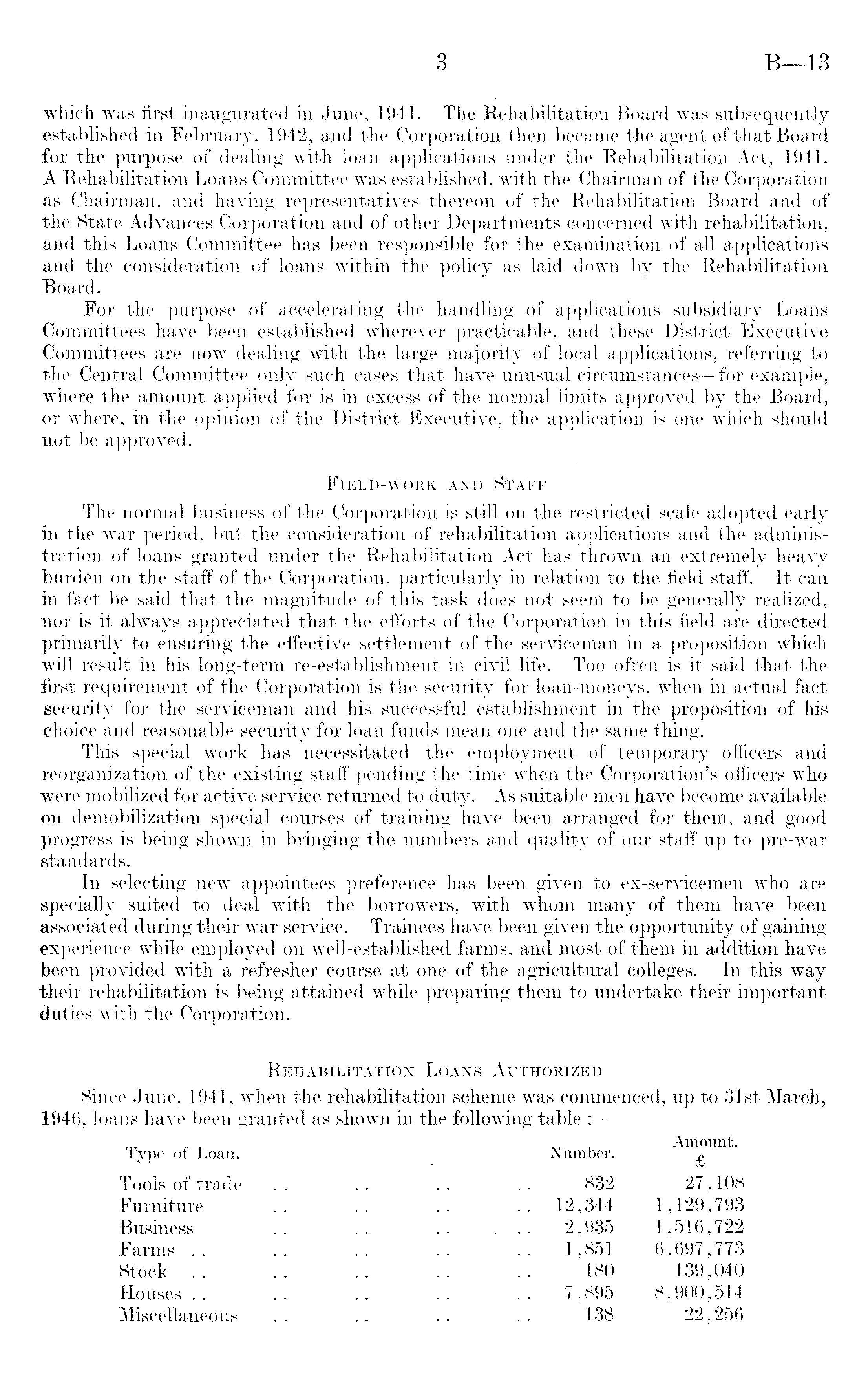 which was first inaugurated in June, 1941. The Rehabilitation Board was subsequently established in February, 1942, and the Corporation then became the agent of that Board for the purpose of dealing with loan applications under the Rehabilitation Act, 1941. A Rehabilitation Loans Committee was established, with the Chairman of the Corporation as Chairman, and having representatives thereon of the Rehabilitation Board and of the State Advances Corporation and of other Departments concerned with rehabilitation, and this Loans Committee has been responsible for the examination of all applications and the consideration of loans within the policy as laid down by the Rehabilitation Board. For the purpose of accelerating the handling of applications subsidiary Loans Committees have been established wherever practicable, and these District Executive Committees are now dealing with the large majority of local applications, referring to the Central Committee only such cases that have unusual circumstances —for example, where the amount applied for is in excess of the normal limits approved by the Board, or where, in the opinion of the District Executive, the application is one which should not be approved. Field-work and Staff The normal business of the Corporation is still on the restricted scale adopted early in the war period, but the consideration of rehabilitation applications and the administration of loans granted under the Rehabilitation Act has thrown an extremely heavy burden on the staff of the Corporation, particularly in relation to the field staff. It can in fact be said that the magnitude of this task does not seem to be generally realized, nor is it always appreciated that the efforts of the Corporation in this field are directed primarily to ensuring the effective settlement of the serviceman in a proposition which will result in his long-term re-establishment in civil life. Too often is it said that the first requirement of the Corporation is the security for loan-moneys, when in actual fact security for the serviceman and his successful establishment in the proposition of his choice and reasonable security for loan funds mean one and the same thing. This special work has necessitated the employment of temporary officers and reorganization of the existing staff pending the time when the Corporation's officers who were mobilized for active service returned to duty. As suitable men have become available on demobilization special courses of training have been arranged for them, and good progress is being shown in bringing the numbers and quality of our staff up to pre-war standards. In selecting new appointees preference has been given to ex-servicemen who are specially suited to deal with the borrowers, with whom many of them have been associated during their war service. Trainees have been given the opportunity of gaining experience while employed on well-established farms, and most of them in addition have been provided with a refresher course at one of the agricultural colleges. In this way their rehabilitation is being attained while preparing them to undertake their important duties with the Corporation. Rehabilitation Loans Authorized Since June, 1941, when the rehabilitation scheme was commenced, up to 31st March, 1946, loans have been granted as shown in the following table : Type of Loan. Number. Amount. Tools of trade .. .. .. .. 832 27,108 Furniture .. .. .. ..12,344 1,129,793 Business .. .. 2,935 1,516,722 Farms .. .. .. .. .. 1,851 6,697,773 Stock .. .. .. .. .. 180 139,040 Houses.. .. .. .. .. 7,895 8,900,514 Miscellaneous .. .. .. .. 138 22,256