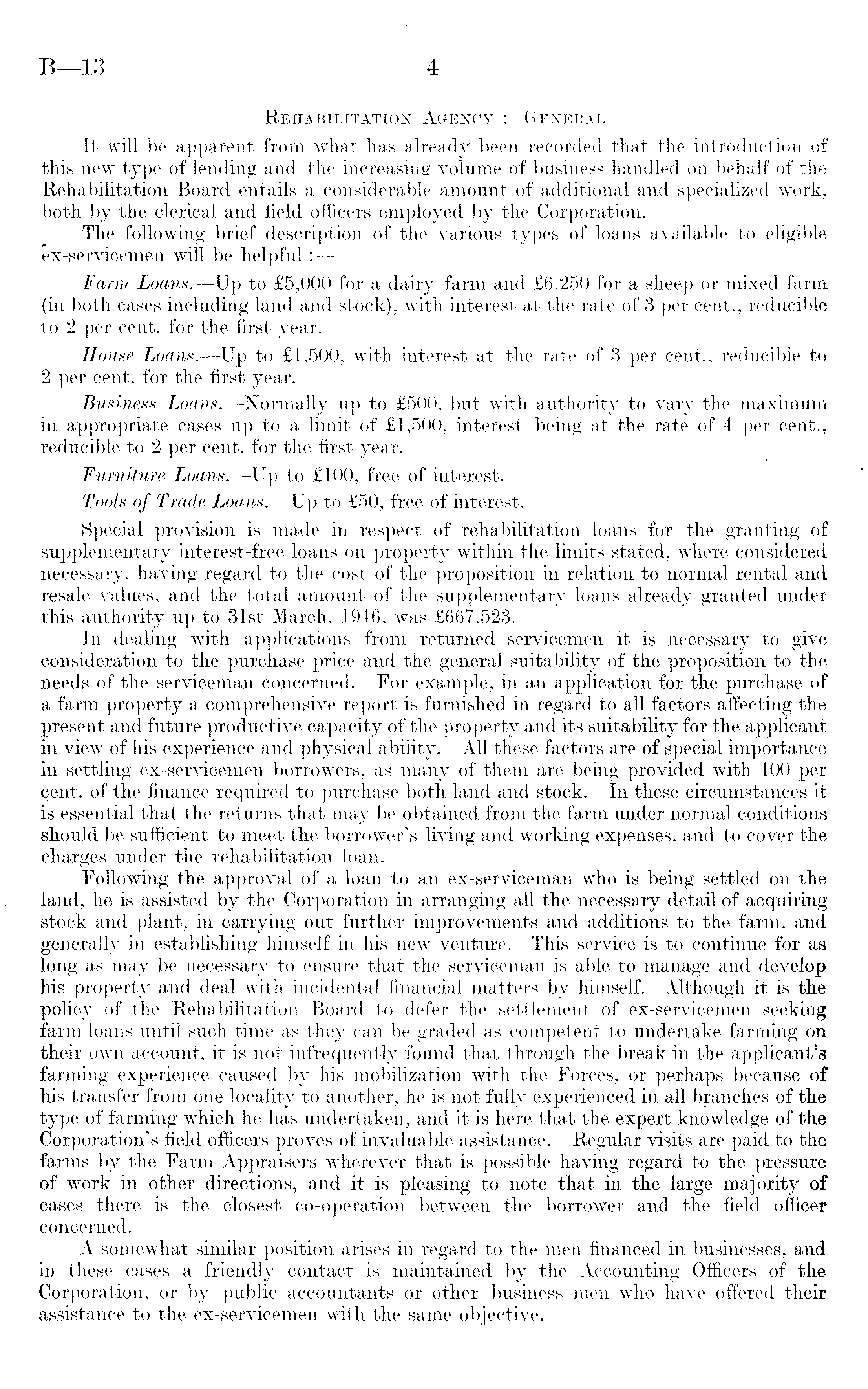 Rehabilitation Agency : General It will be apparent from what lias already been recorded that the introduction of this new type of lending and the increasing volume of business handled on behalf of the Rehabilitation Board entails a considerable amount of additional and specialized work, both by the clerical and field officers employed by the Corporation. The following brief description of the various types of loans available to eligible ex-servicemen will be helpful:— Farm, Loans. —Up to £5,000 for a dairy farm and £6,250 for a sheep or mixed farm (in both cases including land and stock), with interest at the rate of 3 per cent., reducible to 2 per cent, for the first year. House Loans. —Up to £1,500, with interest at the rate of 3 per cent., reducible to 2 per cent, for the first year. Business Loans.—Normally up to £5OO, but with authority to vary the maximum in appropriate cases up to a limit of £1,500, interest being at the rate of 4 per cent., reducible to 2 per cent, for the first year. Furniture Loans.—Up to £lOO, free of interest. Tools of Trade Loans.—Up to £5O, free of interest. Special provision is made in respect of rehabilitation loans for the granting of supplementary interest-free loans on property within the limits stated, where considered necessary, having regard to the cost of the proposition in relation to normal rental and resale values, and the total amount of the supplementary loans already granted under this authority up to 31st March, 1946, was £667,523. In dealing with applications from returned servicemen it is necessary to give consideration to the purchase-price and the general suitability of the proposition to the needs of the serviceman concerned. For example, in an application for the purchase of a farm property a comprehensive report is furnished in regard to all factors affecting the present and future productive capacity of the property and its suitability for the applicant in view of his experience and physical ability. All these factors are of special importance in settling ex-servicemen borrowers, as many of them are being provided with 100 per cent, of the finance required to purchase both land and stock. In these circumstances it is essential that the returns that may be obtained from the farm under normal conditions should be sufficient to meet the borrower's living and working expenses, and to cover the charges under the rehabilitation loan. Following the approval of a loan to an ex-serviceman who is being settled on the land, he is assisted by the Corporation in arranging all the necessary detail of acquiring stock and plant, in carrying out further improvements and additions to the farm, and generally in establishing himself in his new venture. This service is to continue for as long as may be necessary to ensure that the serviceman is able to manage and develop his property and deal with incidental financial matters by himself. Although it is the policy of the Rehabilitation Board to defer the settlement of ex-servicemen seeking farm loans until such time as they can be graded as competent to undertake farming on their own account, it is not infrequently found that through the break in the applicant's farming experience caused by his mobilization with the Forces, or perhaps because of his transfer from one locality to another, he is not fully experienced in all branches of the type of farming which he has undertaken, and it is here that the expert knowledge of the Corporation's field officers proves of invaluable assistance. Regular visits are paid to the farms by the Farm Appraisers wherever that is possible having regard to the pressure of work in other directions, and it is pleasing to note that in the large majority of cases there is the closest co-operation between the borrower and the field officer concerned. A somewhat similar position arises in regard to the men financed in businesses, and in these cases a friendly contact is maintained by the Accounting Officers of the Corporation, or by public accountants or other business men who have offered their assistance to the ex-servicemen with the same objective.