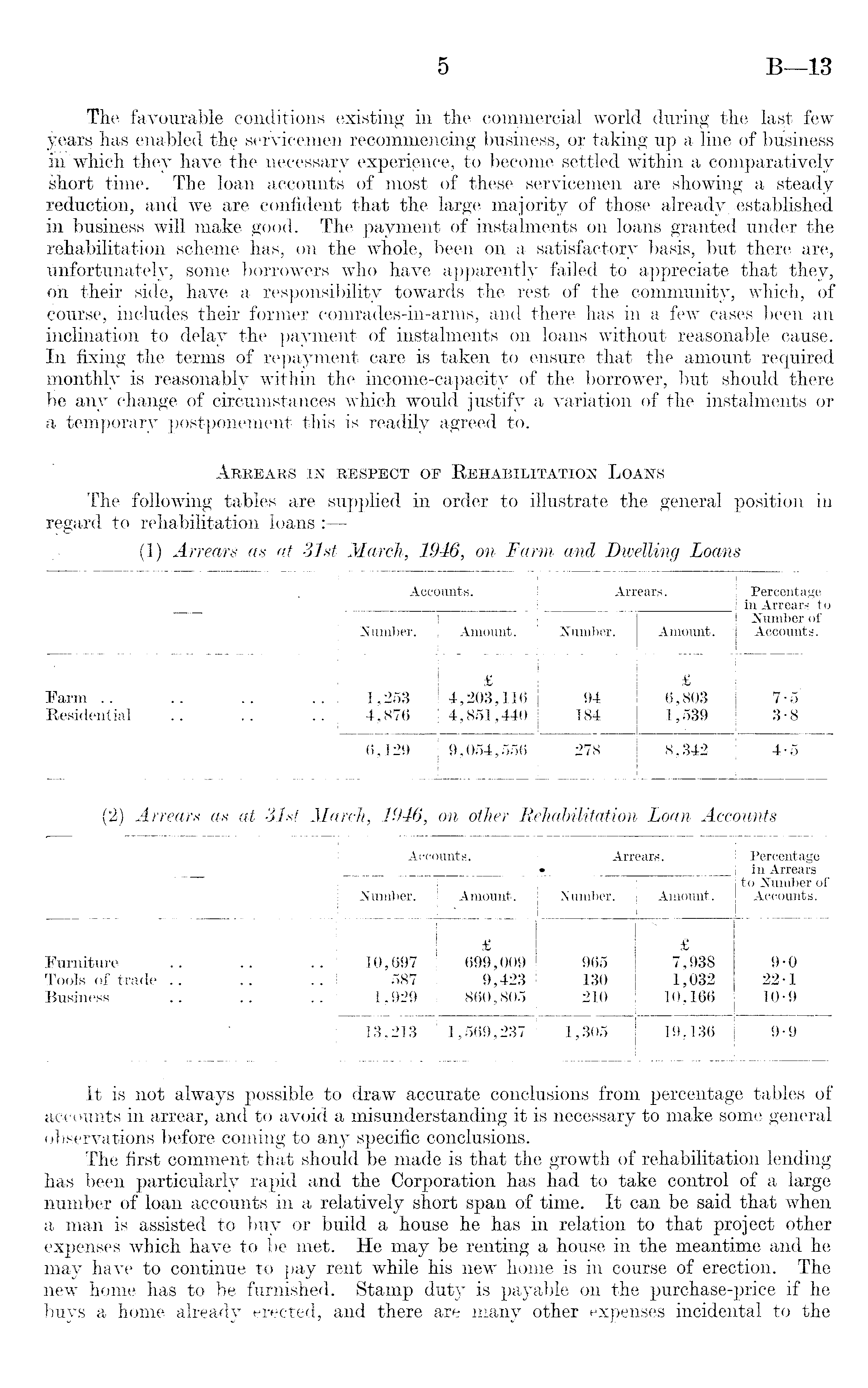The favourable conditions existing in the commercial world during the last few years has enabled the servicemen recommencing business, or taking up a line of business in which they have the necessary experience, to become settled within a comparatively short time. The loan accounts of most of these servicemen are showing a steady reduction, and we are confident that the large majority of those already established in business will make good. The payment of instalments on loans granted under the rehabilitation scheme has, on the whole, been on a satisfactory basis, but there are, unfortunately, some borrowers who have apparently failed to appreciate that they, on their side, have a responsibility towards the rest of the community, which, of course, includes their former comrades-in-arms, and there has in a few cases been an inclination to delay the payment of instalments on loans without reasonable cause. In fixing the terms of repayment care is taken to ensure that the amount required monthly is reasonably within the income-capacity of the borrower, but should there be any change of circumstances which would justify a variation of the instalments or a temporary postponement this is readily agreed to.