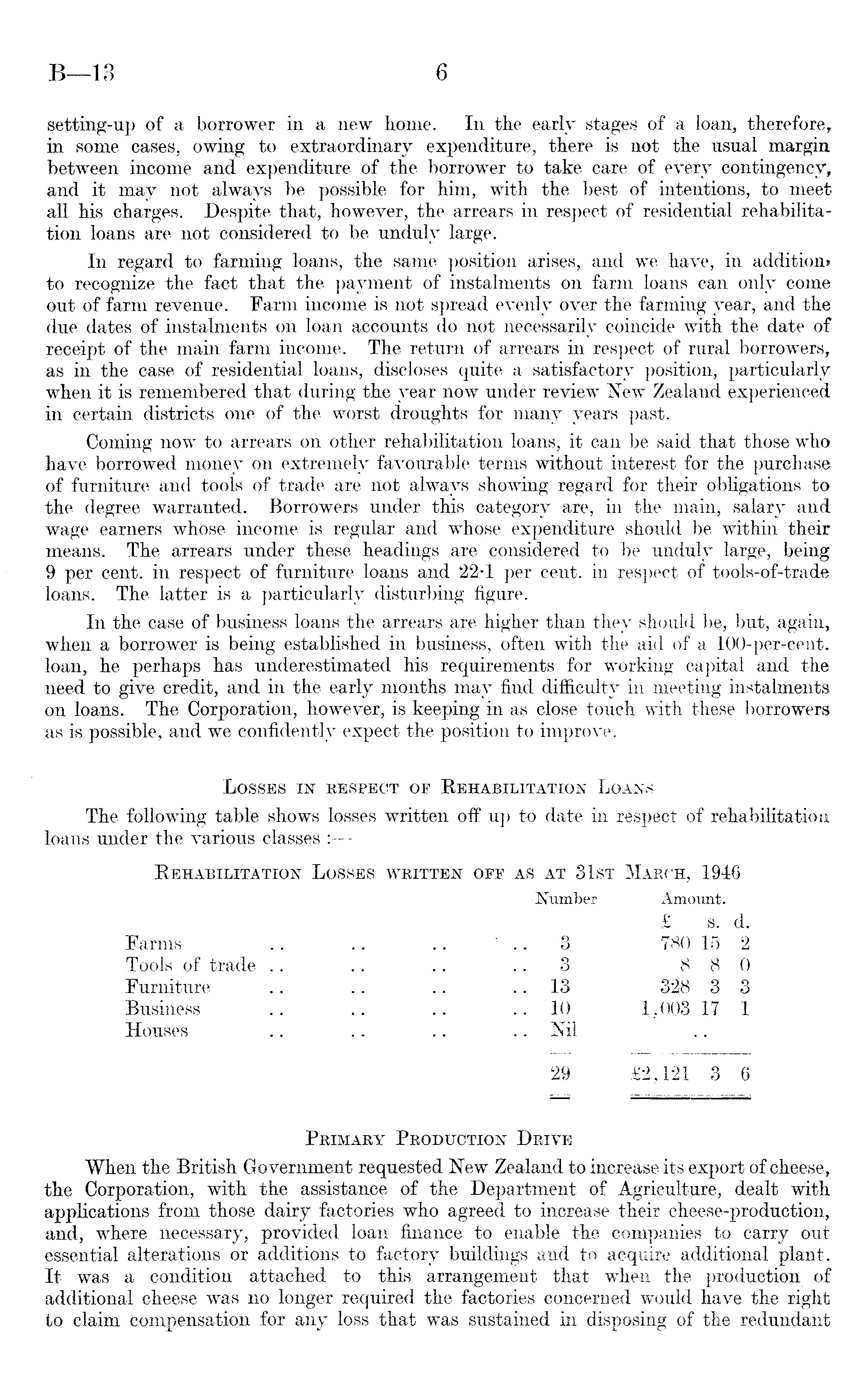 setting-up of a borrower in a new home. In the early stages of a loan, therefore, in some cases, owing to extraordinary expenditure, there is not the usual margin between income and expenditure of the borrower to take care of every contingency, and it may not always be possible for him, with the best of intentions, to meet all his charges. Despite that, however, the arrears in respect of residential rehabilitation loans are not considered to be unduly large. In regard to farming loans, the same position arises, and we have, in addition? to recognize the fact that the payment of instalments on farm loans can only come out of farm revenue. Farm income is not spread evenly over the farming year, and the due dates of instalments on loan accounts do not necessarily coincide with the date of receipt of the main farm income. The return of arrears in respect of rural borrowers, as in the case of residential loans, discloses quite a satisfactory position, particularly when it is remembered that during the year now under review New Zealand experienced in certain districts one of the worst droughts for many years past. Coming now to arrears on other rehabilitation loans, it can be said that those who have borrowed money on extremely favourable terms without interest for the purchase of furniture and tools of trade are not always showing regard for their obligations to the degree warranted. Borrowers under this category are, in the main, salary and wage earners whose income is regular and whose expenditure should be within their means. The arrears under these headings are considered to be unduly large, being 9 per cent, in respect of furniture loans and 22-1 per cent, in respect of tools-of-trade loans. The latter is a particularly disturbing figure. In the case of business loans the arrears are higher than they should be, but, again, when a borrower is being established in business, often with the aid of a 100-per-cent. loan, he perhaps has underestimated his requirements for working capital and the need to give credit, and in the early months may find difficulty in meeting instalments on loans. The Corporation, however, is keeping in as close touch with these borrowers as is possible, and we confidently expect the position to improve. Losses in respect op Rehabilitation Loans The following table shows losses written off up to date in respect of rehabilitation loans under the various classes : Rehabilitation Losses written opf as at 31st March, 1946 Number Amount. £ S. d. Farms .. .. .. 3 780 15 2 Tools of trade .. .. .. ..3 880 Furniture .. .. .. 13 328 3 3 Business .. .. .. ..10 1,003 17 1 Houses .. .. .. .. Nil 29 £2,121 3 6 Primary Production Drive When the British Government requested New Zealand to increase its export of cheese, the Corporation, with the assistance of the Department of Agriculture, dealt with applications from those dairy factories who agreed to increase their cheese-production, and, where necessary, provided loan finance to enable the companies to carry out essential alterations or additions to factory buildings and to acquire additional plant. It was a condition attached to this arrangement that when the production of additional cheese was no longer required the factories concerned would have the right to claim compensation for any loss that was sustained in disposing of the redundant