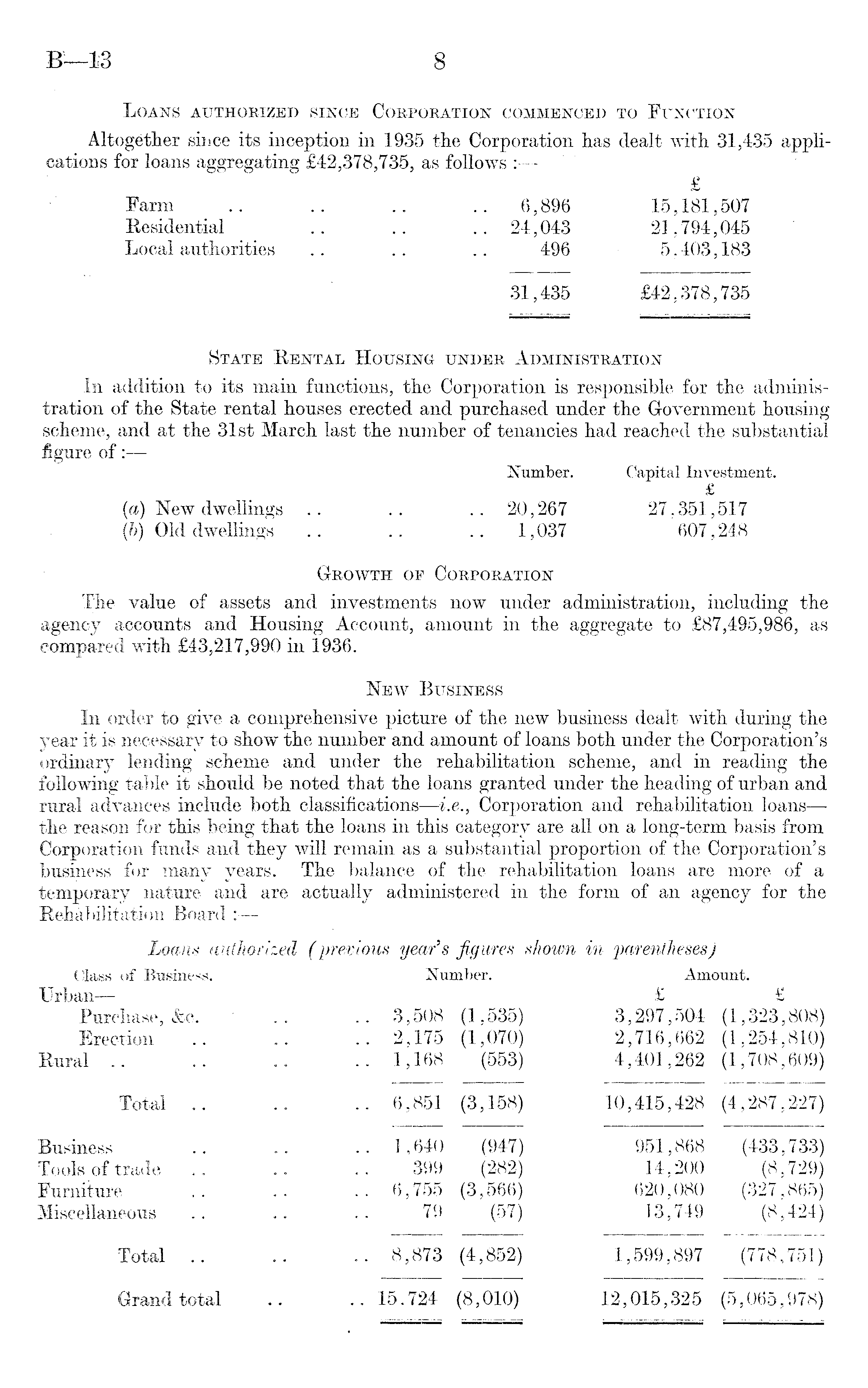 Loans authorized since Corporation commenced to Function Altogether since its inception in 1935 the Corporation has dealt with 31,435 applications for loans aggregating £42,378,735, as follows £ Farm .. ... .. .. 6,896 15,181,507 Residential ... .. .. 24,043 21,794,045 Local authorities .. .. .. 496 5,403,183 31,435 £42,378,735 State Rental Housing under Administration In addition to its main functions, the Corporation is responsible for the administration of the State rental houses erected and purchased under the Government housing scheme, and at the 31st March last the number of tenancies had reached the substantial figure of: — Number. Capital Investment. £ (a) New dwellings .. .. .. 20,267 27,351,517 (b) Old dwellings .. .. .. 1,037 607,248 Growth of Corporation The value of assets and investments now under administration, including the agency accounts and Housing Account, amount in the aggregate to £87,495,986, as compared with £43,217,990 .in 1936. New Business In order to give a comprehensive picture of the new business dealt with during the year it is necessary to show the number and amount of loans both under the Corporation's ordinary lending scheme and under the rehabilitation scheme, and in reading the following table it should be noted that the loans granted under the heading of urban and rural advances include both classifications —i.e., Corporation and rehabilitation loans—the reason for this being that the loans in this category are all on a long-term basis from Corporation funds and they will remain as a substantial proportion of the Corporation's business for many years. The balance of the rehabilitation loans are more of a temporary nature and are actually administered in the form of an agency for the Rehabilitation Board : Loans authorized (previous year's figures shown in parentheses J Class of Business. Number. Amount. Urban— £ £ Purchase, &c. .. ..3,508 (1,535) 3,297,504 (1,323,808) Erection .. .. ..2,175 (1,070) 2,716,662 (1,254,810) Rural .. .. .. .. 1,168 (553) 4,401,262 (1,708,609) Total .. .. .. 6,851 (3,158) 10,415,428 (4,287,227) Business .. .. ..1,640 (947) 951,868 (433,733) Tools of trade .. 399 (282) 14,200 (8,729) Furniture .. .. .. 6,755 (3,566) 620,080 (327,865) Miscellaneous 79 (57) 13,749 (8,424) Total .. .. .. 8,873 (4,852) 1,599,897 (778,751) Grand total .. .. 15,724 (8,010) 12,015,325 (5,065,978)