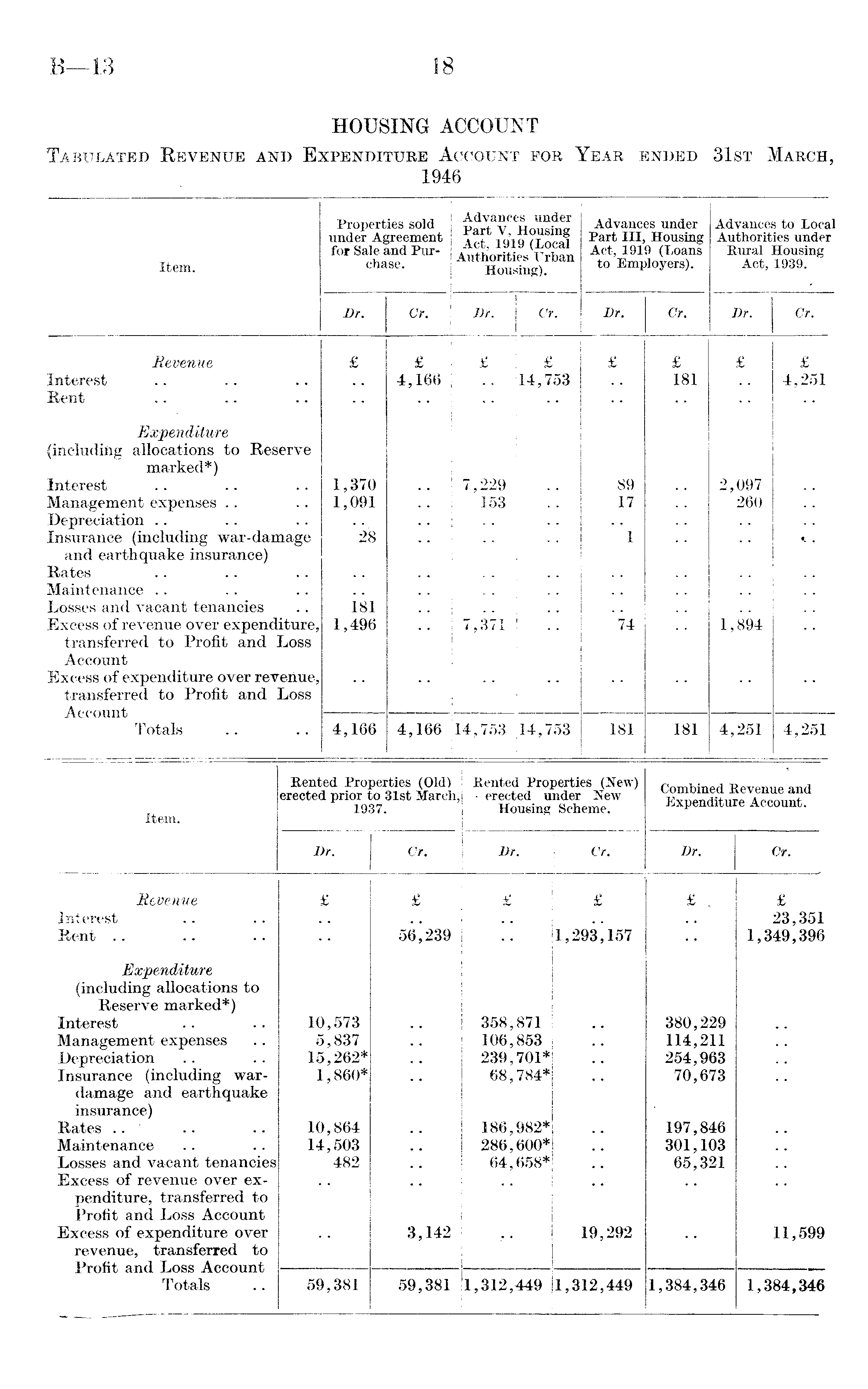 Item. Properties sold under Agreement for Sale and Purchase. Advances under Part V, Housing Act, 1919 (Local Authorities Urban Housing). Advances under Part III, Housing Act, 1919 (Loans to Employers). Advances to Local Authorities under Rural Housing Act, 1939. Dr. Cr. Dr. Cr. Dr. Cr. Dr. Cr. Revenue Interest Rent Expenditure (including allocations to Reserve marked*) Interest Management expenses Depreciation Insurance (including war-damage and earthquake insurance) Rates Maintenance Losses and vacant tenancies Excess of revenue over expenditure, transferred to Profit and Loss Account Excess of expenditure over revenue, transferred to Profit and Loss Account Totals £ 1,370 1,091 28 isi 1,496 £ 4,166 £ 7,229 153 7,371 £ 14,753 £ 89 17 1 74 £ 181 £ 2,097 260 1,894 £ 4,251 4,166 4,166 14,753 14,753 181 181 4,251 4,251 Item. Rented Properties (Old) erected prior to 31st March 1937. Rented Properties (New) , • erected under New Housing Scheme. Combined Revenue and Expenditure Account. Dr. Cr. Dr. 1 Cr. Dr. Cr. Revenue Interest Rent Expenditure (including allocations to Resei*ve marked*) Interest Management expenses Depreciation Insurance (including wardamage and earthquake insurance) Rates Maintenance Losses and vacant tenancies Excess of revenue over expenditure, transferred to Profit and Loss Account Excess of expenditure over revenue, transferred to Profit and Loss Account Totals £ 10,573 5,837 15,262* 1,860* 10,864 14,503 482 £ 56*239 3,142 £ 358,871 106,853 239,701* 68,784* 186,982* 286,600* 64,658* £ 1,293j 157 19,292 £ . 380,229 114,211 254,963 70,673 197,846 301,103 65,321 £ 23,351 1,349,396 ' 11,599 59,381 59,381 1,312,449 1,312,449 1,384,346 1,384,346