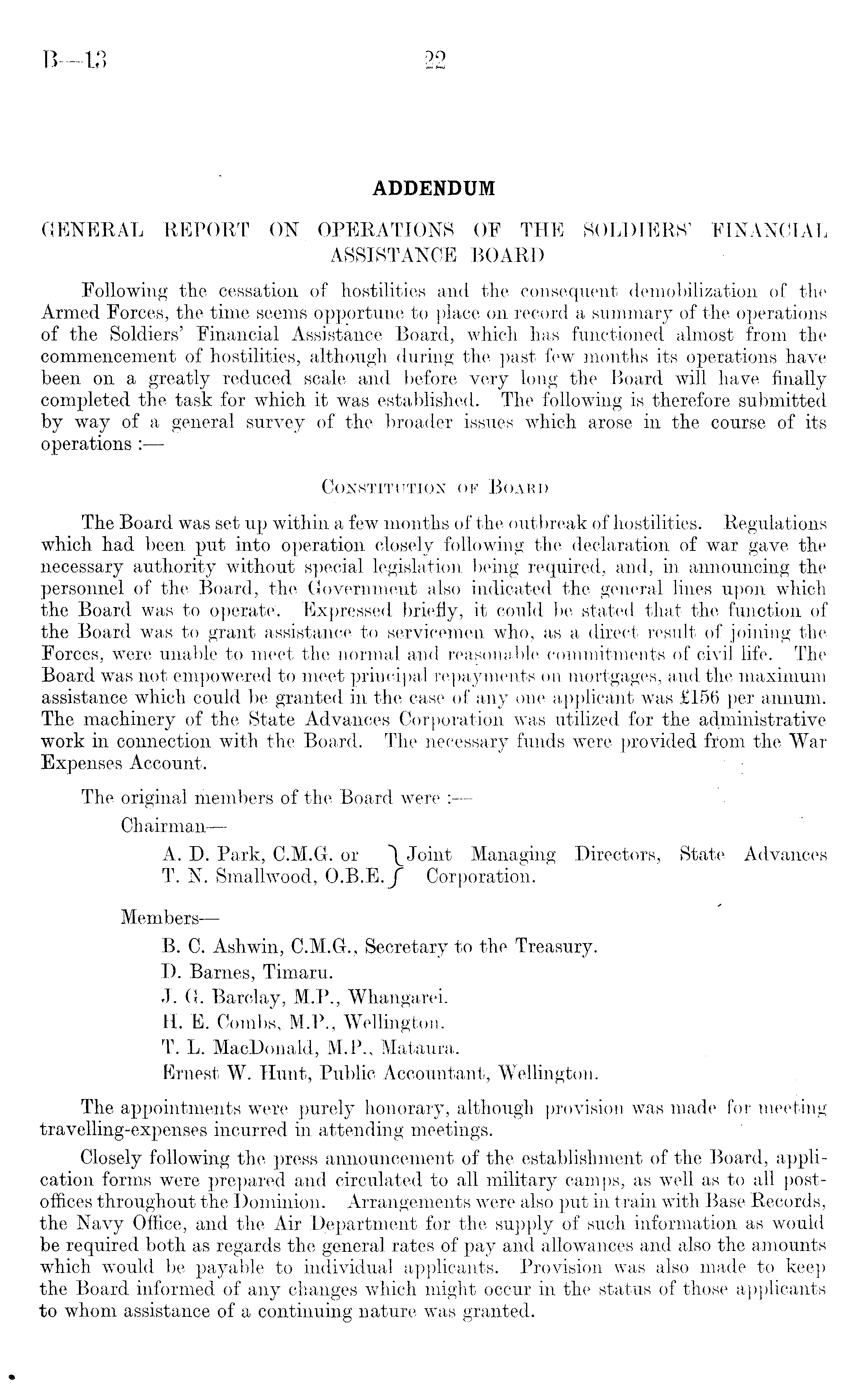 ADDENDUM GENERAL REPORT ON OPERATIONS OF THE SOLDIERS' FINANCIAL ASSISTANCE BOARD Following the cessation of hostilities and the consequent demobilization of the Armed Forces, the time seems opportune to place on record a summary of the operations of the Soldiers' Financial Assistance Board, which has functioned almost from the commencement of hostilities, although during the past few months its operations have been on a greatly reduced scale and before very long the Board will have finally completed the task for which it was established. The following is therefore submitted by way of a general survey of the broader issues which arose in the course of its operations : Constitution of Board The Board was set up within a few months of the outbreak of hostilities. Regulations which had been put into operation closely following the declaration of war gave the necessary authority without special legislation being required, and, in announcing the personnel of the Board, the Government also indicated the general lines upon which the Board was to operate". Expressed briefly, it could be stated that the function of the Board was to grant assistance to servicemen who, as a direct result of joining the Forces, were unable to meet the normal and reasonable commitments of civil life. The Board was not empowered to meet principal repayments on mortgages, and the maximum assistance which could be granted in the case of any one applicant was £156 per annum. The machinery of the State Advances Corporation was utilized for the administrative work in connection with the Board. The necessary funds were provided from the War Expenses Account. The original members of the Board were : Chairman — A. D. Park, C.M.G. or \ Joint Managing Directors, State Advances T. N. Smallwood, 0.8. E./ Corporation. Members — B. C. Ash win, C.M.G., Secretary to the Treasury. D. Barnes, Timaru. J. G. Barclay, M.P., Whangarei. H. E. Combs, M.P., Wellington. T. L. Mac Donald, M.P., Mataura. Ernest W. Hunt, Public Accountant, Wellington. The appointments were purely honorary, although provision was made for meeting travelling-expenses incurred in attending meetings. Closely following the press announcement of the establishment of the Board, application forms were prepared and circulated to all military camps, as well as to all postoffices throughout the Dominion. Arrangements were also put in train with Base Records, the Navy Office, and the Air Department for the supply of such information as would be required both as regards the general rates of pay and allowances and also the amounts which would be payable to individual applicants. Provision was also made to keep the Board informed of any changes which might occur in the status of those applicants to whom assistance of a continuing nature was granted.