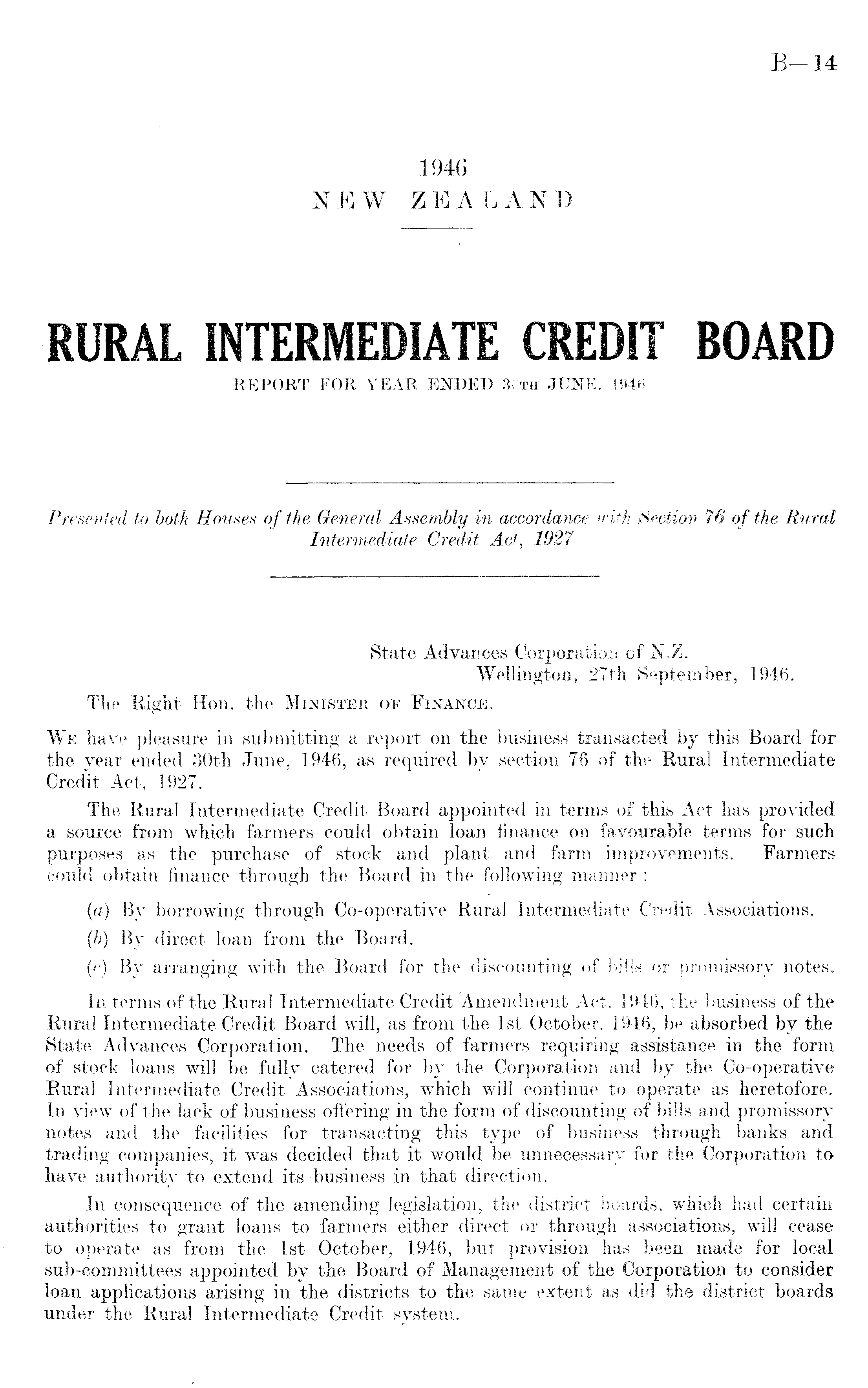 State Advances Corporation of N.Z. Wellington, 27th September, 1946. The Right Hon. the Minister or Finance. We have pleasure in submitting a report on the business transacted by this Board for the year ended 30th June, 1946, as required by section 76 of the Rural Intermediate Credit Act, 1927. The Rural Intermediate Credit Board appointed in terms of this Act has provided a source from which farmers could obtain loan finance on favourable terms for such purposes as the purchase of stock and plant and farm improvements. Farmers could obtain finance through the Board in the following manner : {a) By borrowing through Co-operative Rural Intermediate Credit Associations. (6) By direct loan from the Board. (c) By arranging with the Board for the discounting of bills or promissory notes. In terms of the Rural Intermediate Credit 'Amendment Act, 1946, the business of the Rural Intermediate Credit Board will, as from the Ist October, 1946, be absorbed by the State Advances Corporation. The needs of farmers requiring assistance in the form of stock loans will be fully catered for by the Corporation and by the Co-operative Rural Intermediate Credit Associations, which will continue to operate as heretofore. In view of the lack of business offering in the form of discounting of bills and promissory notes and the facilities for transacting this type of business through banks and trading companies, it was decided that it would be unnecessary for the Corporation to have authority to extend its business in that direction. In consequence of the amending legislation, the district boards, which had certain authorities to grant loans to farmers either direct or through associations, will cease to operate as from the Ist October, 1946, but provision has been made for local sub-committees appointed by the Board of Management of the Corporation to consider loan applications arising in the districts to the same extent as did the district boards under the Rural Intermediate Credit system.