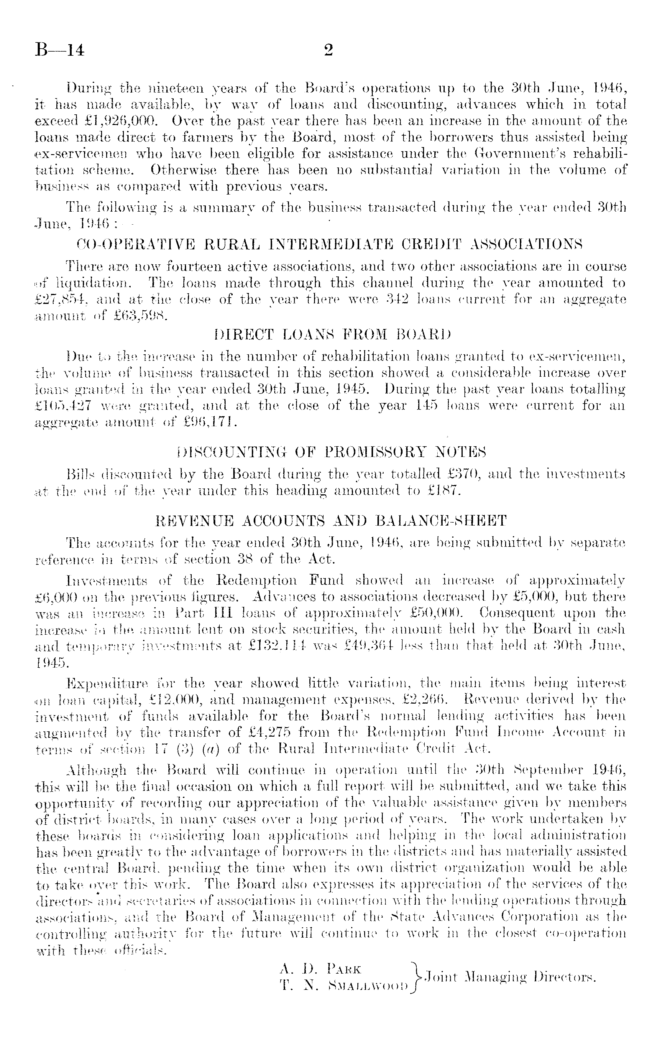 During the nineteen years of the Board's operations up to the 30th June, 1946, it has made available, by way of loans and discounting, advances which in total exceed £1,926,000. Over the past year there has been an increase in the amount of the loans made direct to farmers by the Board, most of the borrowers thus assisted being ex-servicemen who have been eligible for assistance under the Government's rehabilitation scheme. Otherwise there has been no substantial variation in the volume of business as compared with previous years. The following is a summary of the business transacted during the year ended 30th June, 1946 : CO-OPERATIVE RURAL INTERMEDIATE CREDIT ASSOCIATIONS There are now fourteen active associations, and two other associations are in course of liquidation. The loans made through this channel during the year amounted to £27,854, and at the close of the year there were 342 loans current for an aggregate amount of £63,598. DIRECT LOANS FROM BOARD Due to the increase in the number of rehabilitation loans granted to ex-servicemen, the volume of business transacted in this section showed a considerable increase over loans granted in the year ended 30th June, 1945. During the past year loans totalling £105,427 were granted, and at the close of the year 145 loans were current for an aggregate amount of £96,171. DISCOUNTING OF PROMISSORY NOTES Bills discounted by the Board during the year totalled £370, and the investments at the end of the year under this heading amounted to £lB7. REVENUE ACCOUNTS AND BALANCE-SHEET The accounts for the year ended 30th June, 1946, are being submitted by separate reference in terms of section 38 of the Act. Investments of the Redemption Fund showed an increase of approximately £6,000 on the previous figures. Advances to associations decreased by £5,000, but there was an increase in Part 111 loans of approximately £50,000. Consequent upon the increase in the amount lent on stock securities, the amount held by the Board in cash and temporarv investments at £132,114 was £49,364 less than that held at 30th June, 1945. Expenditure for the year showed little variation, the main items being interest on loan capital, £12,000, and management expenses, £2,266. Revenue derived by the investment of funds available for the Board's normal lending activities has been augmented by the transfer of £4,275 from the Redemption Fund Income Account in terms of section 17 (3) (a) of the Rural Intermediate Credit Act. Although the Board will continue in operation until the 30th September 1946, this will be the final occasion on which a full report will be submitted, and we take this opportunity of recording our appreciation of the valuable assistance given by members of district boards, in many cases over a long period of years. The work undertaken by these boards in considering loan applications and helping in the local administration has been greatly to the advantage of borrowers in the districts and has materially assisted the central Board, pending the time when its own district organization would be able to take over this work. The Board also expresses its appreciation of the services of the directors and secretaries of associations in connection with the lending operations through associations, and the Board of Management of the State Advances Corporation as the controlling authority for the future will continue to work in the closest co-operation with these officials. m' c< ARK \ Joint Managing Directors. T. N. Small wood J 8 6