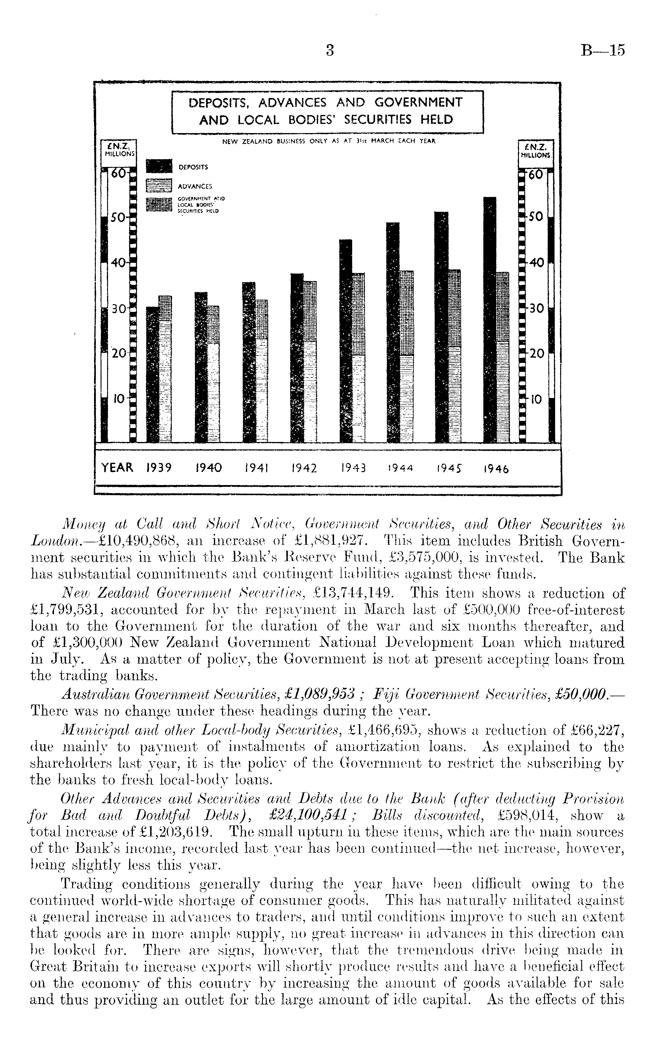 Money at Call and Short Notice, Government Securities, and Other Securities in L0nd0n.—£10,490,868, an increase of £1,881,927. This item includes British Government securities in which the Bank's Reserve Fund, £3,575,000, is invested. The Bank has substantial commitments and contingent liabilities against these funds. Nevj Zealand Government Securities, £13,744,149. This item shows a reduction of £1,799,531, accounted for by the repayment in March last of £500,000 free-of-interest loan to the Government for the duration of the war and six months thereafter, and of £1,300,000 New Zealand Government National Development Loan which matured in July. As a matter of policy, the Government is not at present accepting loans from the trading banks. Australian Government Securities, £1,089,953 ; Fiji Government Securities, £50,000. — There was no change under these headings during the year. Municipal and other Local-body Securities, £1,466,695, shows a reduction of £66,227, due mainly to payment of instalments of amortization loans. As explained to the shareholders last year, it is the policy of the Government to restrict the subscribing by the banks to fresh local-body loans. Other Advances and Securities and Debts due to the Bank (after deducting Provision for Bad and Doubtful Debts), £24,100,541; Bills discounted, £598,014, show a total increase of £1,203,619. The small upturn in these items, which are the main sources of the Bank's income, recorded last year has been continued—the net increase, however, being slightly less this year. Trading conditions generally during the year have been difficult owing to the continued world-wide shortage of consumer goods. This has naturally militated against a general increase in advances to traders, and until conditions' improve to such an extent that goods are in more ample supply, no great increase in advances in this direction can be looked for. There are signs, however, that the tremendous drive being made in Great Britain to increase exports will shortly produce results and have a beneficial effect on the economy of this country by increasing the amount of goods available for sale and thus providing an outlet for the large amount of idle capital. As the effects of this
