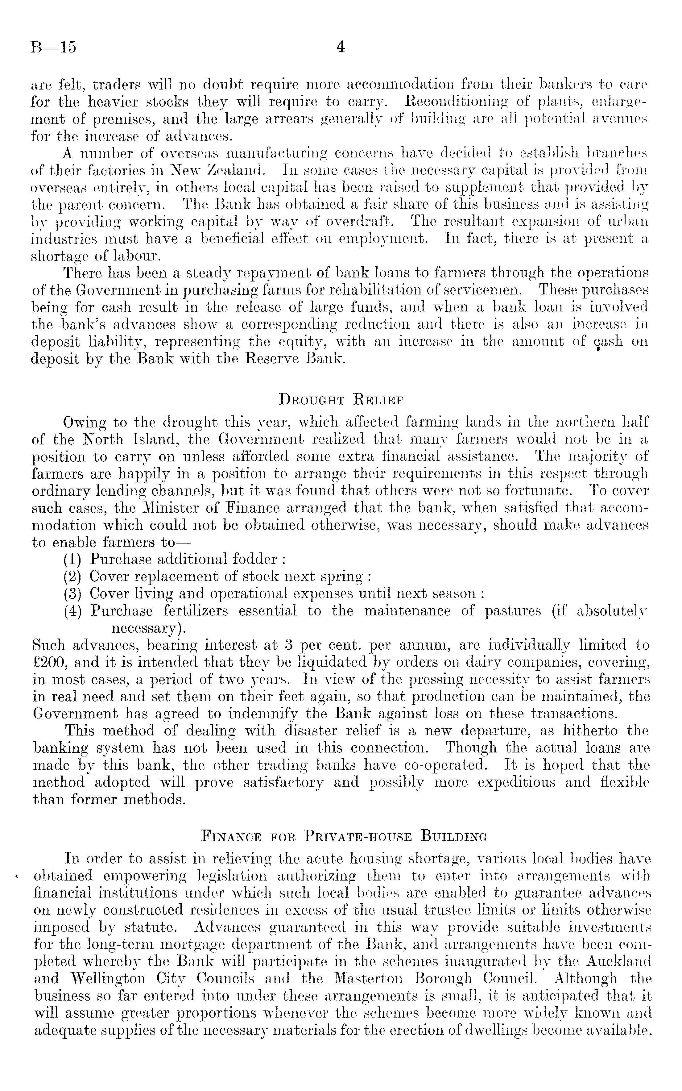are felt, traders will no doubt require more accommodation from their bankers to care for the heavier stocks they will require to carry. Reconditioning of plants, enlargement of premises, and the large arrears generally of building are all potential avenues for the increase of advances. A number of overseas manufacturing concerns have decided to establish branches of their factories in New Zealand. In some cases the necessary capital is provided from overseas entirely, in others local capital has been raised to supplement that provided by the parent concern. The Bank has obtained a fair share of this business and is assisting by providing working capital by way of overdraft. The resultant expansion of urban industries must have a beneficial effect on employment. In fact, there is at present a shortage of labour. There has been a steady repayment of bank loans to farmers through the operations of the Government in purchasing farms for rehabilitation of servicemen. These purchases being for cash result in the release of large funds, and when a bank loan is involved the bank's advances show a corresponding reduction and there is also an increase in deposit liability, representing the equity, with an increase in the amount of qash on deposit by the Bank with the Reserve Bank. Drought Relief Owing to the drought this year, which affected farming lands in the northern half of the North Island, the Government realized that many farmers would not be in a position to carry on unless afforded some extra financial assistance. The majority of farmers are happily in a position to arrange their requirements in this respect through ordinary lending channels, but it was found that others were not so fortunate. To cover such cases, the Minister of Finance arranged that the bank, when satisfied that accommodation which could not be obtained otherwise, was necessary, should make advances to enable farmers to—(1) Purchase additional fodder : (2) Cover replacement of stock next spring : (3) Cover living and operational expenses until next season : (4) Purchase fertilizers essential to the maintenance of pastures (if absolutely necessary). Such advances, bearing interest at 3 per cent, per annum, are individually limited to £2OO, and it is intended that they be liquidated by orders on dairy companies, covering, in most cases, a period of two years. In view of the pressing necessity to assist farmers in real need and set them on their feet again, so that production can be maintained, the Government has agreed to indemnify the Bank against loss on these transactions. This method of dealing with disaster relief is a new departure, as hitherto the banking system has not been used in this connection. Though the actual loans are made by this bank, the other trading banks have co-operated. It is hoped that the method adopted will prove satisfactory and possibly more expeditious and flexible than former methods. Finance foe Private-house Building In order to assist in relieving the acute housing shortage, various local bodies have obtained empowering legislation authorizing them to enter into arrangements with financial institutions under which such local bodies are enabled to guarantee advances on newly constructed residences in excess of the usual trustee limits or limits otherwise imposed by statute. Advances guaranteed in this way provide suitable investments for the long-term mortgage department of the Bank, and arrangements have been completed whereby the Bank will participate in the schemes inaugurated by the Auckland and Wellington City Councils and the Masterton Borough Council. Although the business so far entered into under these arrangements is small, it is anticipated that it will assume greater proportions whenever the schemes beeome more widely known and adequate supplies of the necessary materials for the erection of dwellings become available.