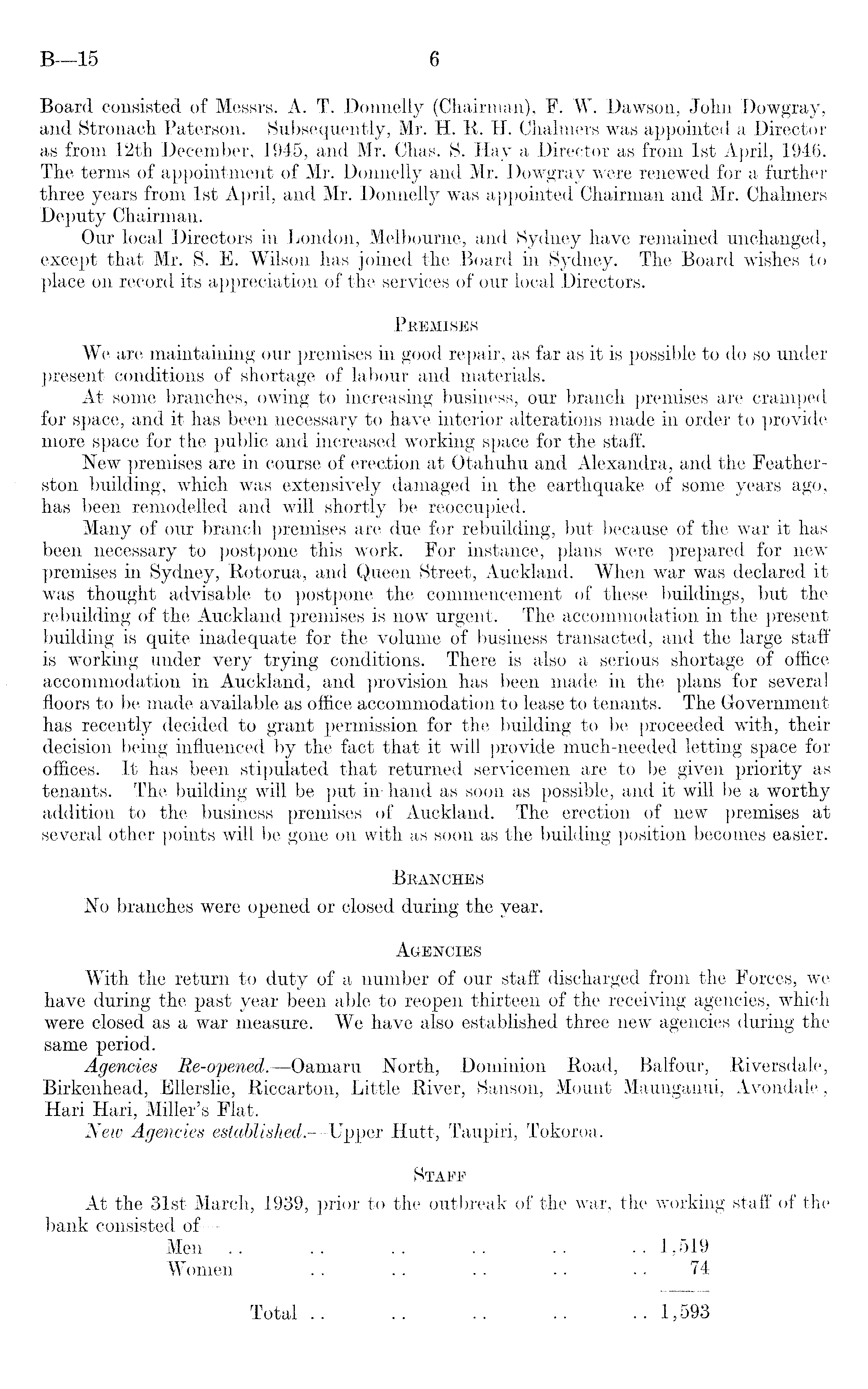Board consisted of Messrs. A. T. Donnelly (Chairman), F. W. Dawson, John Dowgray, and Stronach Paterson. Subsequently, Mr. H. R. H. Chalmers was appointed a Director as from 12th December, 1945, and Mr. Chas. S. Hay a Director as from Ist April, 1946. The terms of appointment of Mr. Donnelly and Mr. Dowgray were renewed for a further three years from Ist April, and Mr. Donnelly was appointed Chairman and Mr. Chalmers Deputy Chairman. Our local Directors in London, Melbourne, and Sydney have remained unchanged, except that Mr. S. E. Wilson has joined the Board in Sydney. The Board wishes to place on record its appreciation of the services of our local Directors. Premises We are maintaining our premises in good repair, as far as it is possible to do so under present conditions of shortage of labour and materials. At some branches, owing to increasing business, our branch premises are cramped for space, and it has been necessary to have interior alterations made in order to provide more space for the public and increased working space for the staff. New premises are in course of erection at Otahuhu and Alexandra, and the Feat'herston building, which was extensively damaged in the earthquake of some years ago, has been remodelled and will shortly be reoccupied. Many of our branch premises are due for rebuilding, but because of the war it has been necessary to postpone this work. For instance, plans were prepared for new premises in Sydney, Rotorua, and Queen Street, Auckland. When war was declared it was thought advisable to postpone the commencement of these buildings, but the rebuilding of the Auckland premises is now urgent. The accommodation in the present building is quite inadequate for the volume of business transacted, and the large staff is working under very trying conditions. There is also a serious shortage of office accommodation in Auckland, and provision has been made in the plans for several floors to be made available as office accommodation to lease to tenants. The Government has recently decided to grant permission for the building to be proceeded with, their decision being influenced by the fact that it will provide much-needed letting space for offices. It has been stipulated that returned servicemen are to be given priority as tenants. The building will be put in' hand as soon as possible, and it will be a worthy addition to the business premises of Auckland. The erection of new premises at several other points will be gone on with as soon as the building position becomes easier. Branches No branches were opened or closed during the year. Agencies With the return to duty of a number of our staff discharged from the Forces, we have during the past year been able to reopen thirteen of the receiving agencies, which were closed as a war measure. We have also established three new agencies during the same period. Agencies Re-opened.—Oamaru North, Dominion Road, Balfour, Riversdale, Birkenhead, Ellerslie, Riccarton, Little River, Sanson, Mount Maunganui, Avondale; Hari Hari, Miller's Flat. New Agencies established. —Upper Hutt, Taupiri, Tokoroa. Staff At the 31st March, 1939, prior to the outbreak of the war, the working staff of the bank consisted of — Men .. .. .. .. .. .. 1,519 Women .. .. .. .. .. 74 Total .. .. .. .. .. 1,593