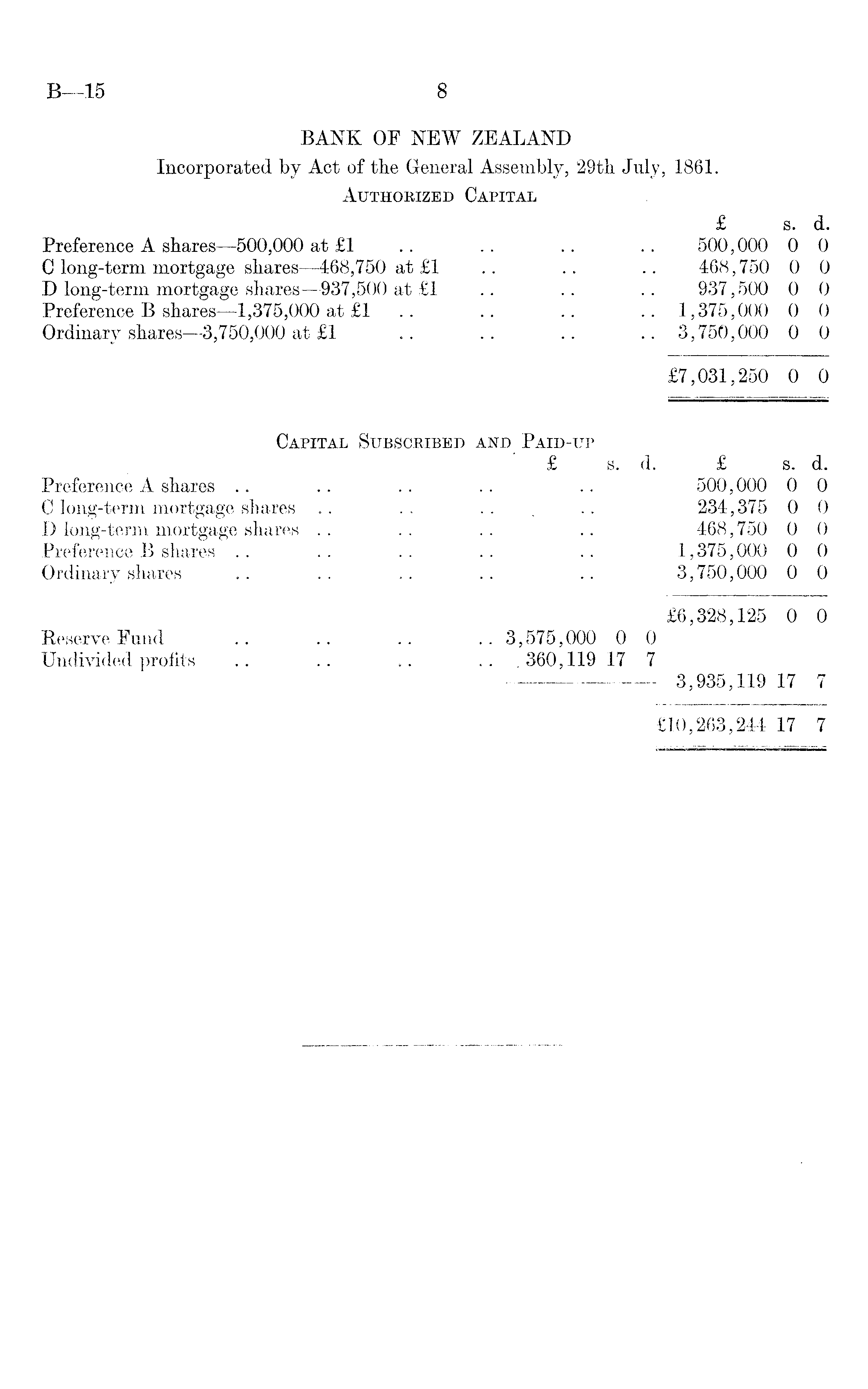 BANK OF NEW ZEALAND Incorporated by Act of the General Assembly, 29th July, 1861. Authorized Capital £ s. d. Preference A shares —500,000 at £1 .. .. .. .. 500,000 0 0 C long-term mortgage shares —468,750 at £1 .. .. .. 468,750 0 0 D long-term mortgage shares—937,soo at £1 .. .. .. 937,500 0 0 Preference B shares —1,375,000 at £1 .. .. .. .. 1,375,000 0 0 Ordinary shares —3,750,000 at £1 .. .. .. .. 3,750,000 0 0 £7,031,250 0 0 Capital Subscribed and Paid-up £ s. d. £ s. d. Preference A shares .. .. .. .. .. 500,000 0 0 C long-term mortgage shares .. .. .. . .. 234,375 0 0 D long-term mortgage shares .. .. .. .. 468,750 0 0 Preference B shares .. .. .. .. .. 1,375,000 0 0 Ordinary shares .. .. .. .. .. 3,750,000 0 0 £6,328,125 0 0 Reserve Fund .. .. .. .. 3,575,000 0 0 Undivided profits .. .. .. .. 360,119 17 7 3,935,119 17 7 £10,263,244 17 7