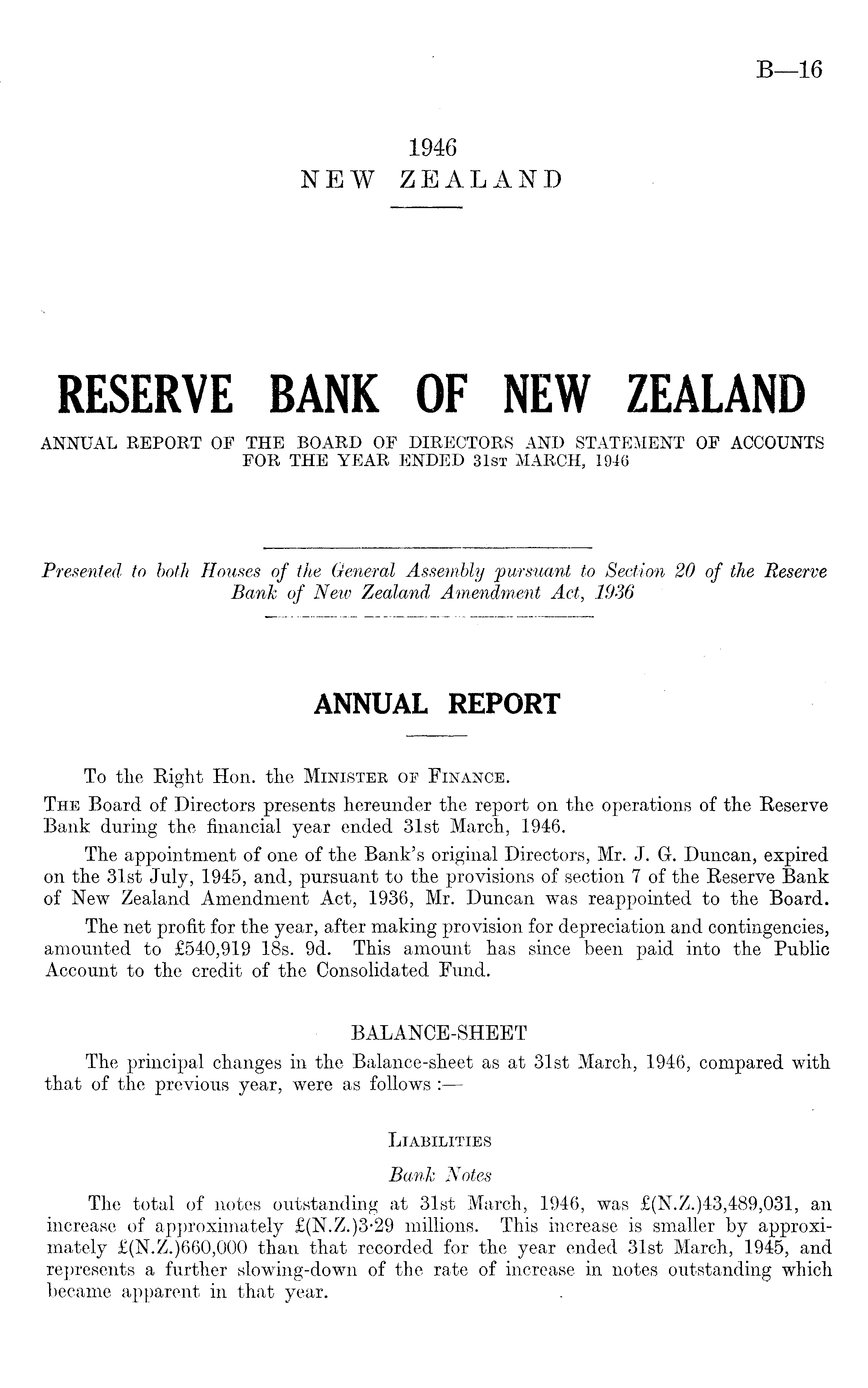 ANNUAL REPORT To the Eight Hon. the Minister of Finance. The Board of Directors presents hereunder the report on the operations of the Reserve Bank during the financial year ended 31st March, 1946. The appointment of one of the Bank's original Directors, Mr. J. Gr. Duncan, expired on the 31st July, 1945, and, pursuant to the provisions of section 7 of the Reserve Bank of New Zealand Amendment Act, 1936, Mr. Duncan was reappointed to the Board. The net profit for the year, after making provision for depreciation and contingencies, amounted to £540,919 18s. 9d. This amount has since been paid into the Public Account to the credit of the Consolidated Fund. BALANCE-SHEET The principal changes in the Balance-sheet as at 31st March, 1946, compared with that of the previous year, were as follows : Liabilities Bank Notes The total of notes outstanding at 31st March, 1946, was £(N.Z.)43,489,031, an increase of approximately £(N.Z.)3-29 millions. This increase is smaller by approximately £(N.Z.)660,000 than that recorded for the year ended 31st March, 1945, and represents a further slowing-down of the rate of increase in notes outstanding which became apparent in that year.
