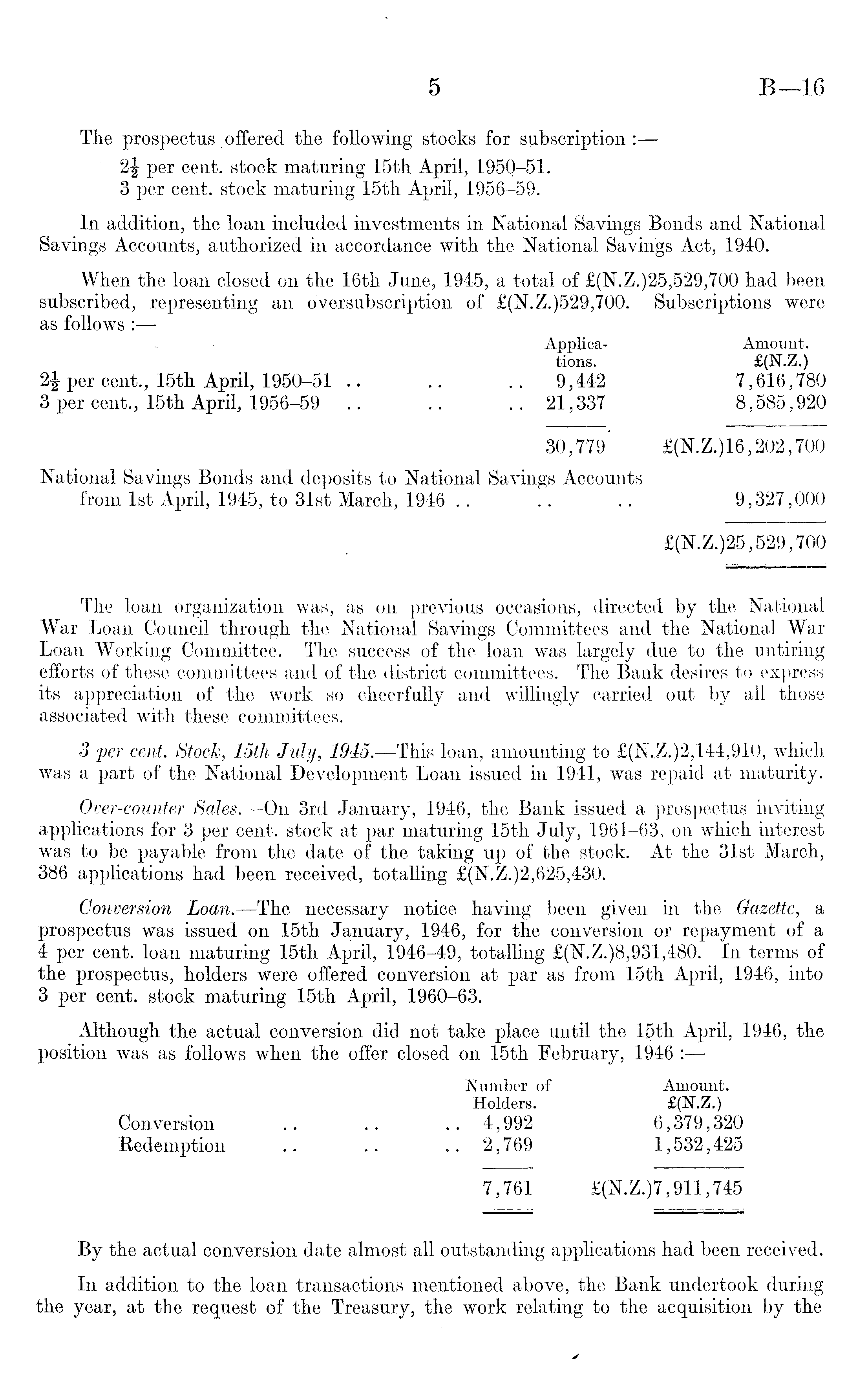 The prospectus _ offered the following stocks for subscription : 2% per cent, stock maturing 15th April, 1950-51. 3 per cent, stock maturing 15th April, 1956-59. In addition, the loan included investments in National Savings Bonds and National Savings Accounts, authorized in accordance with the National Savings Act, 1940. When the loan closed on the 16th June, 1945, a total of £(N.Z.)25,529,700 had been subscribed, representing an oversubscription of £(N.Z.)529,700. Subscriptions were as follows : Applica- Amount, tions. £(N.Z.) 2% per cent., 15th April, 1950-51 .. .. .. 9,442 7,616,780 3 per cent., 15th April, 1956-59 .. .. .. 21,337 8,585,920 30,779' £(N.Z.)16,202,700 National Savings Bonds and deposits to National Savings Accounts from Ist April, 1945, to 31st March, 1946 .. .. .. 9,327,000 £(N.Z.)25,529,700 The loan organization was, as on previous occasions, directed by the National War Loan Council through the National Savings Committees and the National War Loan Working Committee. The success of the loan was largely due to the untiring efforts of these committees and of the district committees. The Bank desires to express its appreciation of the work so cheerfully and willingly carried out by all those associated with these committees. 3 per cent. Stock, 15th July, 1945.—This loan, amounting to £(N.Z.)2,144,910, which was a part of the National Development Loan issued in 1941, was repaid at maturity. Over-counter Sales. —On 3rd January, 1946, the Bank issued a prospectus inviting applications for 3 per cent, stock at par maturing 15th July, 1961-63, on which interest was to be payable from the date of the taking up of the stock. At the 31st March, 386 applications had been received, totalling £(N.Z.)2,625,430. Conversion Loan. —The necessary notice having been given in the Gazette, a prospectus was issued on 15th January, 1946, for the conversion or repayment of a 4 per ceat. loan maturing 15th April, 1946-49, totalling £(N.Z.)8,931,480. In terms of the prospectus, holders were offered conversion at par as from 15th April, 1946, into 3 per cent, stock maturing 15th April, 1960-63. Although the actual conversion did not take place until the 10th April, 1946, the position was as follows when the offer closed on 15th February, 1946 : Number of Amount. Holders. £(N.Z.) Conversion .. .. .. 4,992 6,379,320 Redemption .. .. .. 2,769 1,532,425 7,761 £(N.Z.)7,911,745 By the actual conversion date almost all outstanding applications had been received. In addition to the loan transactions mentioned above, the Bank undertook during the year, at the request of the Treasury, the work relating to the acquisition by the