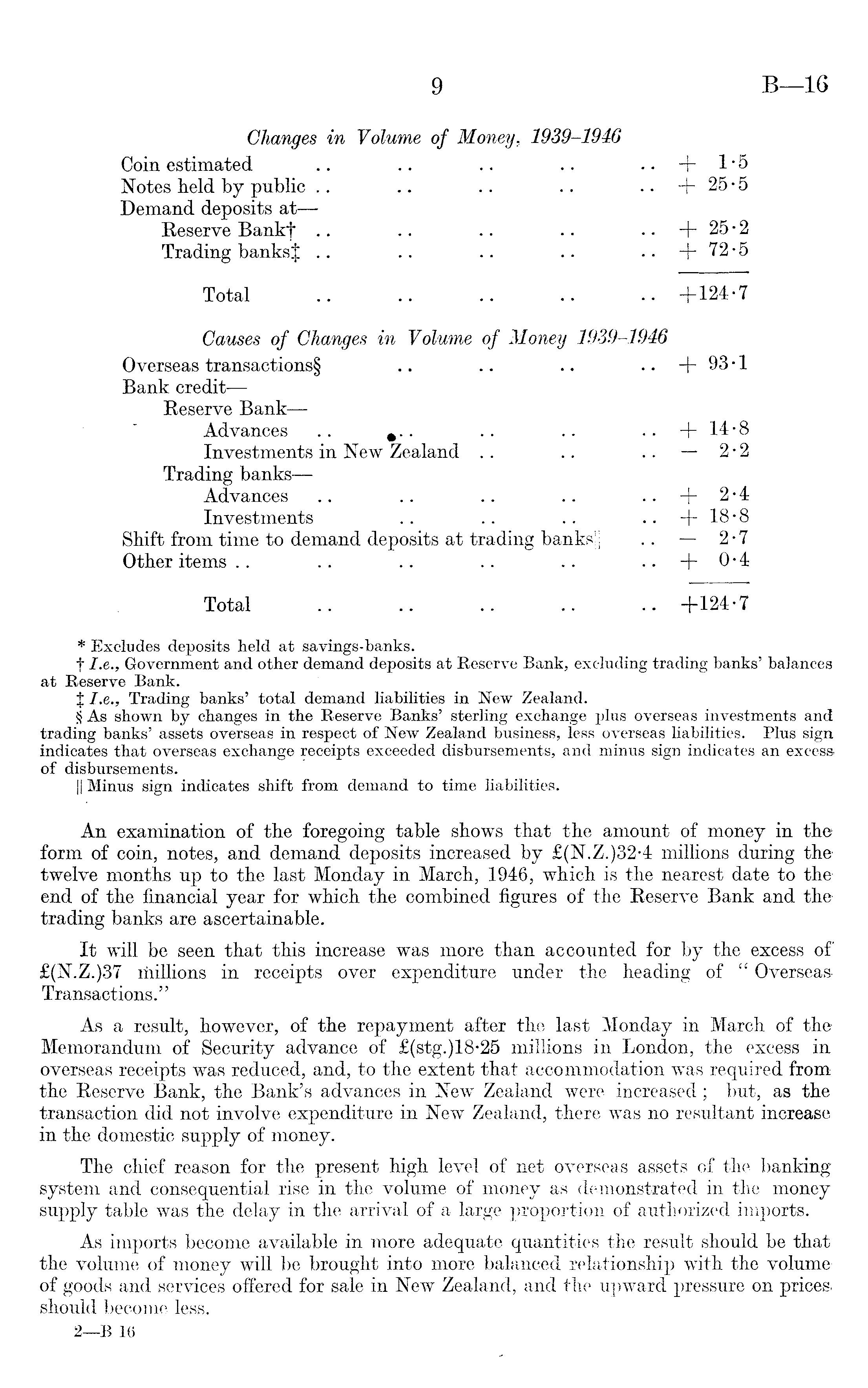Changes in Volume of Money, 1939-1946 Coin, estimated .. .. .. .. .. + I*s Notes held by public .. .. .. .. .. +25 • 5 Demand deposits at — Reserve Bankf .. •. . • • • + 25 • 2 Trading banksf .. .. .. .. .. + 72-5 Total +124-7 Causes of Changes in Volume of Money 1939-1946 Overseas transactions§ .. .. .. +93-1 Bank credit— Reserve Bank— Advances .. # .. .. .. .. + 14-8 Investments in New Zealand .. .. 2• 2 Trading banks — Advances .. .. .. .. .. + 2- 4 Investments .. .. .. +lB-8 Shift from time to demand deposits at trading banksl| .. 2-7 Other items.. .. .. .. .. •• + o*4 Total .. .. .. .. .. +124-7 * Excludes deposits held at savings-banks. f 1.e., Government and other demand deposits at Reserve Bank, excluding trading banks' balances at Reserve Bank. J 1.e., Trading banks' total demand liabilities in New Zealand. § As shown by changes in the Reserve Banks' sterling exchange plus overseas investments and trading banks' assets overseas in respect of New Zealand business, less overseas liabilities. Plus sign indicates that overseas exchange receipts exceeded disbursements, and minus sign indicates an excess, of disbursements. || Minus sign indicates shift from demand to time liabilities. An examination of the foregoing table shows that the amount of money in the form of coin, notes, and demand deposits increased by £(N.Z.)32-4 millions during the twelve months up to the last Monday in March, 1946, which is the nearest date to the end of the financial year for which the combined figures of the Reserve Bank and the trading banks are ascertainable. It will be seen that this increase was more than accounted for by the excess of £(N.Z.)37 millions in receipts over expenditure under the heading of " OverseasTransactions." As a result, however, of the repayment after the last Monday in March of the Memorandum of Security advance of £(stg.)lB-25 millions in London, the excess in overseas receipts was reduced, and, to the extent that accommodation was required from the Reserve Bank, the Bank's advances in New Zealand were increased; but, as the transaction did not involve expenditure in New Zealand, there was no resultant increase in the domestic supply of money. The chief reason for the present high level of net overseas assets of the banking system and consequential rise in the volume of money as demonstrated in -the money supply table was the delay in the arrival of a large proportion of authorized imports. As imports become available in more adequate quantities the result should be that the volume of money will be brought into more balanced relationship with the volume of goods and services offered for sale in New Zealand, and the upward pressure on prices, should become less. 2—B 16