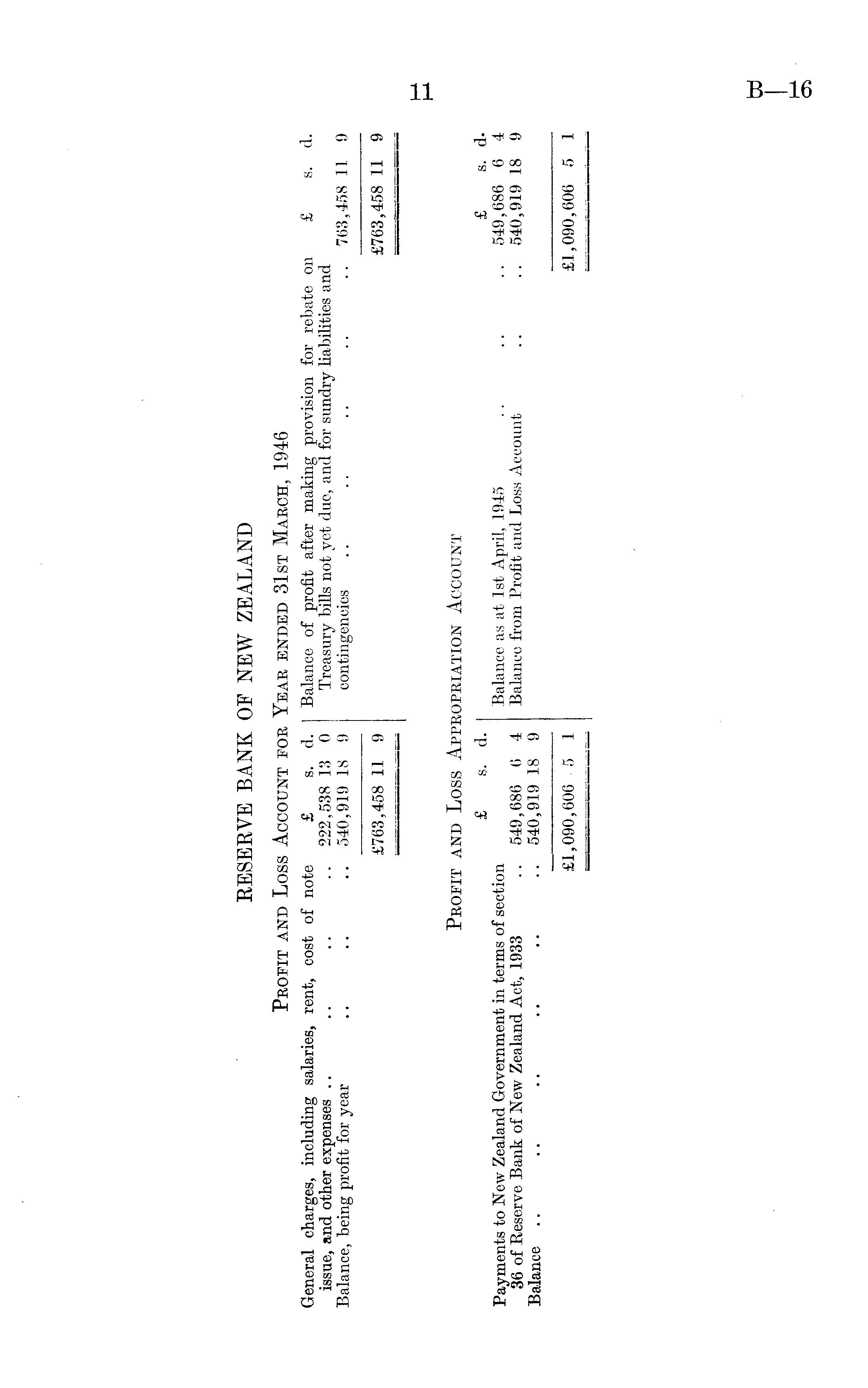 RESERVE BANK OF NEW ZEALAND Profit and Loss Account for Year ended 31st March, 1946 General charges, including salaries, rent, cost of note £ s. d. Balance of profit after making provision for rebate on £ s. d. issue, and other expenses .. .. .. .. 222,538 13 0 Treasury bills not yet due, and for sundry liabilities and Balance, being profit for year .. .. .. 540,919 18 9 contingencies .. .. .. .. .. 763,458 11 9 £763,458 11 9 £763,458 11 9 Profit and Loss Appropriation Account £ s. d. £ s. d. Payments to New Zealand Government in terms of section Balance as at Ist April, 1945 .. .. .. 549,686 6 4 36 of Reserve Bank of New Zealand Act, 1933 .. 549,686 6 4 Balance from Profit and Loss Account .. .. 540,919 18 9 Balance .. .. .. .. .. .. 540,919 18 9 . £1,090,606 5 1 £1,090,606 5 1