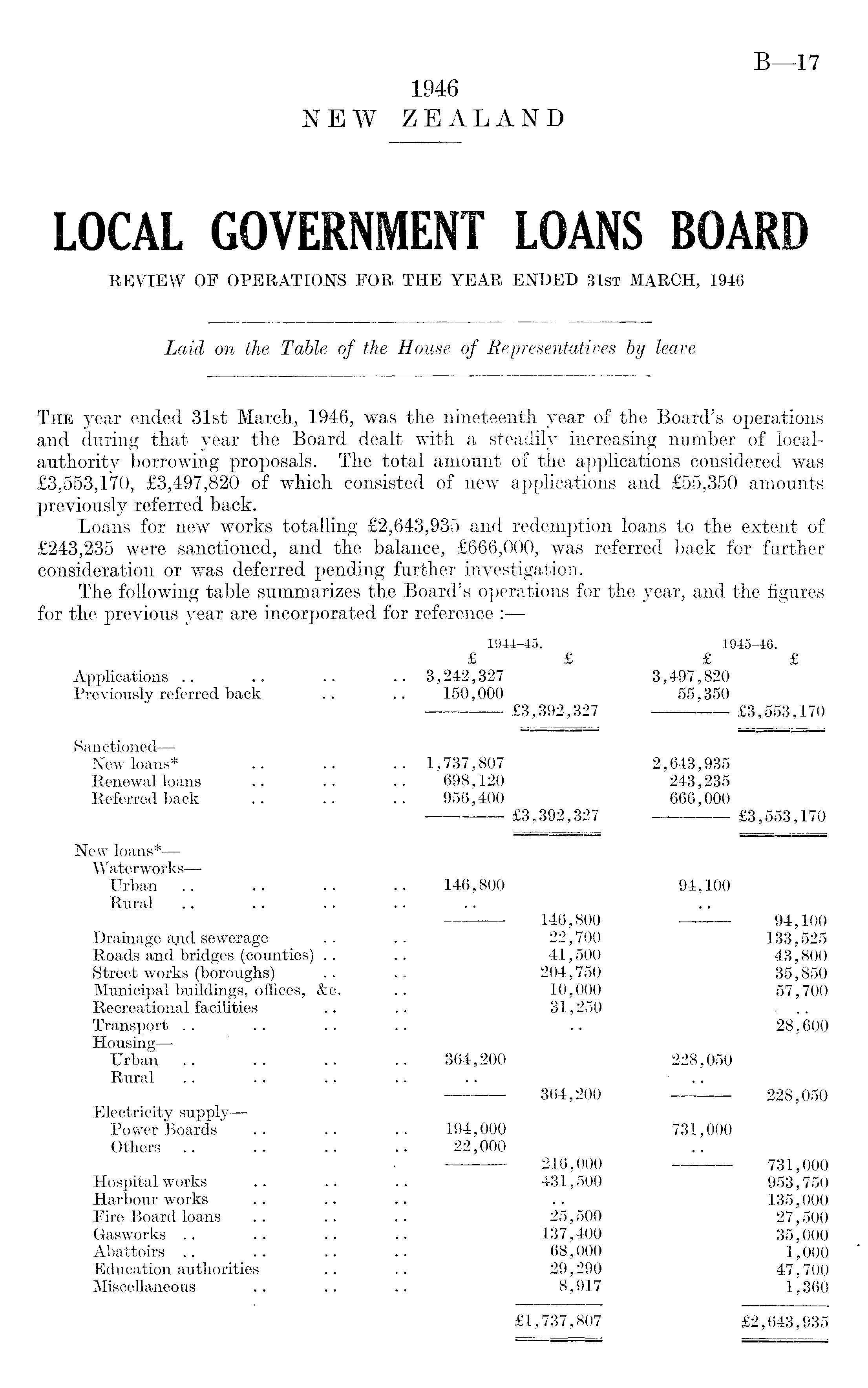 The year ended 31st March, 1946, was the nineteenth year of the Board's operations and during that year the Board dealt with a steadily increasing number of localauthority borrowing proposals. The total amount of the applications considered was £3,553,170, £3,497,820 of which consisted of new applications and £55,350 amounts previously referred back. Loans for new works totalling £2,643,935 and redemption loans to the extent of £243,235 were sanctioned, and the balance, £666,000, was referred back for further consideration or was deferred pending further investigation. The following table summarizes the Board's operations for the year, and the figures for the previous year are incorporated for reference : 1944-45. 1945-46. £ £ £ £ Applications .. .. .. ..3,242,327 3,497,820 Previously referred back .. .. 150,000 55,350 £3,392,327 £3,553,170 Sanctioned —■ New loans* .. .. .. 1,737,807 2,643,935 Renewal loans .. .. .. 698,120 243,235 Referred back .. .. .. 956,400 666,000 £3,392,327 £3,553,170 New loans*— W aterworks — Urban .. .. .. .. 146,800 94,100 Rural .. .... 146,800 94,100 Drainage ajid sewerage .. .. 22,700 133,525 Roads and bridges (counties) .. .. 41,500 43,800 Street works (boroughs) .. .. 204,750 35,850 Municipal buildings, offices, &c. .. 10,000 57,700 Recreational facilities .. .. 31,250 ... Transport .. .. .. .. .. 28,600 Housing—■ Urban .. .. .. .. 364,200 228,050 Rural .. .. .. .. . - » .. 364,200 228,050 Electricity supply— Power Boards .. .. .. 194,000 731,000 Others .. . . .. .. 22,000 216,000 731,000 Hospital works .. .. .. 431,500 953,750 Harbour works .. .. .. .. 135,000 Fire Board loans .. .. .. 25,500 27,500 Gasworks .. .. .. .. 137,400 35,000 Abattoirs .. . . .. .. 68,000 1,000 Education authorities .. .. 29,290 47,700 Miscellaneous .. .. .. 8,917 1,360 £1,737,807 £2,643,935