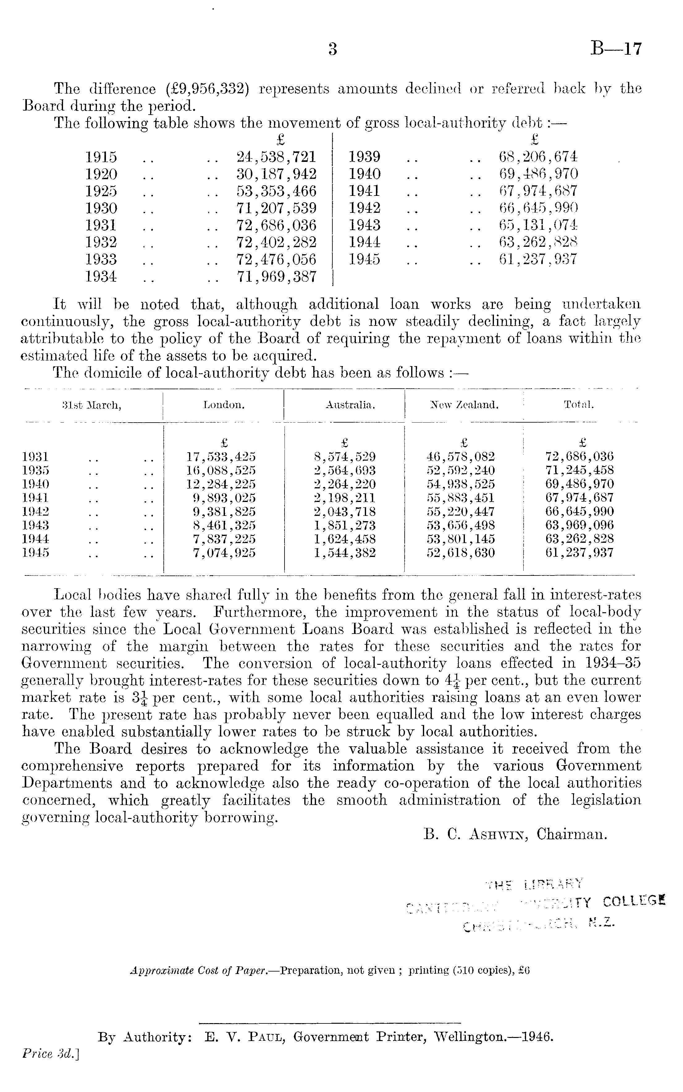 Local bodies have shared fully in the benefits from the general fall in interest-rates ovet the last few years. Furthermore, the improvement in the status of local-body securities since the Local Government Loans Board was established is reflected in the narrowing of the margin between the rates for these securities and the rates for Government securities. The conversion of local-authority loans effected in 1934-35 generally brought interest-rates for these securities down to per cent., but the current market rate is 3J per cent., with some local authorities raising loans at an even lower rate. The present rate has probably never been equalled and the low interest charges have enabled substantially lower rates to be struck by local authorities. The Board desires to acknowledge the valuable assistance it received from the comprehensive reports prepared for its information by the various Government Departments and to acknowledge also the ready co-operation of the local authorities concerned, which greatly facilitates the smooth administration of the legislation governing local-authority borrowing. B. C. Ashwin, Chairman.