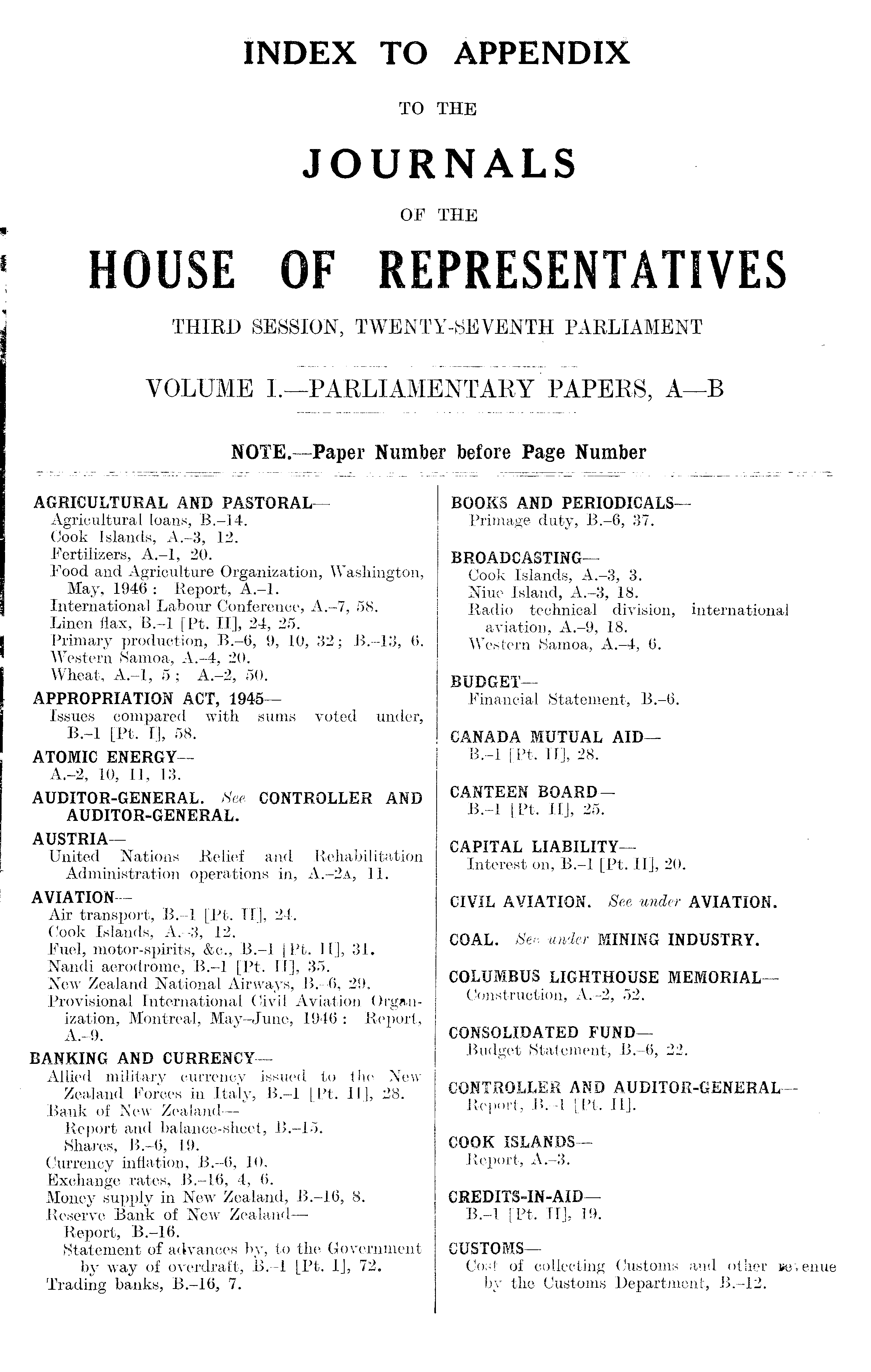 BOOKS AND PERIODICALS— Primage duty, 8.-6, 37. BROADCASTING— Cook Islands, A.-3, 3. Niue Island, A.-3, 18. Radio technical division, international aviation, A.-9, 18. Western Samoa, A.-4, 6. BUDGET— Financial Statement, 8.-6. CANADA MUTUAL AID—-8.-l [Pt. ll], 28. CANTEEN BOARD—-8.-l [Pt. ll], 25. CAPITAL LIABILITY— Interest on, 8.-l [Pt. ll], 20. CIVIL AVIATION. See under AVIATION. COAL. See under MINING INDUSTRY. COLUMBUS LIGHTHOUSE MEMORIAL— Construction, A.-2, 52. CONSOLIDATED FUND— Budget Statement, 8.-6, 22. CONTROLLER AND AUDITOR-GENERAL — Report, 8.-l [Pt. ll]. COOK ISLANDS— Report, A.-3. CREDITS-IN-AID — 8.-l [Pt. ll], 19. CUSTOMS— Cost of collecting Customs and other revenue by the Customs Department, 8.-12.
