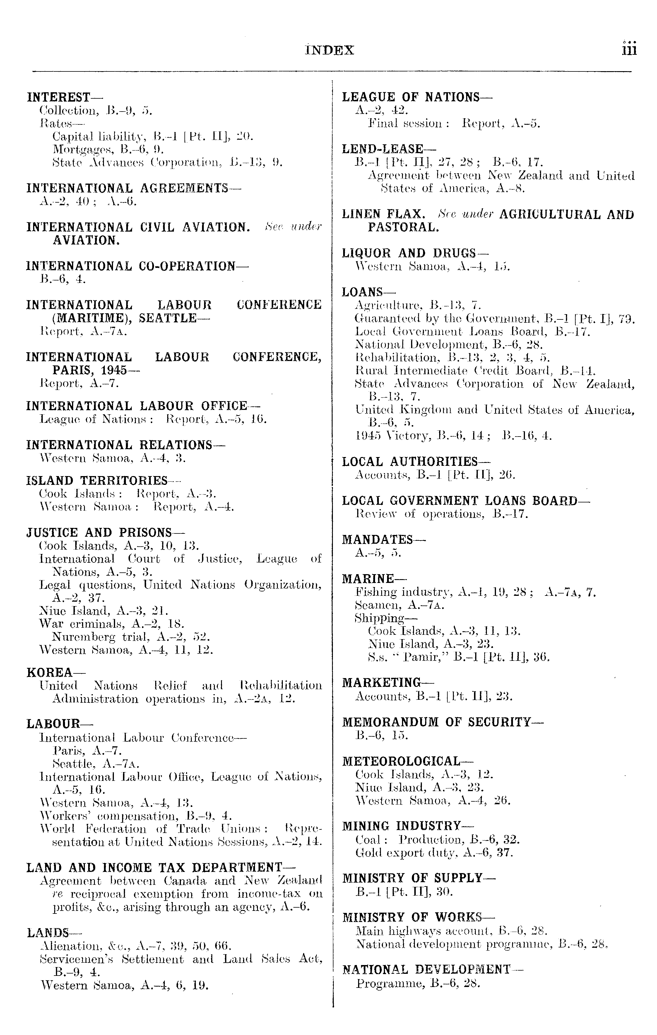 LEAGUE OF NATIONS— A.-2, 42. Final session : Report, A.-5. LEND-LEASE—-8.-l [Pt. ll], 27, 28; 8.-6, 17. Agreement between New Zealand and United States of America, A.-8. LINEN FLAX. See under AGRICULTURAL AND PASTORAL. LIQUOR AND DRUGS— Western Samoa, A.-4, 15. LOANS— Agriculture, 8.-13, 7. Guaranteed by the Government, 8.-l [Pt. I], 79. Local Government Loans Board, 8.-17. National Development, 8.-6, 28. Rehabilitation, 8.-13, 2, 3, 4, 5. Rural Intermediate Credit Board, 8.-14. State Advances Corporation of New Zealand, 8.-13, 7. United Kingdom and United States of America, 8.-6, 5. 1945 Victory, 8.-6, 14 ; 8.-16, 4. LOCAL AUTHORITIES— Accounts, 8.-l [Pt. ll], 26. LOCAL GOVERNMENT LOANS BOARD— Review of operations, 8.-17. MANDATES— A.-5, 5. MARINE— Fishing industry, A.-l, 19, 28 ; A.-7a, 7. Seamen, A.—7a. Shipping— Cook Islands, A.-3, 11, 13. Niue Island, A.-3, 23. S.s. " Pamir," 8.-l [Pt. ll], 36. MARKETING— Accounts, 8.-l [Pt. ll], 23. MEMORANDUM OF SECURITY—-8.-6, 15. METEOROLOGICAL— Cook Islands, A.-3, 12. Niue Island, A.-3, 23. Western Samoa, A.-4, 26. MINING INDUSTRY— Coal: Production, 8.-6, 32. Gold export duty, A.-6, 37. MINISTRY OF SUPPLY—-8.-l [Pt. ll], 30. MINISTRY OF WORKS— Main highways account, 8.-6, 28. National development programme, 8.-6, 28. NATIONAL DEVELOPMENT— Programme, 8.-6, 28.