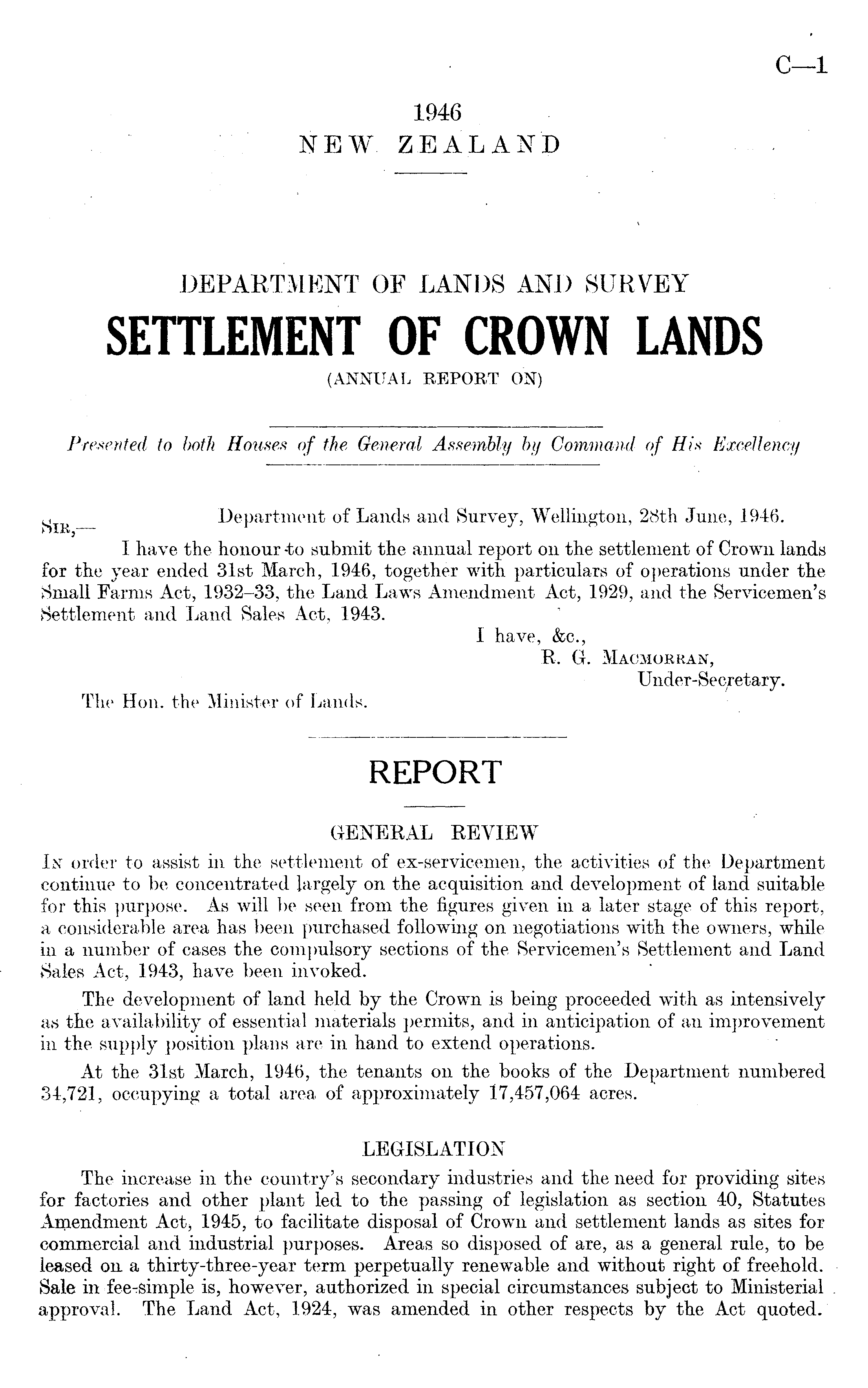 g IR Department of Lands and Survey, Wellington, 28th June, 1946. I have the honour -to submit the annual report on the settlement of Crown lands for the year ended 31st March, 1946, together with particulars of operations under the Small Farms Act, 1932-33, the Land Laws Amendment Act, 1929, and the Servicemen's Settlement and Land Sales Act, 1943. I have, &c., R. G. Macmorran, Under-Secretary. The Hon. the Minister of Lands.