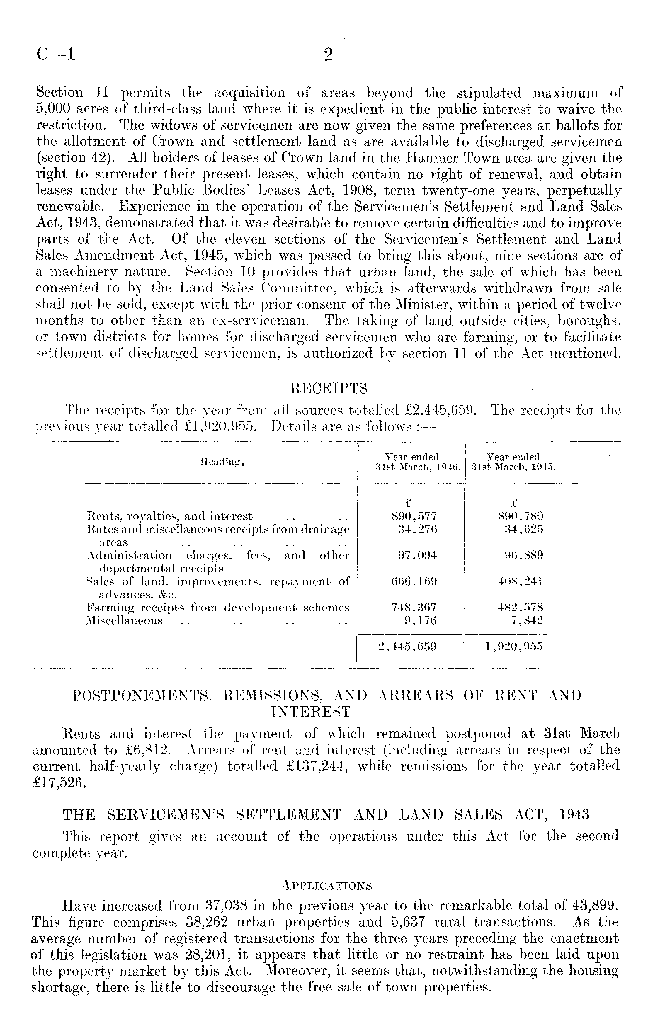 Section 41 permits the acquisition of areas beyond the stipulated maximum of 5,000 acres of third-class land where it is expedient in the public interest to waive the restriction. The widows of servicemen are now given the same preferences at ballots for the allotment of Crown and settlement land as are available to discharged servicemen (section 42), All holders of leases of Crown land in the Hanmer Town area are given the right to surrender their present leases, which contain no right of renewal, and obtain leases under the Public Bodies' Leases Act, 1908, term twenty-one years, perpetually renewable. Experience in the operation of the Servicemen's Settlement and Land Sales Act, 1943, demonstrated that it was desirable to remove certain difficulties and to improve parts of the Act. Of the eleven sections of the Servicemen's Settlement and Land Sales Amendment Act, 1945, which was passed to bring this about, nine sections are of a machinery nature. Section 10 provides that urban land, the sale of which has been consented to by the Land Sales Committee, which is afterwards withdrawn from sale shall not be sold, except with the prior consent of the Minister, within a period of twelve months to other than an ex-serviceman. The taking of land outside cities, boroughs, or town districts for homes for discharged servicemen who are farming, or to facilitate settlement of discharged servicemen, is authorized by section 11 of the Act mentioned. RECEIPTS The receipts for the year from all sources totalled £2,445,659. The receipts for the previous year totalled £1,920,955. Details are as follows :