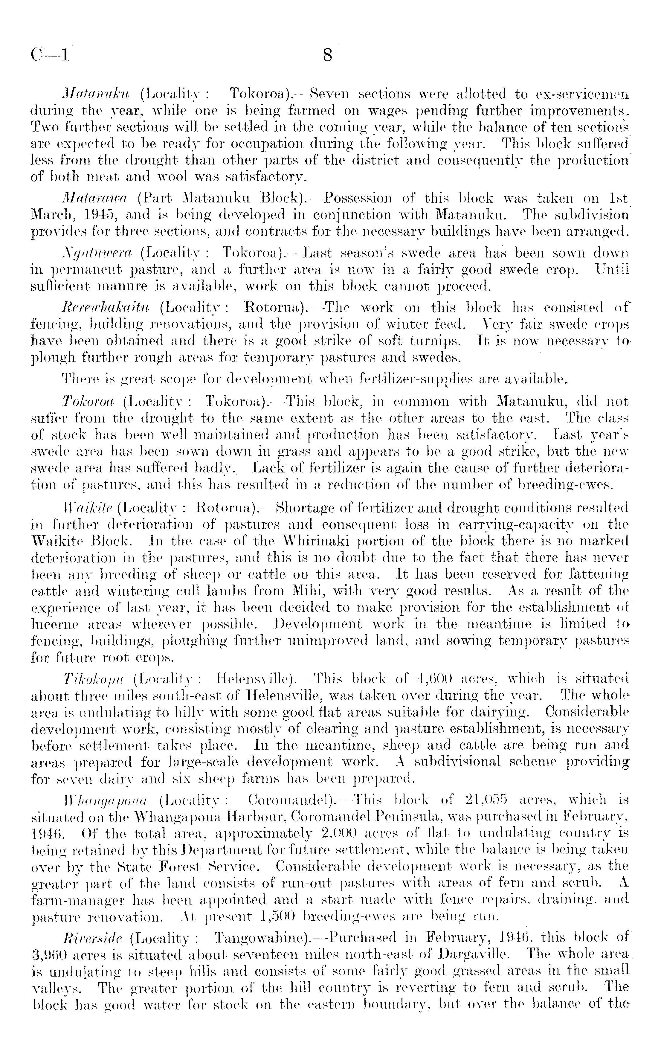 Matanuku (Locality : Tokoroa). —Seven sections were allotted to ex-servicemen during the year, while one is being farmed on wages pending further improvements. Two further sections will be settled in the coming year, while the balance of ten sections are expected to be ready for occupation during the following year. This block suffered less from the drought than other parts of the district and consequently the production of both meat and wool was satisfactory. Matarawa (Part Matanuku Block). —Possession of this block was taken on Ist March, 1945, and is being developed in conjunction with Matanuku. The subdivision provides for three sections, and contracts for the necessary buildings have been arranged. Ngutuwera (Locality : Tokoroa).—Last season's swede area has been sown down in permanent pasture, and a further area is now in a fairly good swede crop. Until sufficient manure is available, work on this block cannot proceed. Rerewhakaitu (Locality: Rotorua). —The work on this block has consisted of fencing, building renovations, and the provision of winter feed. Yery fair swede crops have been obtained and there is a good strike of soft turnips. It is now necessary toplough further rough areas for temporary pastures and swedes. There is great scope for development when fertilizer-supplies are available. Tokoroa (Locality : Tokoroa). —This block, in common with Matanuku, did not suffer from the drought to the same extent as the other areas to the east. The class of stock has been well maintained and production has been satisfactory. Last year's swede area has been sown down in grass and appears to be a good strike, but the new swede area has suffered badly.. Lack of fertilizer is again the cause of further deterioration of pastures, and this has resulted in a reduction of the number of breeding-ewes. Waikite (Locality : Rotorua). —Shortage of fertilizer and drought conditions resulted in further deterioration of pastures and consequent loss in carrying-capacity on the Waikite Block. In the case of the Whirinaki portion of the block there is no marked deterioration in the pastures, and this is no doubt due to the fact that there has never been any breeding of sheep or cattle on this area. It has been reserved for fattening cattle and wintering cull lambs from Mihi, with very good results. As a result of the experience of last year, it has been decided to make provision for the establishment of lucerne areas wherever possible. Development work in the meantime is limited to fencing, buildings, ploughing further unimproved land, and sowing temporary pastures for future root crops. Tikokopu (Locality : Helensville). —This block of 4,600 acres, which is situated about three miles south-east of Helensville, was taken over during the year. The whole area is undulating to hilly with some good flat areas suitable for dairying. Considerable development work, consisting mostly of clearing and pasture establishment, is necessary before settlement takes place. In the meantime, sheep and cattle are being run and areas prepared for large-scale development work. A subdivisional scheme providing for seven dairy and six sheep farms has been prepared. Whangapoua (Locality: Coromandel). —This block of 21,055 acres, which is situated on the Whangapoua Harbour, Coromandel Peninsula, was purchased in February, 1946. Of the total area, approximately 2,000 acres of flat to undulating country is being retained by this Department for future settlement, while the balance is being taken over by the State Forest Service. Considerable development work is necessary, as the greater part of the land consists of run-out pastures with areas of fern and scrub. A farm-manager has been appointed and a start made with fence repairs, draining, and pasture renovation. At present 1,500 breeding-ewes are being run. Riverside (Locality : Tangowahine). —Purchased in February, 1946, this block of 3,960 acres is situated about seventeen miles north-east of Dargaville. The whole area. is undulating to steep hills and consists of some fairly good grassed areas in the small valleys. The greater portion of the hill country is reverting to fern and scrub. The block has good water for stock on the eastern boundary, but over the balance of the'