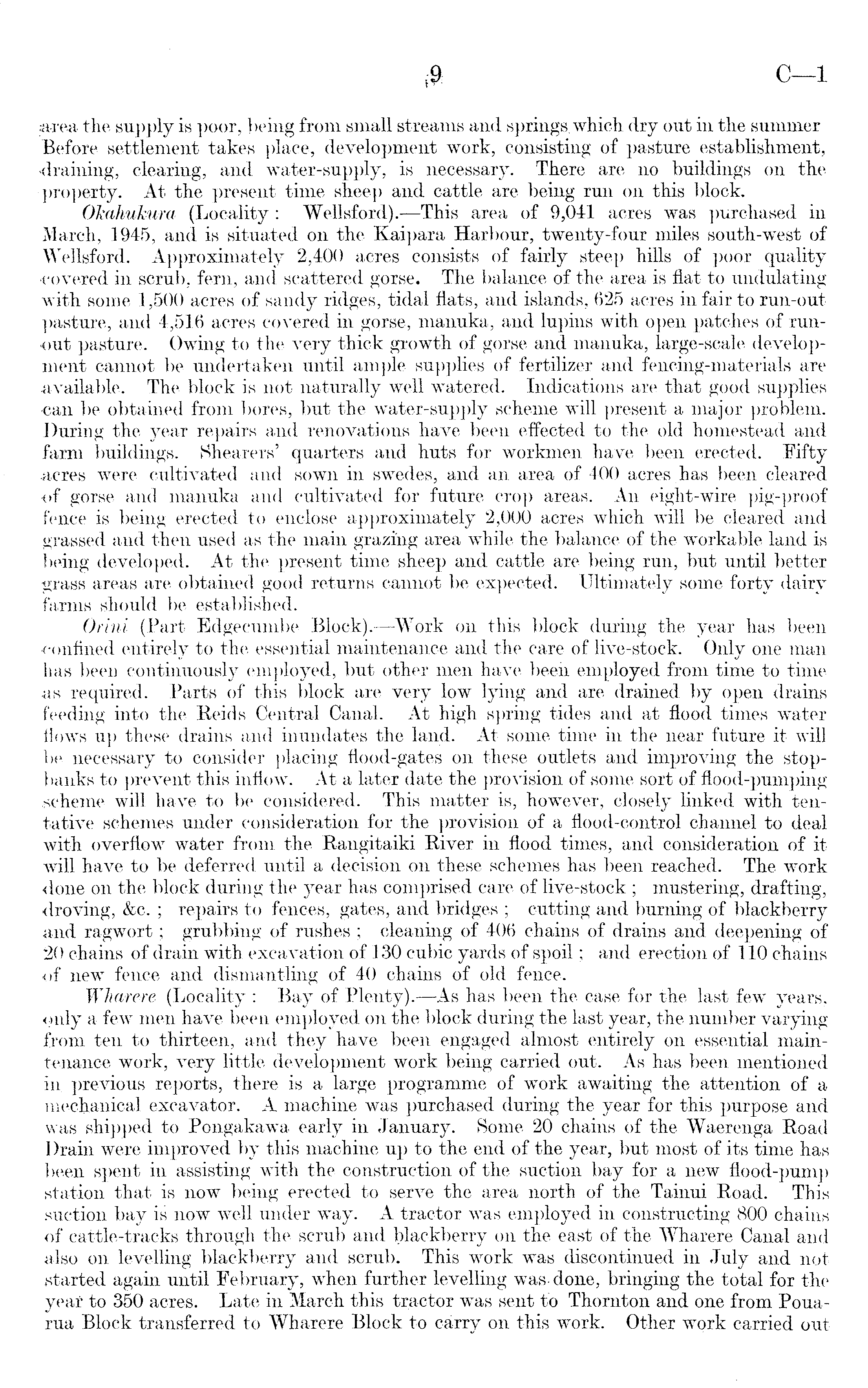area the supply is poor, being from small streams and springs, which dry out in the summer Before settlement takes place, development work, consisting of pasture establishment, draining, clearing, and water-supply, is necessary. There are no buildings on the property. At the present time sheep and cattle are being run 011 this block, OTcahulcura (Locality : Wellsford). —This area of 9,041 acres was purchased in March, 1945, and is situated on the Kaipara Harbour, twenty-four miles south-west of Wellsford. Approximately 2,400 acres consists of fairly steep hills of poor quality ■covered in scrub, fern, and scattered gorse. The balance of the area is flat to undulating with some 1,500 acres of sandy ridges, tidal flats, and islands, 625 acres in fair to run-out pasture, and 4,516 acres covered in gorse, manuka, and lupins with open patches of runout pasture. Owing to the very thick growth of gorse and manuka, large-scale development cannot be undertaken until ample supplies of fertilizer and fencing-materials are available. The block is not naturally well watered. Indications are that good supplies •can be obtained from bores, but the water-supply scheme will present a major problem. During the year repairs and renovations have been effected to the old homestead and farm buildings. Shearers' quarters and huts for workmen have been erected. Fifty acres were cultivated and sown in swedes, and an area of 400 acres has been cleared ■of gorse and manuka and cultivated for future crop areas. An eight-wire pig-proof fence is being erected to enclose approximately 2,000 acres which will be cleared and grassed and then used as the main grazing area while the balance of the workable land is being developed. At the present time sheep and cattle are being run, but until better grass areas are obtained good returns cannot be expected. Ultimately some forty dairy farms should be established. Orini (Part Edgecumbe Block). —Work on this block during the year has been confined entirely to the essential maintenance and the care of live-stock. Only one man has been continuously employed, but other men have been employed from time to time as required. Parts of this block are very low lying and are drained by open drains feeding into the Reids Central Canal. At high spring tides and at flood times Water flows up these drains and inundates the land. At some time in the near future it will be necessary to consider placing flood-gates on these outlets and improving the stopbanks to prevent this inflow. At a later date the provision of some sort of flood-pumping scheme will have to be considered. This matter is, however, closely linked with tentative schemes under consideration for the provision of a flood-control channel to deal with overflow water from the Rangitaiki River in flood times, and consideration of it will have to be deferred until a decision on these schemes has been reached. The work done on the block during the year has comprised care of live-stock ; mustering, drafting, droving, &c. ; repairs to fences, gates, and bridges ; cutting and burning of blackberry and ragwort; grubbing of rushes ; cleaning of 406 chains of drains and deepening of 20 chains of drain with excavation of 130 cubic yards of spoil; and erection of 110 chains of new fence and dismantling of 40 chains of old fence. Wharere (Locality : Bay of Plenty). —As has been the case for the last few years, ■only a few men have been employed on the block during the last year, the number varying from ten to thirteen, and they have been engaged almost entirely on essential maintenance work, very little development work being carried out. As has been mentioned in. previous reports, there is a large programme of work awaiting the attention of a mechanical excavator. A machine was purchased during the year for this purpose and was shipped to Pongakawa early in January. Some 20 chains of the Waerenga Road Drain were improved by this machine up to the end of the year, but most of its time has been spent in assisting with the construction of the suction bay for a new flood-pump station that is now being erected to serve the area north of the Tainui Road. This suction bay is now well under way. A tractor was employed in constructing 800 chains of cattle-tracks through the scrub and blackberry on the east of the Wharere Canal and also on levelling blackberry and scrub. This work was discontinued in July and not started again until February, when further levelling was- done, bringing the total for the year to 350 acres. Late in March this tractor was sent to Thornton and one from Pouarua Block transferred to Wharere Block to carry on this work. Other work carried out
