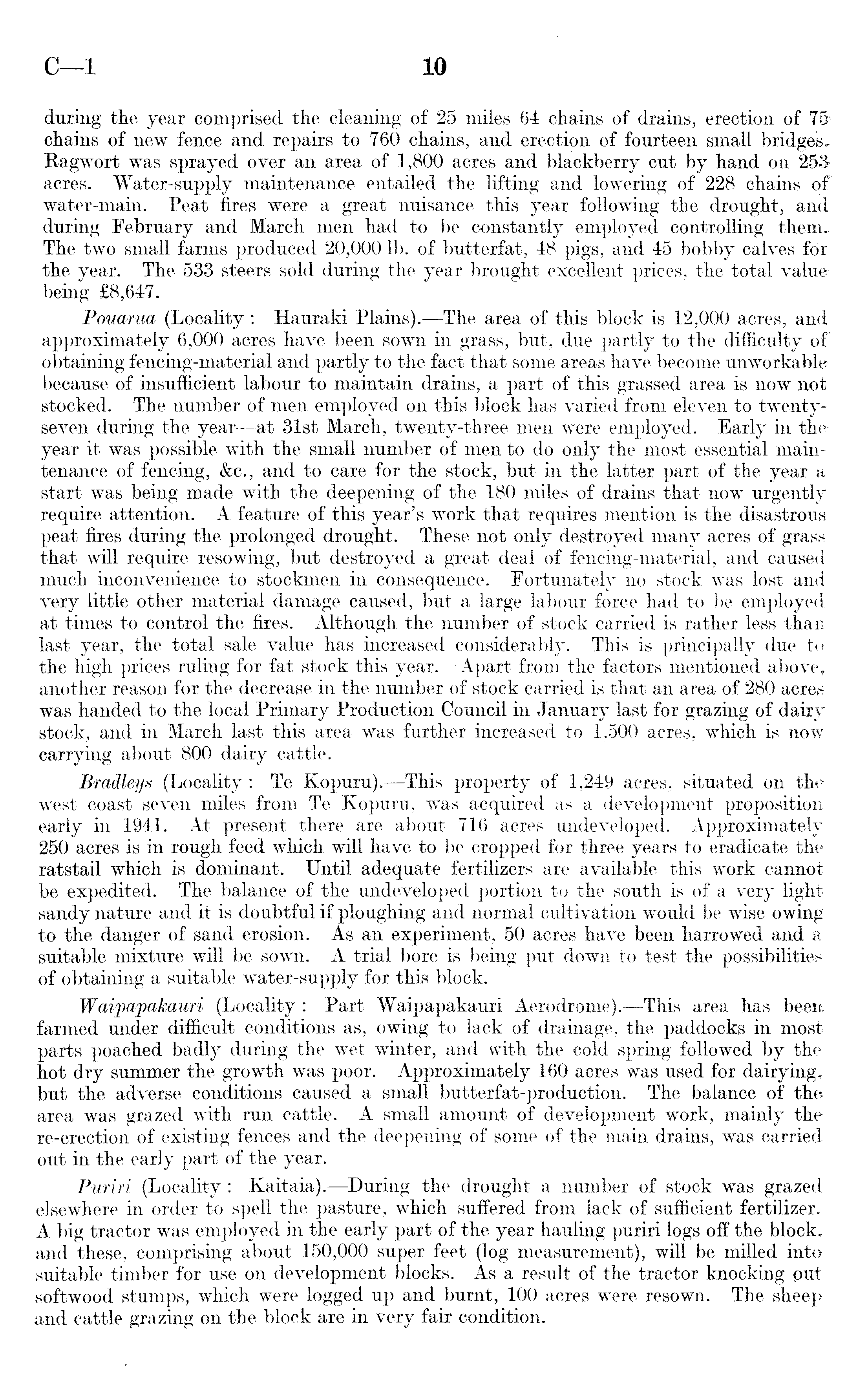 during the year comprised the cleaning of 25 miles 64 chains of drains, erection of 75 chains of new fence and repairs to 760 chains, and erection of fourteen small bridges. Ragwort was sprayed over an area of 1,800 acres and blackberry cut by hand on 253 acres. Water-supply maintenance entailed the lifting and lowering of 228 chains of water-main. Peat fires were a great nuisance this year following the drought, and during February and March men had to be constantly employed controlling them. The two small farms produced 20,000 lb. of butterfat, 48 pigs, and 45 bobby calves for the year. The 533 steers sold during the year brought excellent prices, the total value being £8,647. Pouarua (Locality : Hauraki Plains). —The area of this block is 12,000 acres, and approximately 6,000 acres have been sown in grass, but, due partly to the difficulty of obtaining fencing-material and partly to the fact that some areas have become unworkable because of insufficient labour to maintain drains, a part of this grassed area is now not stocked. The number of men employed on this block has varied from eleven to twentyseven during the year —at 31st March, twenty-three men were employed. Early in the year it was possible with the small number of men to do only the most essential maintenance of fencing, &c., and to care for the stock, but in the latter part of the year a start was being made with the deepening of the 180 miles of drains that now urgently require attention. A feature of this year's work that requires mention is the disastrous peat fires during the prolonged drought. These not only destroyed many acres of grass that will require resowing, but destroyed a great deal of fencing-material, and caused much inconvenience to stockmen in consequence. Fortunately no stock was lost and very little other material damage caused, but a large labour force had to be employed at times to control the fires. Although the number of stock carried is rather less than last year, the total sale value has increased considerably. This is principally due to the high prices ruling for fat stock this year. Apart from the factors mentioned above, another reason for the decrease in the number of stock carried is that an area of 280 acres was handed to the local Primary Production Council in January last for grazing of dairy stock, and in March last this area was further increased to 1,500 acres, which is now carrying about 800 dairy cattle. Bradleys (Locality : Te Kopuru).—This property of 1,249 acres, situated on the west coast seven miles from Te Kopuru, was acquired as a development proposition early in 1941. At present there are about 716 acres undeveloped. Approximately 250 acres is in rough feed which will have to be cropped for three years to eradicate the ratstail which is dominant. Until adequate fertilizers are available this work cannot be expedited. The balance of the undeveloped portion to the south is of a very light sandy nature and it is doubtful if ploughing and normal cultivation would be wise owing to the danger of sand erosion. As an experiment, 50 acres have been harrowed and a suitable mixture will be sown. A trial bore is being put down to test the possibilities of obtaining a suitable water-supply for this block. WaipapaJcauri (Locality : Part Waipapakauri Aerodrome). —This area has been farmed under difficult conditions as, owing to lack of drainage, the paddocks in most parts poached badly during the wet winter, and with the cold spring followed by the hot dry summer the growth was poor. Approximately 160 acres was used for dairying, ' but the adverse conditions caused a small butterfat-production. The balance of the area was grazed with run cattle. A small amount of development work, mainly the re-erection of existing fences and the deepening of some of the main drains, was carried out in the early part of the year. Puriri (Locality : Kaitaia). —During the drought a number of stock was grazed elsewhere in order to spell the pasture, which suffered from lack of sufficient fertilizer. A big tractor was employed in the early part of the year hauling puriri logs off the block, and these, comprising about 150,000 super feet (log measurement), will be milled into suitable timber for use on development blocks. As a result of the tractor knocking put softwood stumps, which were logged up and burnt, 100 acres were resown. The sheep and cattle grazing on the block are in very fair condition.