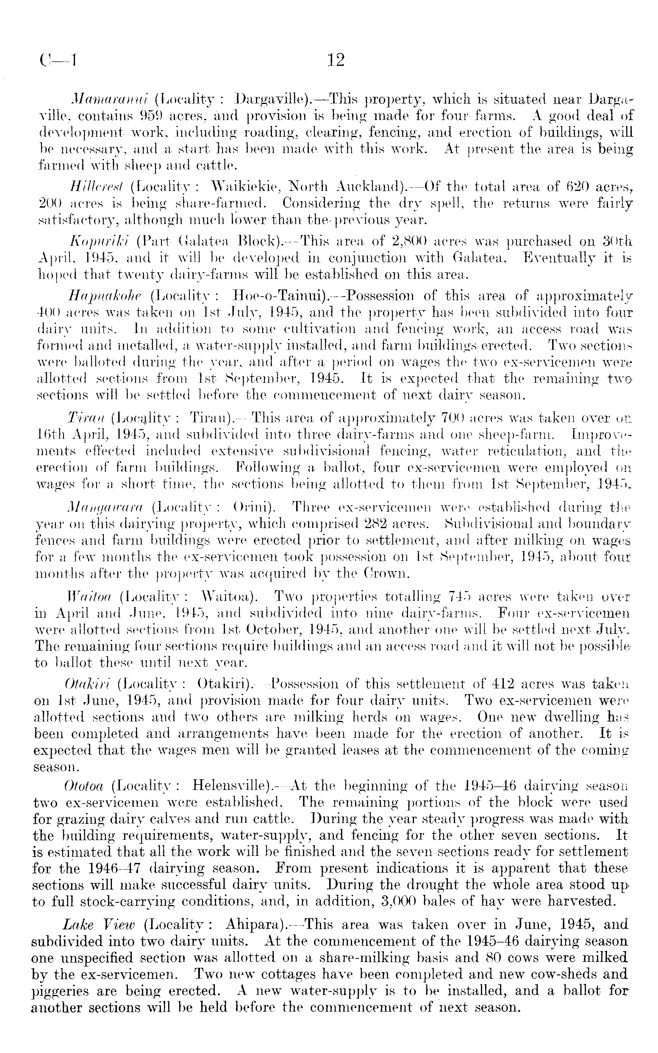 Mamaranui (Locality : Dargaville).—This property, which is situated near Dargaville, contains 959 acres, and provision is being made for four farms. A good deal of development work, including roading, clearing, fencing, and erection of buildings, will be necessary, and a start has been made with this work. At present the area is being farmed with sheep and cattle. Hillcrest (Locality : Waikiekie, North Auckland). —Of the total area of 620 acres, 200 acres is being share-farmed. Considering the dry spell, the returns were fairly satisfactory, although much lower than previous year. Kopuriki (Part Galatea Block). —This area of 2,800-acres was purchased on 30th April, 1945, and it will be developed in conjunction with Galatea. Eventually it is hoped that twenty dairy-farms will be established on this area. Ha/puakohe (Locality : Hoe-o-Tainui). —Possession of this area of approximately 400 acres was taken on Ist July, 1945, and the property has been subdivided into four dairy units. In addition to some cultivation and fencing work, an access road was formed and metalled, a water-supply installed, and farm buildings erected. Two sections were balloted during the year, and after a period on wages the two ex-servicemen were allotted sections from Ist September, 1945. It is expected that the remaining two sections will be settled before the commencement of next dairy season. Tirau (Locality : Tirau). —This area of approximately 700 acres was taken over on 16th April, 1945, and subdivided into three dairy-farms and one sheep-farm. Improvements effected included extensive subdivisional fencing, water reticulation, and the erection of farm buildings. Following a ballot, four ex-servicemen were employed on wages for a short time, the sections being allotted to them from Ist September, 1945. Mangawara (Locality : Orini). —Three ex-servicemen were established during the year on this dairying property, which comprised 282 acres. Subdivisional and boundary fences and farm buildings were erected prior to settlement, and after milking on wages for a few months the ex-servicemen took possession on Ist September, 1945, about four months after the property was acquired by the Crown. Waitoa (Locality : Waitoa). —Two properties totalling 745 acres were taken over in April and June, 1945, and subdivided into nine dairy-farms. Four ex-servicemen were allotted sections from Ist October, 1945, and another one will be settled next July. The remaining four sections require buildings and an access road and it will not be possible to, ballot these until next year. Otakiri (Locality : Otakiri). —Possession of this settlement of 412 acres was taken on Ist June, 1945, and provision made for four dairy units. Two ex-servicemen were allotted sections and two others are milking herds on wages. One new dwelling has been completed and arrangements have been made for the erection of another. It is expected that the wages men will be granted leases at the commencement of the coming season. Ototoa (Locality : Helensville). —At the beginning of the 1945-46 dairying season two ex-servicemen were established. The remaining portions of the block were used for grazing dairy calves and run cattle. During the year steady progress was made with the building requirements, water-supply, and fencing for the other seven sections. It is estimated that all the work will be finished and the seven sections ready for settlement for the 1946-47 dairying season. From present indications it is apparent that these sections will make successful dairy units. During the drought the whole area stood up to full stock-carrying conditions, and, in addition, 3,000 bales of hay were harvested. Lake View (Locality : Ahipara).—This area was taken over in June, 1945, and subdivided into two dairy units. At the commencement of the 1945-46 dairying season one unspecified section was allotted on a share-milking basis and 80 cows were milked by the ex-servicemen. Two new cottages have been completed and new cow-sheds and piggeries are being erected. A new water-supply is to be installed, and a ballot for another sections will be held before the commencement of next season.