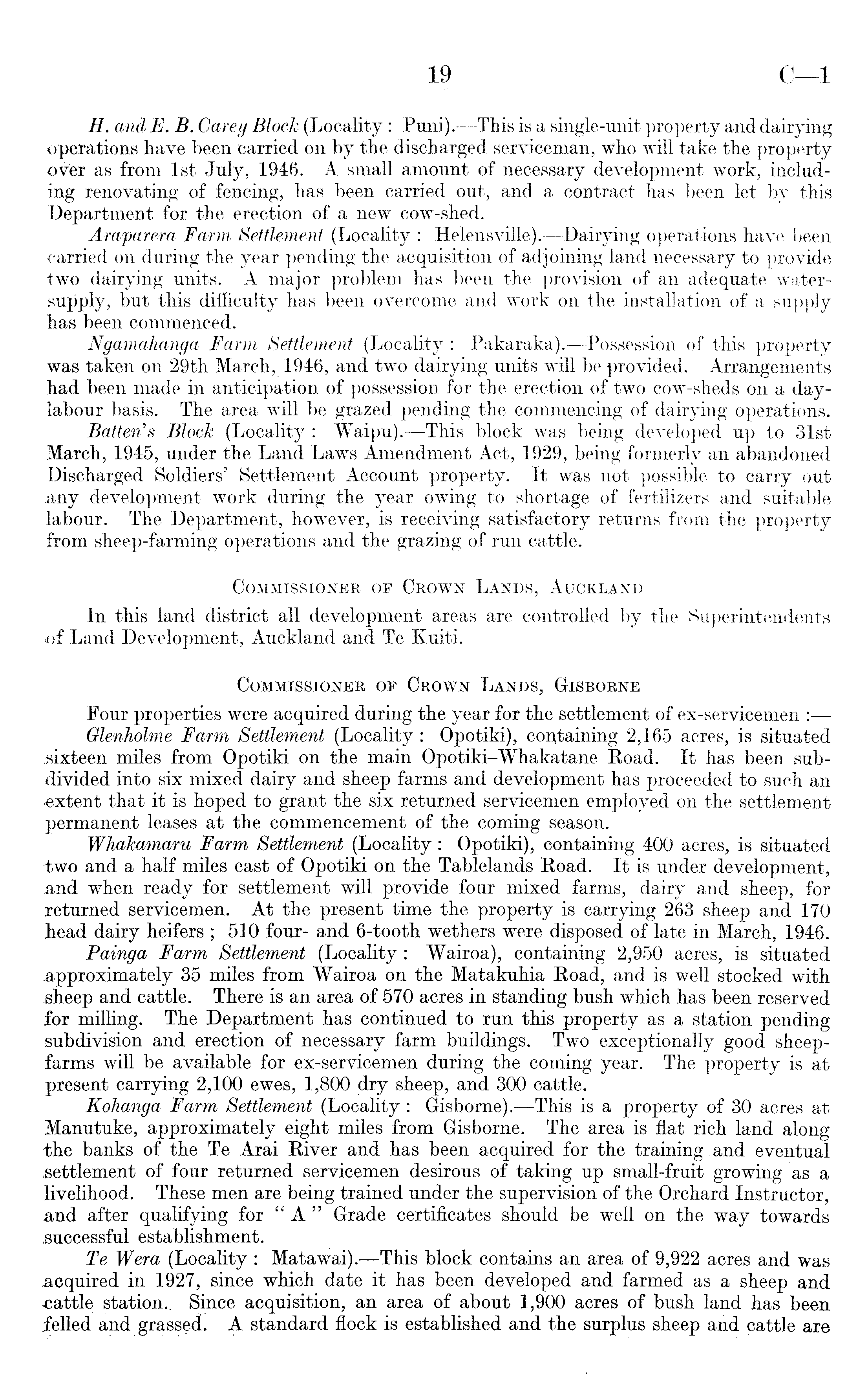 H. and E. B. Carey Block (Locality: Puni).—This is a single-unit property and dairying operations have been carried on by the discharged serviceman, who will take the property over as from Ist July, 1946. A small amount of necessary development work, including renovating of fencing, has been carried oift, and a contract has been let by this Department for the erection of a new cow-shed. Araparera Farm Settlement (Locality : Helensville). —Dairying operations have been carried on during the year pending the acquisition of adjoining land necessary to provide two dairying units. A major problem has been the provision of an adequate watersupply, but this difficulty has been overcome and work on the installation of a supply has been commenced. Ngamahanga Farm Settlement (Locality : Pakaraka). —Possession of this property was taken on 29th March, 1946, and two dairying units will be provided. Arrangements had been made in anticipation of possession for the erection of two cow-sheds on a daylabour basis. The area will be grazed pending the commencing of dairying operations. Batten's Block (Locality : Waipu).—This block was being developed up to 31st March, 1945, under the Land Laws Amendment Act, 1929, being formerly an abandoned Discharged Soldiers' Settlement Account property. It was not possible to carry out any development work during the year owing to shortage of fertilizers and suitable labour. The Department, however, is receiving satisfactory returns from the property from sheep-farming operations and the grazing of run cattle. Commissioner of Crown Lands, Auckland In this land district all development areas are controlled by the Superintendents of Land Development, Auckland and Te Kuiti. Commissioner of Crown Lands, Gisborne Four properties were acquired during the year for the settlement of ex-servicemen : Glenholme Farm Settlement (Locality: Opotiki), containing 2,165 acres, is situated sixteen miles from Opotiki on the main Opotiki-Whakatane Road. It has been subdivided into six mixed dairy and sheep farms and development has proceeded to such an ■extent that it is hoped to grant the six returned servicemen employed on the settlement permanent leases at the commencement of the coming season. Whakamaru Farm Settlement (Locality : Opotiki), containing 400 acres, is situated -two and a half miles east of Opotiki on the Tablelands Road. It is under development, and when ready for settlement will provide four mixed farms, dairy and sheep, for returned servicemen. At the present time the property is carrying 263 sheep and 170 head dairy heifers ; 510 four- and 6-tooth wethers were disposed of late in March, 1946. Painga Farm Settlement (Locality: Wairoa), containing 2,950 acres, is situated approximately 35 miles from Wairoa on the Matakuhia Road, and is well stocked with sheep and cattle. There is an area of 570 acres in standing bush which has been reserved for milling. The Department has continued to run this property as a station pending subdivision and erection of necessary farm buildings. Two exceptionally good sheepfarms will be available for ex-servicemen during the coming year. The property is at present carrying 2,100 ewes, 1,800 dry sheep, and 300 cattle. Kohanga Farm Settlement (Locality : Gisborne). —This is a property of 30 acres at Manutuke, approximately eight miles from Gisborne. The area is flat rich land along the banks of the Te Arai River and has been acquired for the training , and eventual .settlement of four returned servicemen desirous of taking up small-fruit growing as a livelihood. These men are being trained under the supervision of the Orchard Instructor, and after qualifying for "A" Grade certificates should be well on the way towards successful establishment. Te Wera (Locality : Matawai). —This block contains an area of 9,922 acres and was acquired in 1927, since which date it has been developed and farmed as a sheep and •cattle station.. Since acquisition, an area of about 1,900 acres of bush land has been felled and grassed. A standard flock is established and the surplus sheep and cattle are