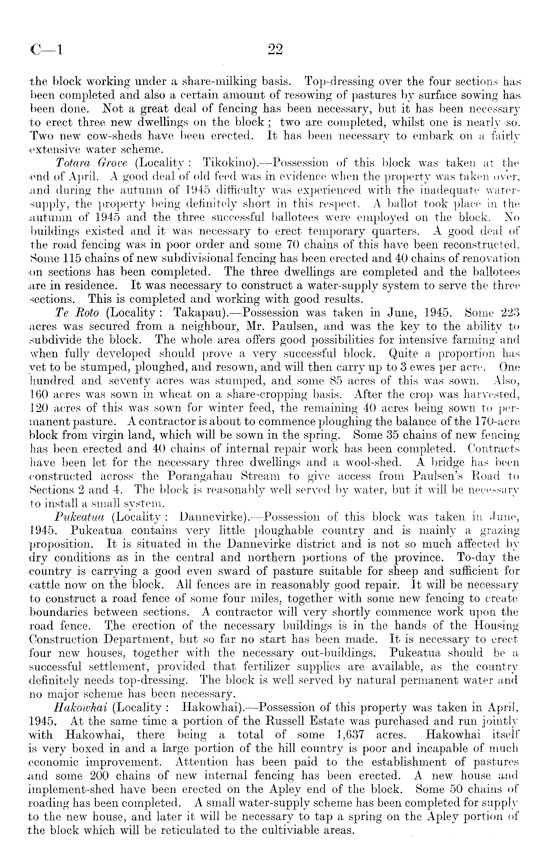 the block working under a share-milking basis. Top-dressing over the four sections has been completed and also a certain amount of resowing of pastures by surface sowing has been done. Not a great deal of fencing has been necessary, but it has been necessary to erect three new dwellings on the block ; two are completed, whilst one is nearly so. Two new cow-sheds have been erected. It has been necessary to embark on a fairly extensive water scheme. Totara Grove (Locality : Tikokino). —Possession of this block was taken at the ■end of April. A good deal of old feed was in evidence when the property was taken over, and during the autumn of 1945 difficulty was experienced with the inadequate watersupply, the property being definitely short in this respect. A ballot took place in the autumn of 1945 and the three successful ballotees were employed on the block. No buildings existed and it was necessary to erect temporary quarters. A good deal of the road fencing was in poor order and some 70 chains of this have been reconstructed. Some 115 chains of new subdivisional fencing has been erected and 40 chains of renovation •on sections has been completed. The three dwellings are completed and the ballotees are in residence. It was necessary to construct a water-supply system to serve the three sections. This is completed and working with good results. Te Roto (Locality : Takapau).—Possession was taken in June, 1945. Some 223 acres was secured from a neighbour, Mr. Paulsen, and was the key to the ability to subdivide the block. The whole area offers good possibilities for intensive farming and when fully developed should prove a very successful block. Quite a proportion has yet to be stumped, ploughed, and resown, and will then carry up to 3 ewes per acre. One hundred and seventy acres was stumped, and some 85 acres of this was sown. Also, 160 acres was sown in wheat on a share-cropping basis. After the crop was harvested, 120 acres of this was sown for winter feed, the remaining 40 acres being sown to permanent pasture. A contractor is about to commence ploughing the balance of the 170-acre block from virgin land, which will be sown in the spring. Some 35 chains of new fencing has been erected and 40 chains of internal repair work has been completed. Contracts have been let for the necessary three dwellings and a wool-shed. A bridge has been •constructed across the Porangahau Stream to give access from Paulsen's Road to Sections 2 and 4. The block is reasonably well served by water, but it will be necessary to install a small system. Pukeatua (Locality : Dannevirke). —Possession of this block was taken in June, 1945. Pukeatua contains very little ploughable country and is mainly a grazing proposition. It is situated in the Dannevirke district and is not so much affected by dry conditions as in the central and northern portions of the province. To-day the country is carrying a good even sward of pasture suitable for sheep and sufficient for cattle now on the block. All fences are in reasonably good repair. It will be necessary to construct a road fence of some four miles, together with some new fencing to create Boundaries between sections. A contractor will very shortly commence work upon the road fence. T,he erection of the necessary buildings is in the hands of the Housing Construction Department, but so far no start has been made. It is necessary to erect four new houses, together with the necessary out-buildings. Pukeatua should be a successful settlement, provided that fertilizer supplies are available, as the country definitely needs top-dressing. The block is well served by natural permanent water and no major scheme has been necessary. Hakowhai (Locality : Hakowhai). —Possession of this property was taken in April, 1945. At the same time a portion of the Russell Estate was purchased and run jointly with Hakowhai, there being a total of some 1,637 acres. Hakowhai itself is very boxed in and a large portion of the hill country is poor and incapable of much economic improvement. Attention has been paid to the establishment of pastures and some 200 chains of new internal fencing has been erected. A new house and implement-shed have been erected on the Apley end of the block. Some 50 chains of roading has been completed. A small water-supply scheme has been completed for supply to the new house, and later it will be necessary to tap a spring on the Apley portion of the block which will be reticulated to the cultiviable areas.