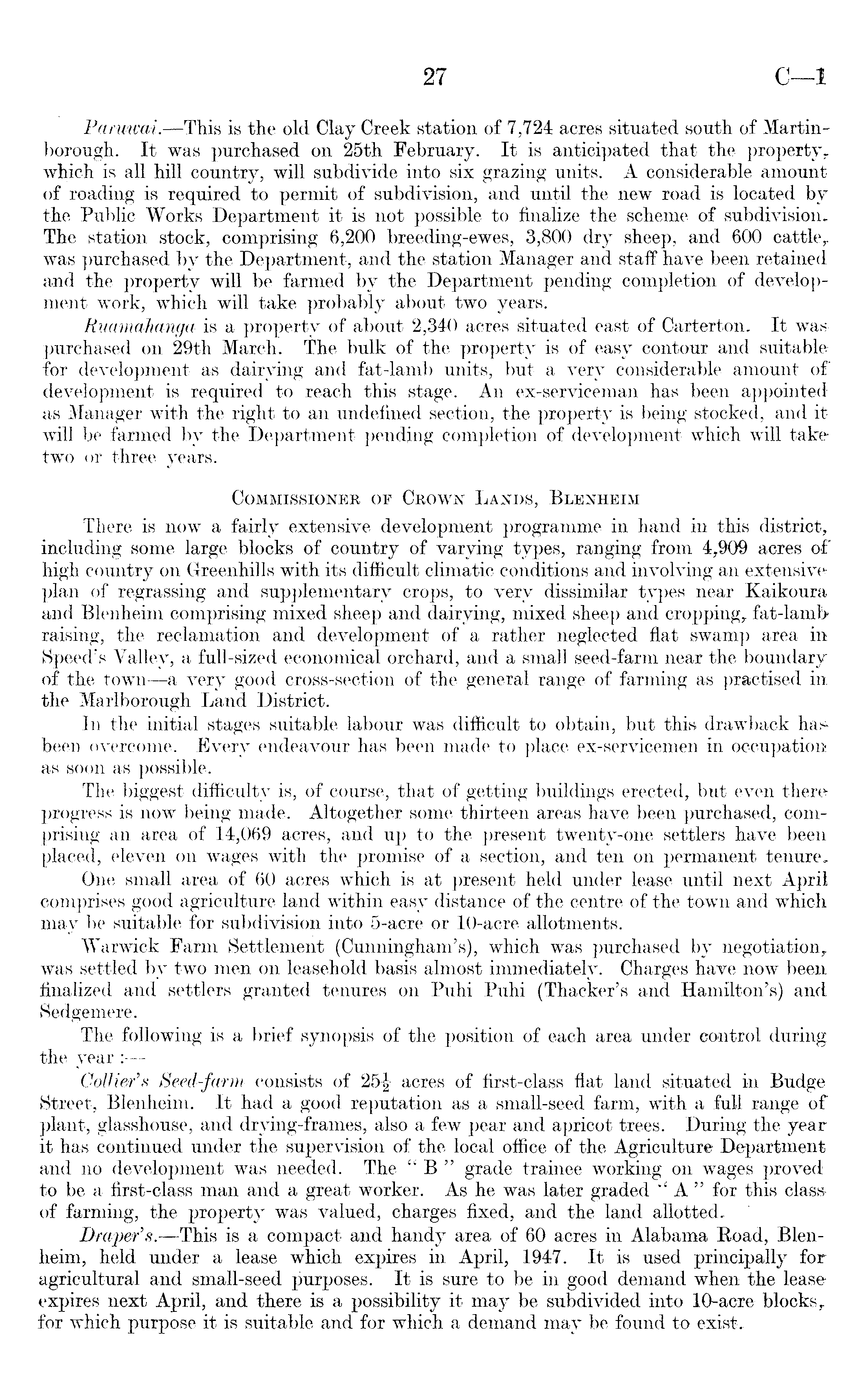 Parmvai. —This is the old Clay Creek station of 7,724 acres situated south of Martinborough. It was purchased on 25th February. It is anticipated that the property,, which is all hill country, will subdivide into six grazing units. A considerable amount of roading is required to permit of subdivision, and until the new road is located by the Public Works Department it is not possible to finalize the scheme of subdivision. The station stock, comprising 6,200 breeding-ewes, 3,800 dry sheep, and 600 cattle r was purchased by the Department, and the station Manager and staff have been retained and the property will be farmed by the Department pending completion of development work, which will take probably about two years. Ruamahanga is a property of about 2,340 acres situated east of Carterton. It was purchased on 29th March. The bulk of the property is of easy contour and suitable for development as dairying and fat-lamb units, but a very considerable amount of development is required to reach this stag?. An ex-serviceman has been appointed as Manager with the right to an undefined section, the property is being stocked, and it will be farmed by the Department pending completion of development which will take two or three years. Commissioner of Crown Lands, Blenheim There is now a fairly extensive development programme in hand in this district, including some large blocks of country of varying types, ranging from 4,909 acres of high country on Greenhills with its difficult climatic conditions and involving an extensive plan of regrassing and supplementary crops, to very dissimilar types near Kaikoura and Blenheim comprising mixed sheep and dairying, mixed sheep and cropping, fat-lamb raising, the reclamation and development of a rather neglected flat swamp area in Speed's Valley, a full-sized economical orchard, and a small seed-farm near the boundary of the town—a very good cross-section of the general range of farming as practised in the Marlborough Land District. In the initial stages suitable labour was difficult to obtain, but this drawback has been overcome. Every endeavour has been made to place ex-servicemen in occupation as soon as possible. The biggest difficulty is, of course, that of getting buildings erected, but even there progress is now being made. Altogether some thirteen areas have been purchased, comprising an area of 14,069 acres, and up to the present twenty-one settlers have been placed, eleven on wages with the promise of a section, and ten on permanent tenure. One small area of 60 acres which is at present held under lease until next April comprises good agriculture land within easy distance of the centre of the town and which may be suitable for subdivision into 5-acre or 10-acre allotments. Warwick Farm Settlement (Cunningham's), which was purchased by negotiation, was settled by two men on leasehold basis almost immediately. Charges have now been finalized and settlers granted tenures on Puhi Puhi (Thacker's and Hamilton's) and Sedgemere. The following is a brief synopsis of the position of each area under control during the year:— Collier's Seed-farm consists of acres of first-class flat land situated in Budge Street, Blenheim. It had a good reputation as a small-seed farm, with a full range of plant, glasshouse, and drying-frames, also a few pear and apricot trees. During the year it has continued under the supervision of the local office of the Agriculture Department and no development was needed. The "B " grade trainee working on wages proved to be a first-class man and a great worker. As he was later graded "A " for this classof farming, the property was valued, charges fixed, and the land allotted. Draper's. —This is a compact and handy area of 60 acres in Alabama Eoad, Blenheim, held under a lease which expires in April, 1947. It is used principally for agricultural and small-seed purposes. It is sure to be in good demand when the lease expires next April, and there is a possibility it may be subdivided into 10-acre blocks, for which purpose it is suitable and for which a demand may be found to exist.