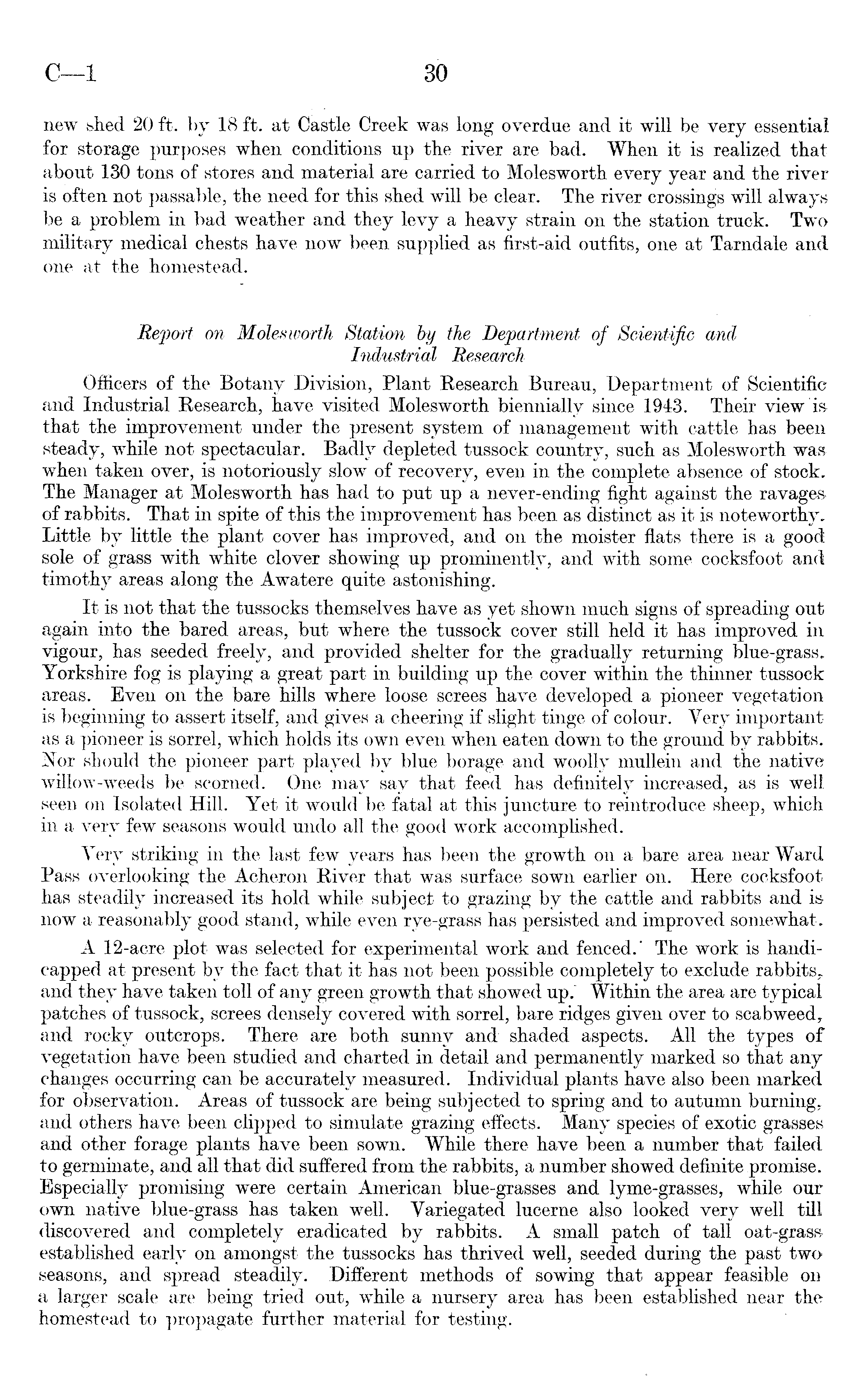 new shed 20 ft. by 18 ft. at Castle Creek was long overdue and it will be very essential for storage purposes when conditions up the river are bad. When it is realized that about 130 tons of stores and material are carried to Molesworth every year and the river is often not passable, the need for this shed will be clear. The river crossings will always be a problem in bad weather and they levy a heavy strain on the station truck. Two military medical chests have now been supplied as first-aid outfits, one at Tarndale and one at the homestead. Report on Molesworth Station by the Department of Scientific and Industrial Research Officers of the Botany Division, Plant Research Bureau, Department of Scientific and Industrial Research, have visited Molesworth biennially since 1943. Their view is that the improvement under the present "system of management with cattle has been steady, while not spectacular. Badly depleted tussock country, such as Molesworth was when taken over, is notoriously slow of recovery, even in the complete absence of stock. The Manager at Molesworth has had to put up a never-ending fight against the ravages of rabbits. That in spite of this the improvement has been as distinct as it is noteworthy. Little by little the plant cover has improved, and on the moister flats there is a good sole of grass with white clover showing up prominently, and with some cocksfoot and timothy areas along the Awatere quite astonishing. It is not that the tussocks themselves have as yet shown much signs of spreading out again into the bared areas, but where the tussock cover still held it has improved in vigour, has seeded freely, and provided shelter for the gradually returning blue-grass. Yorkshire fog is playing a great part in building up the cover within the thinner tussock areas. Even on the bare hills where loose screes have developed a pioneer vegetation is beginning to assert itself, and gives a cheering if slight tinge of colour. Very important as a pioneer is sorrel, which holds its own even when eaten down to the ground by rabbits. Nor should the pioneer part played by blue borage and woolly mullein and the native willow-weeds be scorned. One may say that feed has definitely increased, as is well seen on Isolated Hill. Yet it would be fatal at this juncture to reintroduce sheep, which in a very few seasons would undo all the good work accomplished. Yery striking in the last few years has been the growth on a bare area near Ward Pass overlooking the Acheron River that was surface sown earlier on. Here cocksfoot has steadily increased its hold while subject to grazing by the cattle and rabbits and is now a reasonably good stand, while even rye-grass has persisted and improved somewhat. A 12-acre plot was selected for experimental work and fenced." The work is handicapped at present by the fact that it has not been possible completely to exclude rabbits, and they have taken toll of any green growth that showed up." Within the area are typical patches of tussock, screes densely covered with sorrel, bare ridges given over to scabweed, and rocky outcrops. There are both sunny and shaded aspects. All the types of vegetation have been studied and charted in detail and permanently marked so that any changes occurring can be accurately measured. Individual plants have also been marked for observation. Areas of tussock are being subjected to spring and to autumn burning, and others have been clipped to simulate grazing effects. Many species of exotic grasses and other forage plants have been sown. While there have been a number that failed to germinate, and all that did suffered from the rabbits, a number showed definite promise. Especially promising were certain American blue-grasses and lyme-grasses, while our own native blue-grass has taken well. Yariegated lucerne also looked very well till discovered and completely eradicated by rabbits. A small patch of tall oat-grass established early on amongst the tussocks has thrived well, seeded during the past two seasons, and spread steadily. Different methods of sowing that appear feasible on a larger scale are being tried out, while a nursery area has been established near the homestead to propagate further material for testing.