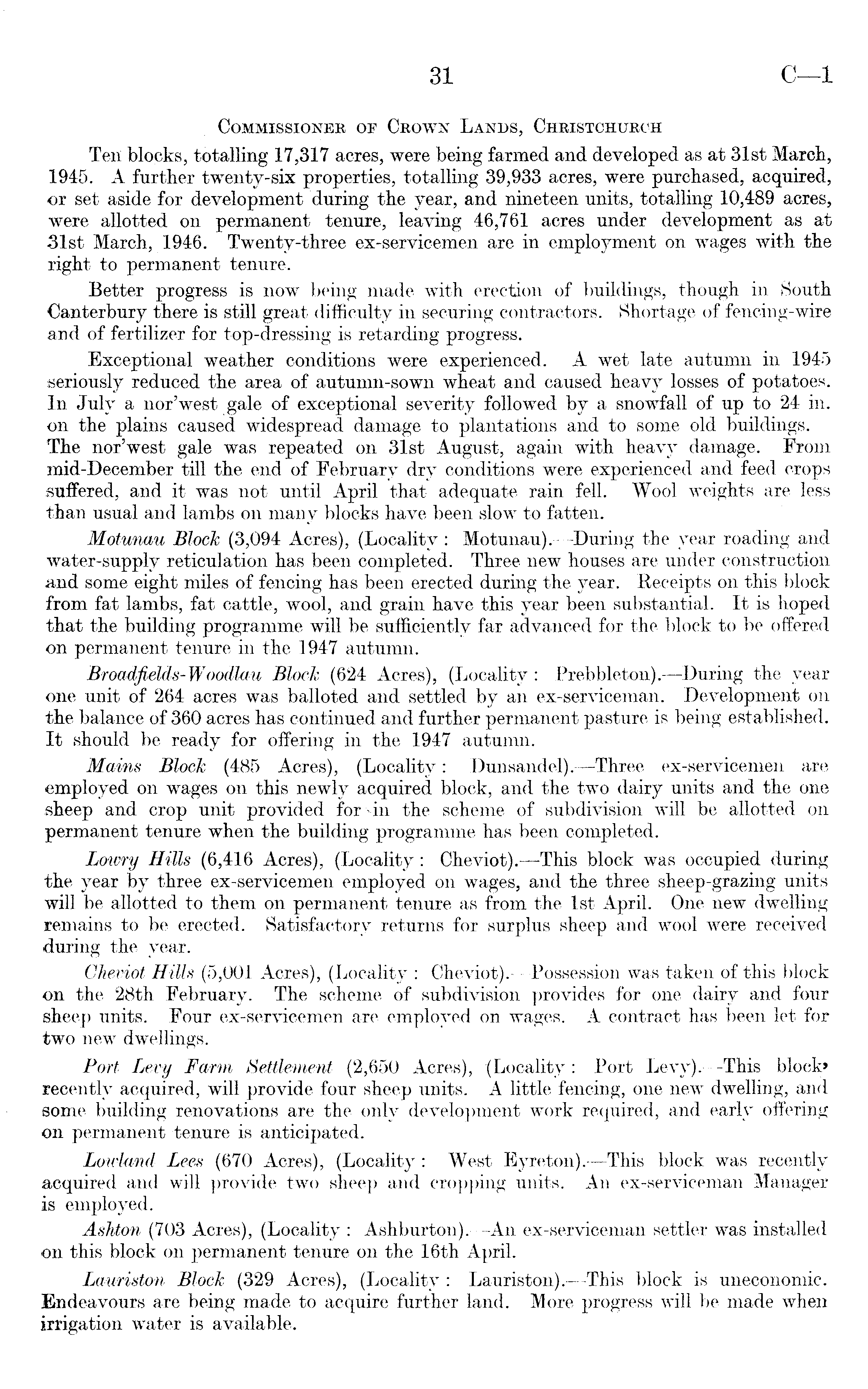 Commissioner of Crown Lands, Christchurch Ten blocks, totalling 17,317 acres, were being farmed and developed as at 31st March, 1945. A further twenty-six properties, totalling 39,933 acres, were purchased, acquired, or set aside for development during the year, and nineteen units, totalling 10,489 acres, were allotted on permanent tenure, leaving 46,761 acres under development as at 31st March, 1946. Twenty-three ex-servicemen are in employment on wages with the right to permanent tenure. Better progress is now being made with erection of buildings, though in South Canterbury there is still great difficulty in securing contractors. Shortage of fencing-wire and of fertilizer for top-dressing is retarding progress. Exceptional weather conditions were experienced. A wet late autumn in 1945 seriously reduced the area of autumn-sown wheat and caused heavy losses of potatoes. In July a nor'west gale of exceptional severity followed by a snowfall of up to 24 in. on the plains caused widespread damage to plantations and to some old buildings. The nor'west gale was repeated on 31st August, again with heavy damage. From mid-December till the end of February dry conditions were experienced and feed crops suffered, and it was not until April that adequate rain fell. Wool weights are less than usual and lambs on many blocks have been slow to fatten. Motunau Block (3,094 Acres), (Locality : Motunau). —During the year roading and Water-supply reticulation has been completed. Three new houses are under construction and some eight miles of fencing has been erected during the year. Receipts on this block from fat lambs, fat cattle, wool, and grain have this year been substantial. It is hoped that the building programme will be sufficiently far advanced for the block to be offered on permanent tenure in the 1947 autumn. Broadfields-Woodlau Block (624 Acres), (Locality : Prebbleton). —During the year one unit of 264 acres was balloted and settled by an ex-serviceman. Development on the .balance of 360 acres has continued and further permanent pasture is being established. It should be ready for offering in the 1947 autumn. Mains Block (485 Acres), (Locality: Dunsandel). —Three ex-servicemen are employed on wages on this newly acquired block, and the two dairy units and the one sheep and crop unit provided for in the scheme of subdivision will be allotted on permanent tenure when the building programme has been completed. Lowry Hills (6,416 Acres), (Locality : Cheviot).—This block was occupied during the year by three ex-servicemen employed on wages, and the three sheep-grazing units will be allotted to them on permanent tenure as from the Ist April. One new dwelling remains to be erected. Satisfactory returns for surplus sheep and wool were received during the year. Cheviot Hills (5,001 Acres), (Locality : Cheviot). —Possession was taken of this block on the 28th February. The scheme of subdivision provides for one dairy and four sheep units. Four ex-servicemen are employed on wages. A contract has been let for two new dwellings. Port Levy Farm Settlement (2,650 Acres), (Locality : Port Levy).—This block» recently acquired, will provide four sheep units. A little fencing, one new dwelling, and some building renovations are the only development work required, and early offering on permanent-tenure is anticipated. Lowland Lees (670 Acres), (Locality : West Eyreton) —This block was recently acquired and will provide two sheep and cropping units. An ex-serviceman Manager is employed. Ashton (703 Acres), (Locality : Ashburton). —An ex-serviceman settler was installed on this block on permanent tenure on the 16th April. Lauristpn Block (329 Acres), (Locality : Lauriston). —This block is uneconomic. Endeavours are being made to acquire further land. More progress will be made when irrigation water is available.