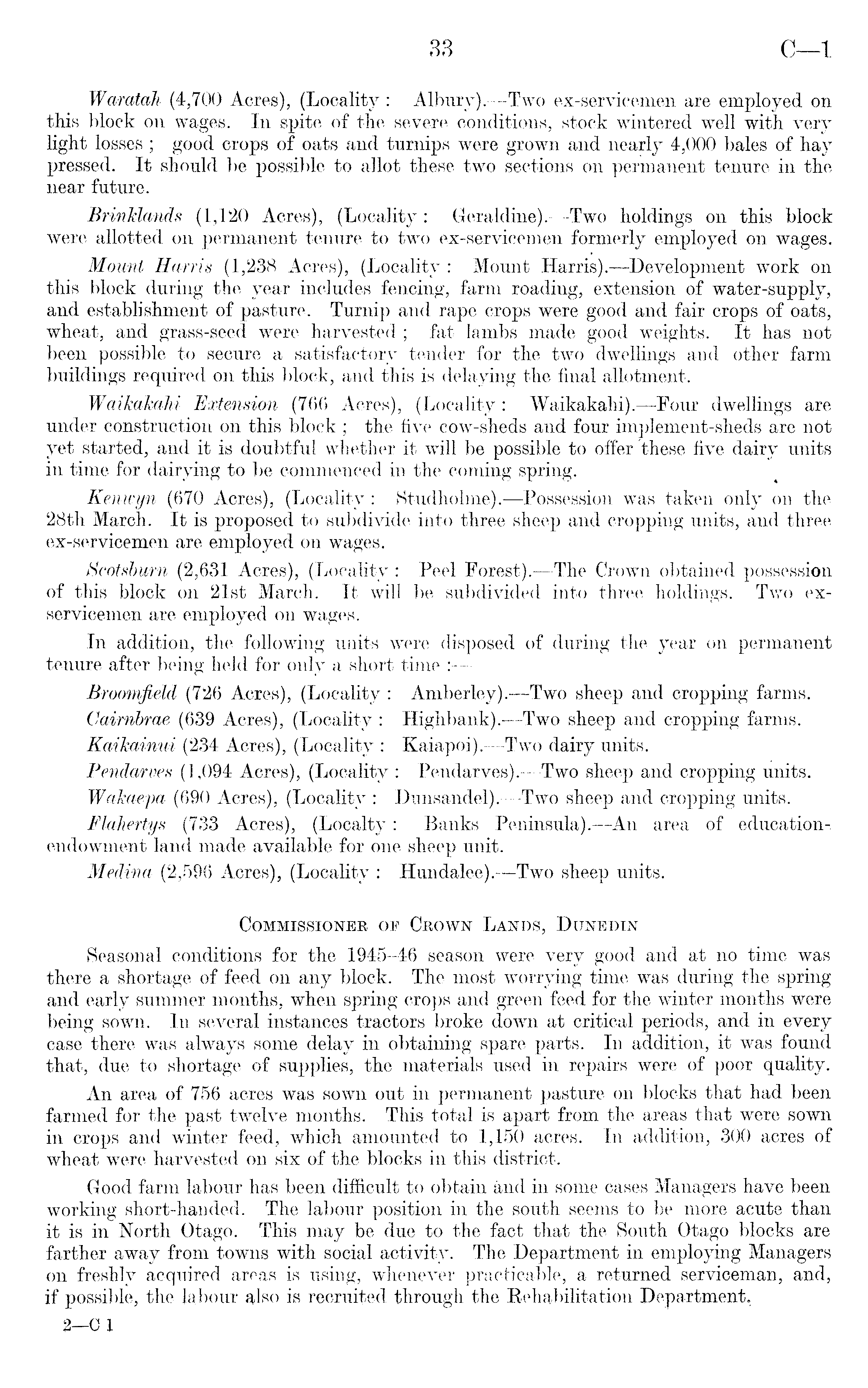 Waratah (4,700 Acres), (Locality : Albury). —Two ex-servicemen are employed on this block on-wages. In spite of the severe conditions, stock wintered well with very light losses ; good crops of oats and turnips were grown and nearly 4,000 bales of hay pressed. It should be possible to allot these two sections on permanent tenure in the near future. Brinklands (1,120 Acres), (Locality : Geraldine). —Two holdings on this block were allotted on permanent tenure to two ex-servicemen formerly employed on wages. Mount Harris (1,238 Acres), (Locality : Mount Harris). —Development work on this block during the year includes fencing, farm roading, extension of water-supply, and establishment of pasture. Turnip and rape crops were good and fair crops of oats, wheat, and grass-seed were harvested ; fat lambs made good weights. It has not been possible to secure a satisfactory tender for the two dwellings and other farm buildings required on this block, and this is delaying the final allotment. Waikakahi Extension (766 Acres), (Locality : Waikakahi). —Four dwellings are under construction on this block ; the five cow-sheds and four implement-sheds are not yet. started, and it is doubtful whether it will be possible to offer these five dairy units in time for dairying to be commenced in the coming spring. Kenwyn (670 Acres), (Locality : Studholme).—Possession was taken only on the 28th March. It is proposed to subdivide into three sheep and cropping units, and three ex-servicemen are employed on wages. Scotsburn (2,631 Acres), (Locality : Peel Forest). —The Crown obtained possession of this block on 21st March. It will be subdivided into three holdings. Two exservicemen are employed on wages. In addition, the following units were disposed of during the year on permanent tenure after being held for only a short time : Broomfield (726 Acres), (Locality : Amberley).—Two sheep and cropping farms. Cairnbrae (639 Acres), (Locality : Highbank).—Two sheep and cropping farms. Kaikainui (234 Acres), (Locality : Kaiapoi).—Two dairy units. Pendarves (1,094 Acres), (Locality : Pendarves). —Two sheep and cropping units. WaJeaepa (690 Acres), (Locality : Dunsandel). —Two sheep and cropping units. Flahertys (733 Acres), (Localty: Banks Peninsula). —An area of educationendowment land made available for one sheep unit. Medina (2,596 Acres), (Locality : Hundalee). —Two sheep units. Commissioner of Crown Lands, Dunedin Seasonal conditions for the 1945-46 season were very good and at no time was there a shortage of feed on any block. The most worrying time was during the spring and early summer months, when spring crops and green feed for the winter months were being sown. In several instances tractors broke down at critical periods, and in every case there was always some delay in obtaining spare parts. In addition, it was found that, due to shortage of supplies, the materials used in repairs were of poor quality. An area of 756 acres was sown out in permanent pasture on blocks that had been farmed for the past twelve months. This total is apart from the areas that were sown in crops and winter feed, which amounted to 1,150 acres. In addition, 300 acres of wheat were harvested on six of the blocks in this district. Good farm labour has been difficult to obtain and in some cases Managers have been working short-handed. The labour position in the south seems to be more acute than it is in North Otago. This may be due to the fact that the South Otago blocks are farther away from towns with social activity. The Department in employing Managers on freshly acquired areas is using, whenever practicable, a returned serviceman, and, if possible, the labour also is recruited through the Rehabilitation Department, 2 —C X