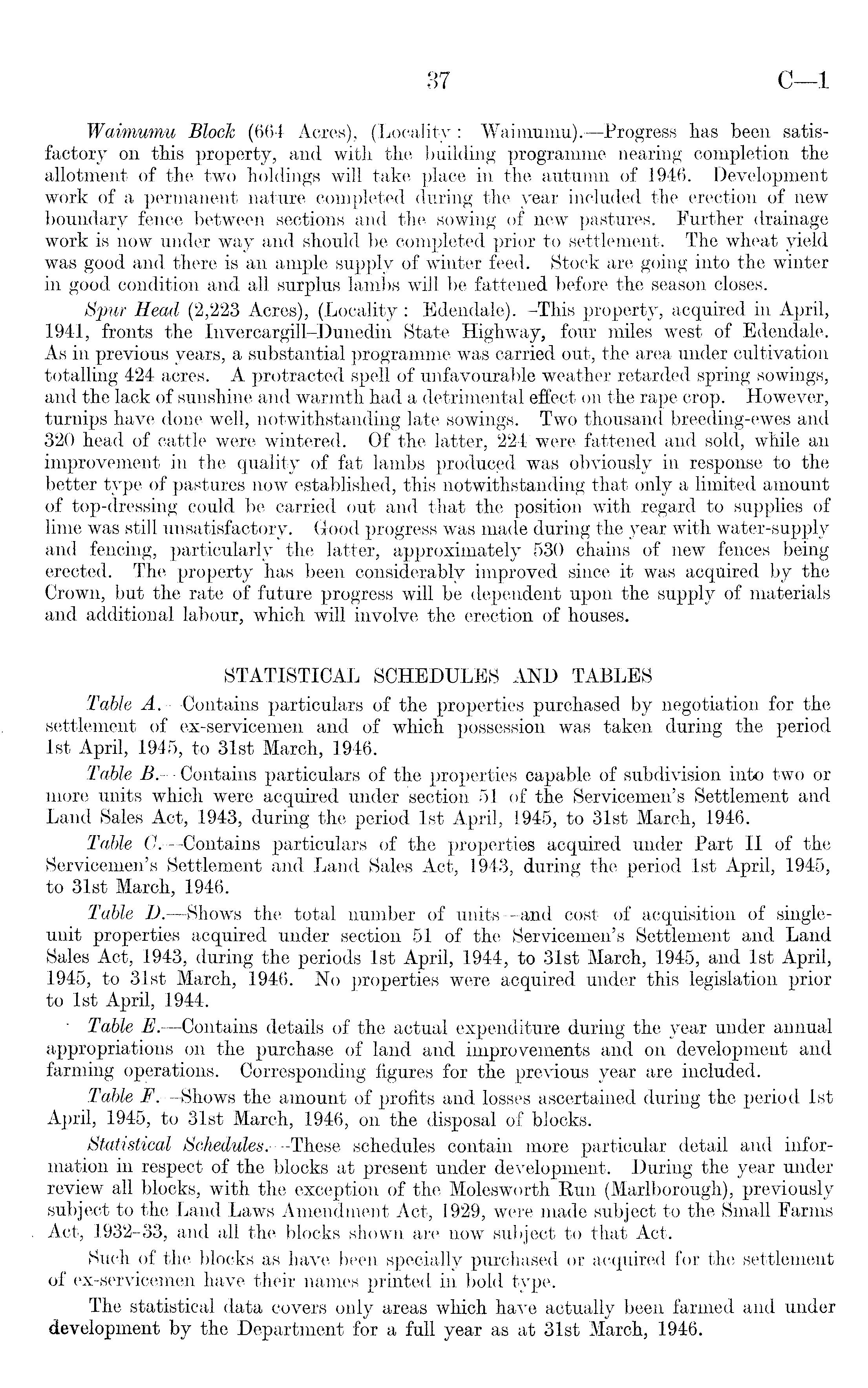 Waimumu Block (664 Acres), (Locality : Waimumu). —Progress lias been satisfactory on this property, and with the building programme nearing completion the allotment of the two holdings will take place in the autumn of 1946. Development work of a permanent nature completed during the year included the erection of new boundary fence between sections and the sowing of new pastures. Further drainage work is now under way and should be completed prior to settlement. The wheat yield was good and there is an ample supply of winter feed. Stock are going into the winter in good condition and all surplus lambs will be fattened before the season closes. Spur Head (2,223 Acres), (Locality : Edendale). —-This property, acquired in April, 1941, fronts the Invercargill-Dunedin State Highway, four miles west of Edendale. As in previous years, a substantial programme was carried out, the area under cultivation totalling 424 acres. A protracted spell of unfavourable weather retarded spring sowings, and the lack of sunshine arid warmth had a detrimental effect on the rape crop. However, turnips have done well, notwithstanding late sowings. Two thousand breeding-ewes and 320 head of cattle were wintered. Of the latter, 224 were fattened and sold, while an improvement in the quality of fat lambs produced was obviously in response to the better type of pastures now established, this notwithstanding that only a limited amount of top-dressing could be carried out and that the position with regard to supplies of lime was still unsatisfactory. Good progress was made during the year with water-supply and fencing, particularly the latter, approximately 530 chains of new fences being erected. The property has been considerably improved since it was acquired by the Crown, but the rate of future progress will be dependent upon the supply of materials and additional labour, which will involve the erection of houses. STATISTICAL SCHEDULES AND TABLES Table A.—Contains particulars of the properties purchased by negotiation for the settlement of ex-servicemen and of which possession was taken during the period Ist April, 1945, to 31st March, 1946. Table B.—Contains particulars of the properties capable of subdivision into two or more units which were acquired under section 51 of the Servicemen's Settlement and Land Sales Act, 1943, during the period Ist April, 1945, to 31st March, 1946. Table C. —Contains particulars of the properties acquired under Part II of the Servicemen's Settlement and Land Sales Act, 1943, during the period Ist April, 1945, to 31st March, 1946. Table D. —Shows the total number of units—and cost of acquisition of singleunit properties acquired under section 51 of the Servicemen's Settlement and Land Sales Act, 1943, during the periods Ist April, 1944, to 31st March, 1945, and Ist April, 1945, to 31st March, 1946. No properties were acquired under this legislation prior to Ist April, 1944. ■ Table E. —Contains details of the actual expenditure during the year under annual appropriations on the purchase of land and improvements and on development and farming operations. Corresponding figures for the previous year are included. Table F. —Shows the amount of profits and losses ascertained during the period Ist April, 1945, to 31st March, 1946, on the disposal of blocks. Statistical Schedules.—These schedules contain more particular detail and information in respect of the blocks at present under development. During the year under review all blocks, with the exception of the Molesworth Run (Marlborough), previously subject to the Land Laws Amendment Act, 1929, were made subject to the Small Farms Act, 1932-33, and all the blocks shown are now subject to that Act. Such of the blocks as have been specially purchased or acquired for the settlement of ex-servicemen have their names printed in bold type. The statistical data covers only areas which have actually been farmed and under development by the Department for a full year as at 31st March, 1946.