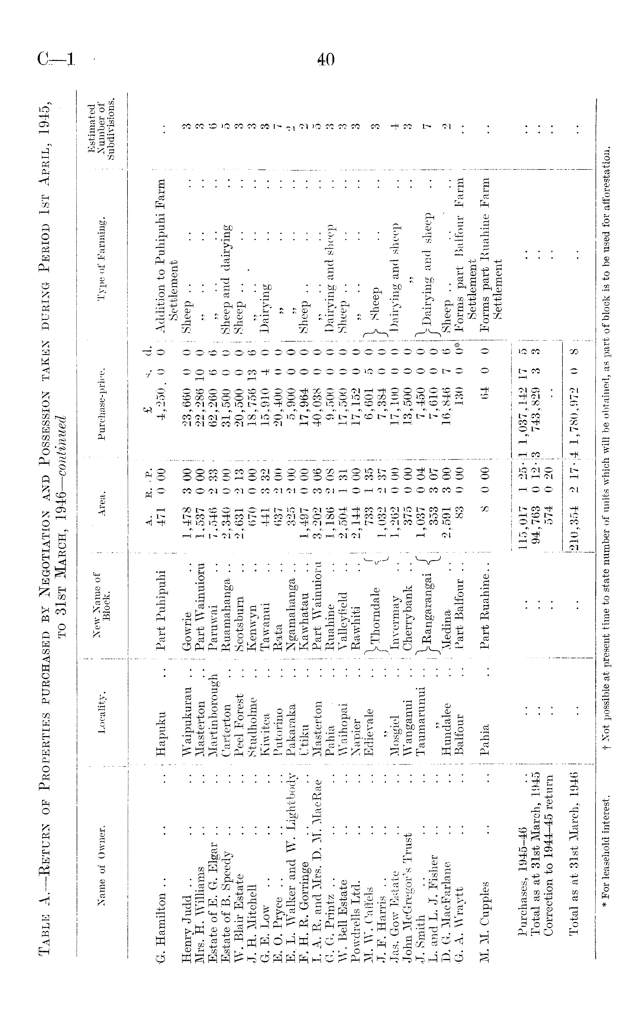 Name of Owner. Locality. New Name of Block. Area; I Purchase-price. | Type of Farming. Estimated Number of Subdivisions. G. Hamilton Hapuku Part Puhipuhi A. 471 •I R. P. 0 00 £ 4,250. s. 0 d. 0 Addition to Puhipuhi Earm Settlement Sheep Sheep and dairying Sheep Dairying Sheep Dairying and sheep Sheep .. Sheep Dairying and sheep Dairying and sheep Sheep Eorms part Balfour Farm Settlement Forms part Ruahine Farm Settlement Henry Judd 'Mrs. H. Williams Estate of E. G. Elgar Estate of B. Speedy W. Blair Estate J, H. Mitchell •G, E. Low E. 0. Pryce .. E.. L. Walker and W. Light body F. H. R. Gorringe I; A. R. and Mrs. D. M. MacRae G. G. Printz W. Bell Estate Powdrells Ltd. M. W. Caffels J. E. Harris Jas. Gow Estate John McGregor's Trust J. Smith L, and L. J. Eisher D, G. MacEarlane G. A, Wraytt M. M. Cupples Waipukurau .. Masterton Martinborough Carterton Peel Eorest . . Studholme Kiwitea Putorino Pakaraka Utiku Masterton Pahia Waihopai Napier E die vale Mosgiel Wanganui Taumarumii . . Hundalee Balfour Pahia Gowrie Part Wainuioru Paruwai Ruamahanga .. Scotsburn Kenwyn Tawanui Rata Ngamahanga .. Kawhatau Part Wainuiora Ruahine Valley field Rawhiti j> Thorndale / Invermay Cherrybank .. j= Rangarangai I Medina 1 Part Balfour .. Part Ruahine.. 1,478 1,537 7,546 2,340 2,631 670 441 637 325 1,497 3,202 1,186 2,504 2,144 733 1,032 1,262 375 1,037 353 2,591 83 8 3 00 0 00 2 33 0 00 2 13 0 00 3 32 2 00 2 00 0 00 3 06 2 08 1 31 0 00 1 35 2 37 0 00 0 00 0 04 3 07 3 00 0 00 0 00 23,660 0 22,286 10 62,260 6 31,500 0 20,500 0 18,756 13 15,910 4 20,400 0 5,900 0 17,964 0 40,038 0 9,500 0 17,500 0 17,152 0 6,601 5 7,384 0 17,100 0 13,500 0 7,450 0 7,610 0 16,846 7 130 0 64 0 0 0 6 0 0 6 0 0 0 0 0 0 0 0 0 0 0 0 0 0 6 0* 0 3 3 6 5 3 3 3 7 2 2 5 3 3 3 3 4 3 7 2 Purchases, 1945-46 Total as at 31st March, 1945 Correction to 1944-45 return 115,017 94,763 574 1 250 120 20 1 1,037,142 3 743,829 17 3 5 3 Total as at 31st March, 1946 210,354 2 174 1,780,972 0 8 * For leasehold interest. t Not possible at present time to state number of units which will be obtained, as part of block is to be used for afforestation.
