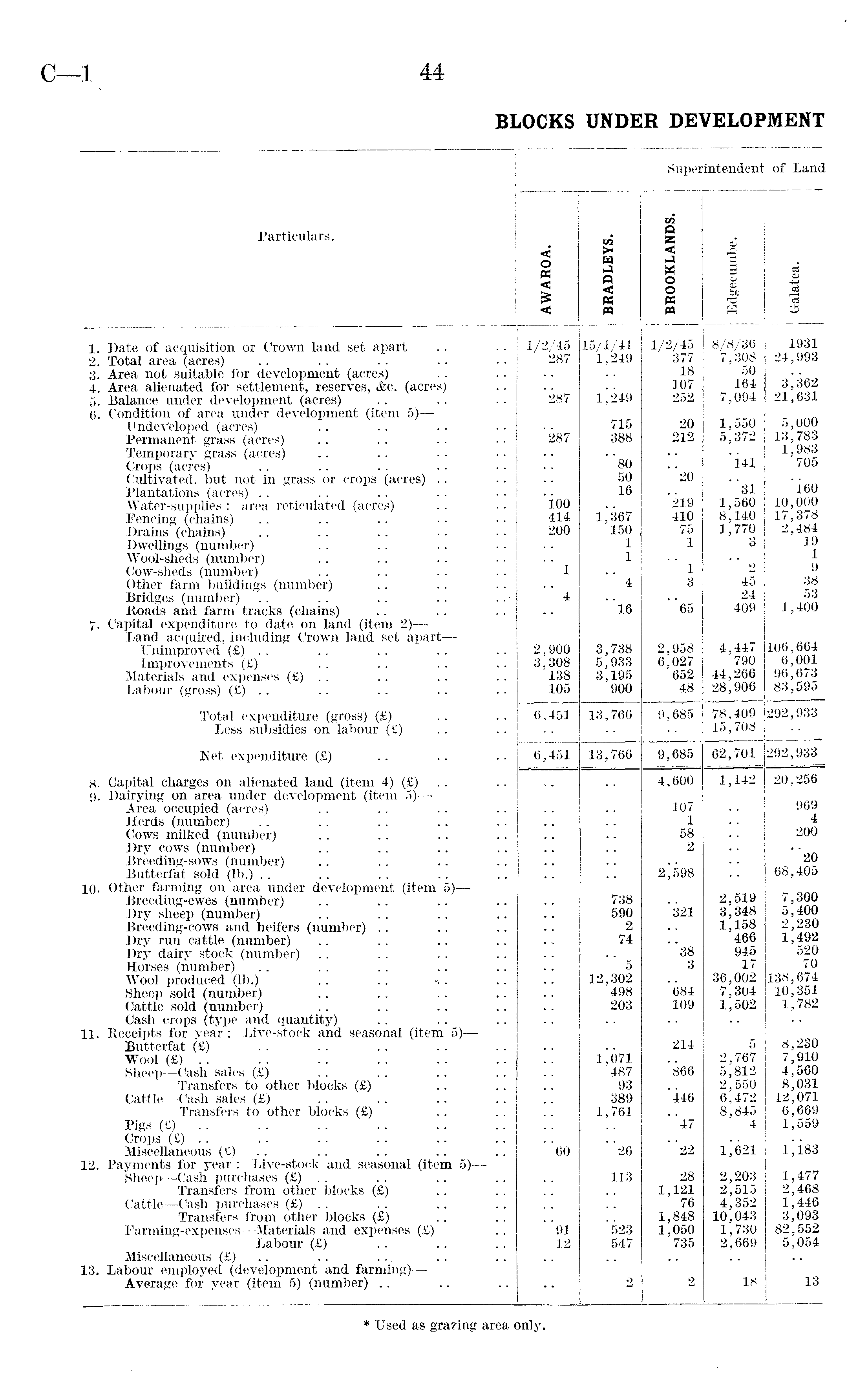 Superintendent of Land Particulars. to to O SB < t- < M o pfl W J w g § < O ■< K 0 0 PS 60 T3 03 < CP oa O 1. Date of acquisition or Crown land set apart 1/2/45 15/1/41 1/2/45 8/8/36 1931 2. Total area (acres) 287 1,249 377 7,308 24,993 3. Area not suitable for development (acres) 18 50 3 j 362 4. Area alienated for settlement, reserves, &c. (acres) 107 164 5. Balance under development (acres) *287 1,249 252 7,094 21,631 6. Condition of area under development (item 5) — 715 20 1,550 5,000 Undeveloped (acres) Permanent grass (acres) '287 388 212 5,372 13,783 1,983 705 Temporary grass (acres) ' '80 i41 Crops (acres) "20 Cultivated, but not in grass or crops (acres) 50 ' '31 'i60 Plantations (acres) 16 '219 Water-supplies : area reticulated (acres) ioo 1,560 10,000 Fencing (chains) 414 1,367 410 8,140 17,378 Drains (chains) 200 150 75 1,770 2,484 Dwellings (number) 1 1 3 19 Wool-sheds (number) 1 2 1 9 Cow-sheds (number) 1 1 Other farm buildings (number) " 4 3 45 38 53 Bridges (number) "4 "l6 "65 24 Roads and farm tracks (chains) 409 1,400 7. Capital expenditure to date on land (item 2) — Land acquired, including Crown land set apart— 2,958 106,664 Unimproved (£) .. 2,900 3,738 4,447 Improvements (£) 3,308 5,933 6,027 790 6,001 Materials and expenses (£) .. 138 3,195 652 44,266 96,673 83,595 -Labour (gross) (£) .. 105 900 48 28,906 Total expenditure (gross) (£) 6,451 13,766 9,685 78,409 292,933 Less subsidies on labour (£) 15,708 Net expenditure (£) 6,451 13,766 9,685 62,701 292,933 8. Capital charges on alienated land (item 4) (£) .. 4,600 1,142 20,256 9. Dairying on area under development (item 5) — 107 969 Area occupied (acres) Herds (number) 1 4 Cows milked (number) 58 200 Dry cows (number) 2 "20 68,405 Breeding-sows (number) 2 j 598 Butterfat sold (lb.) 10. Other farming on area under development (item 5) — 2,519 7,300 Breeding-ewes (number) 738 Dry sheep (number) 590 *321 3,348 5,400 Breeding-cows and heifers (number) 2 1,158 466 2,230 Dry run cattle (number) 74 "38 1,492 Dry dairy stock (number) 945 520 Horses (number) " 5 3 17 70 Wool produced (lb.) 12,302 36,002 138,674 Sheep sold (number) 498 '684 7,304 10,351 Cattle sold (number) 203 109 1,502 1,782 Cash crops (type and quantity) .. .. 11. Receipts for year: Live-stock and seasonal (item 5) — 8,230 Butterfat (£) 214 5 Wool (£) .. lj071 2,767 5,812 7,910 4,560 Sheep—Cash sales (£) 487 '866 Transfers to other blocks (£) 93 2,550 8,031 Cattle—Cash sales (£) 389 '446 6,472 12,071 Transfers to other blocks (£) 1,761 8,845 6,669 Pigs (£) ' '47 4 1,559 Crops (£) .. M83 Miscellaneous (&), ' '60 ' 26 ' 22 1 j 621 12. Payments for year : Live-stock and seasonal (item 5) — Sheep—Cash purchases (£) .. 113 28 2,203 1,477 Transfers from other blocks (£) 1,121 2,515 2,468 Cattle—Cash purchases (£) .. 76 4,352 1,446 Transfers from other blocks (£) 1,848 10,043 3,093 Farming-expenses—Materials and expenses (£) "91 523 1,050 735 1,730 82,552 Labour (£) 12 547 2,669 5,054 Miscellaneous (£) 13. Labour employed (development and farming)— 13 Average for year (item 5) (number) 2 2 18 * Used as grazing area only.