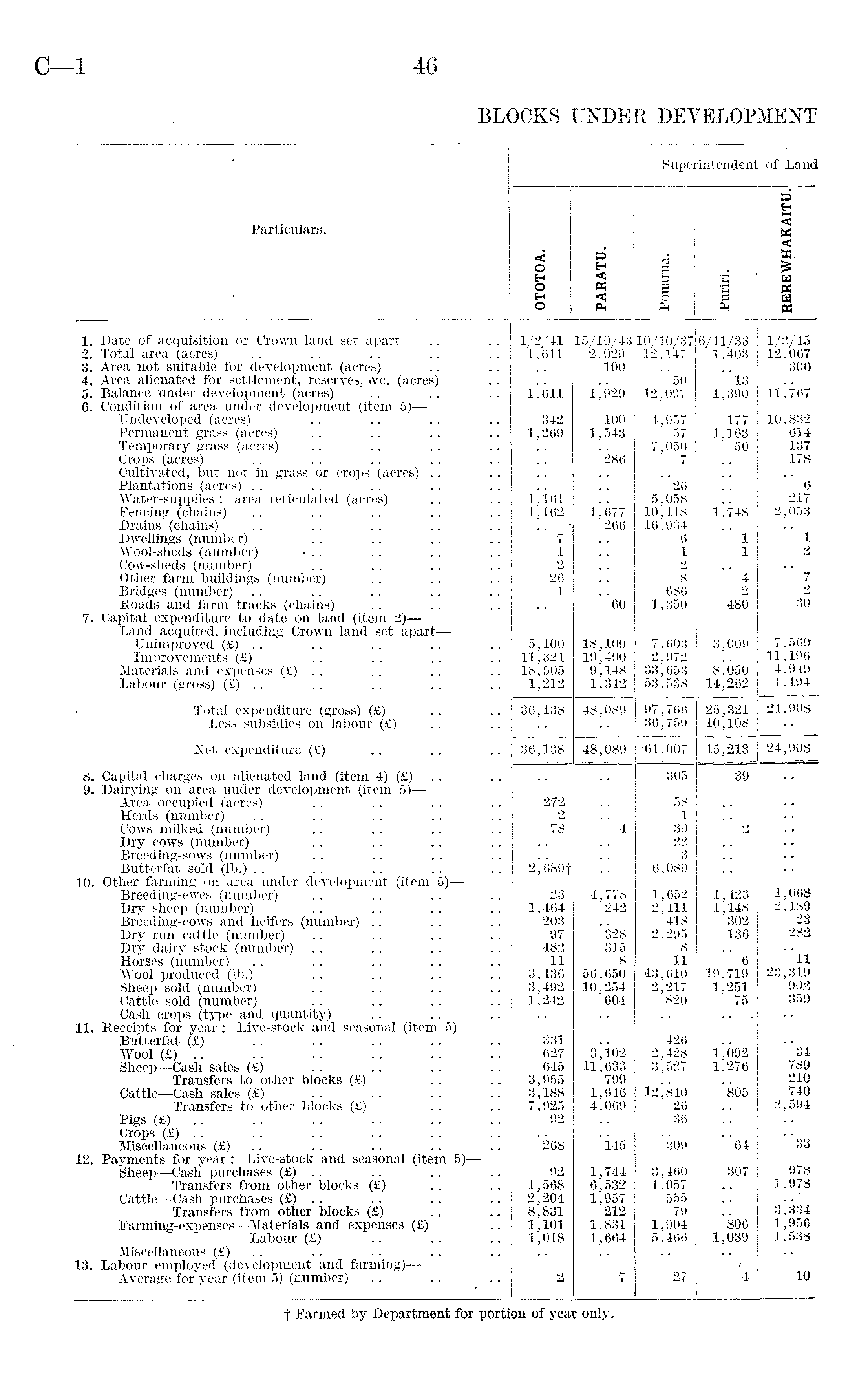 Supe] :intendent ; of Land in Particulars. H < < o H <£ <3 at & E-t O < « d ;g M w « H < O 3 a O eu P4 P4 « 1. Date of acquisition or Crown land set apart 1/2/41 15/10/43 10/10/37 6/11/33 1/2/45 2. Total area (acres) 1,611 2,029 12,147 1,403 12,067 3. Area not suitable for development (acres) 100 300 4. Area alienated for settlement, reserves, &c. (acres) "50 "l3 5. Balance under development (acres) 1 j 611 1 j 029 12,097 1,390 11^767 6. Condition of area under development (item 5) — Undeveloped (acres) 342 100 4,957 177 10,832 Permanent grass (acres) 1,269 1,543 57 1,163 614 Temporary grass (acres) 7,050 50 137 Crops (acres) "286 7 178 Cultivated, but not in grass or crops (acres) Plantations (acres) "26 6 Water-supplies : area reticulated (acres) M61 5,058 217 Fencing (chains) 1,162 1^677 10,118 lj748 2,053 Drains (chains) 266 16,934 Dwellings (number) 7 6 1 1 Wool-sheds, (number) 1 1 1 2 Cow-sheds (number) 2 2 Other farm buildings (number) 26 8 4 7 Bridges (number) .. .. .. 1 686 2 2 Boads and farm tracks (chains) "60 1,350 480 30 7. Capital expenditure to date on land (item 2) — Land acquired, including Crown land set apart— 7,569 Unimproved (£) .. 5,100 18,109 7,603 3,009 Improvements (£) .. .. 11,321 19,490 2,972 11,196 Materials and expenses (£) .. 18,505 9-, 148 33,653 8] 050 4,949 Labour (gross) (£) .. 1,212 1,342 53,538 14,262 1,194 Total expenditure (gross) (£) 36,138 48,089 97,766 25,321 24,908 Less subsidies on labour (£) 36,759 10,108 Net expenditure (£) 36,138 ■48,089 -61,007 15,213 24,908 8. Capital charges on alienated land (item 4) (£) .. 305 39 9. Dairying on area under development (item 5) — Area occupied (acres) 272 58 Herds (number) 2 1 Cows milked (number) 78 4 39 2 Dry cows (number) 22 Breeding-sows (number) 3 Butterfat sold (lb.) 2^689t 6,089 10. Other farming on area under development (item 5) — 1,068 Breeding-ewes (number) 23 4,778 1,652 1,423 Dry sheep (number) 1,464 242 2,411 1,148 2,189 Breeding-cows and heifers (number) 203 418 302 23 Dry run cattle (number) 97 328 2,295 136 282 Dry dairy stock (number) 482 315 8 "ll Horses (number) 11 8 11 6 Wool produced (lb.) 3,436 56,650 43,610 19,719 23,319 Sheep sold (number) 3,492 10,254 2,217 1,251 902 Cattle sold (number) 1,242 604 820 75 359 Cash crops (type and quantity) 11. Receipts for year: Live-stock and seasonal (item 5) — Butterfat (£) 331 426 Wool (£) .. 627 3 jio2 2,428 1 jo92 '*34 Sheep—Cash sales (£) 645 11,633 3,527 1,276 789 Transfers to other blocks (£) 3,955 799 12j 840 210 Cattle—Cash sales (£) 3,188 1,946 '805 740 Transfers to other blocks (£) 7,925 4,069 26 2,594 Pigs (£) 92 36 Crops (£) .. "33 Miscellaneous (£) 268 "i45 309 "64 12. Payments for year : Live-stock and seasonal (item 5) — Sheep—Cash purchases (£) .. 92 1,744 3,460 307 978 Transfers from other blocks (£) 1,568 6,532 1,057 1,978 Cattle —Cash purchases (£) .. 2,204 1,957 555 3,334 Transfers from other blocks (£) 8,831 212 79 Farming-expenses—Materials and expenses (£) 1,101 1,831 1,904 *806 1,956 Labour (£) 1,018 1,664 5,466 1,039 1,538 Miscellaneous (£) 13. Labour employed (development and farming)— > 10 Average for year (item 5) (number) .. .. .. 2 7 27 4 t Farmed by Department for portion of year only.